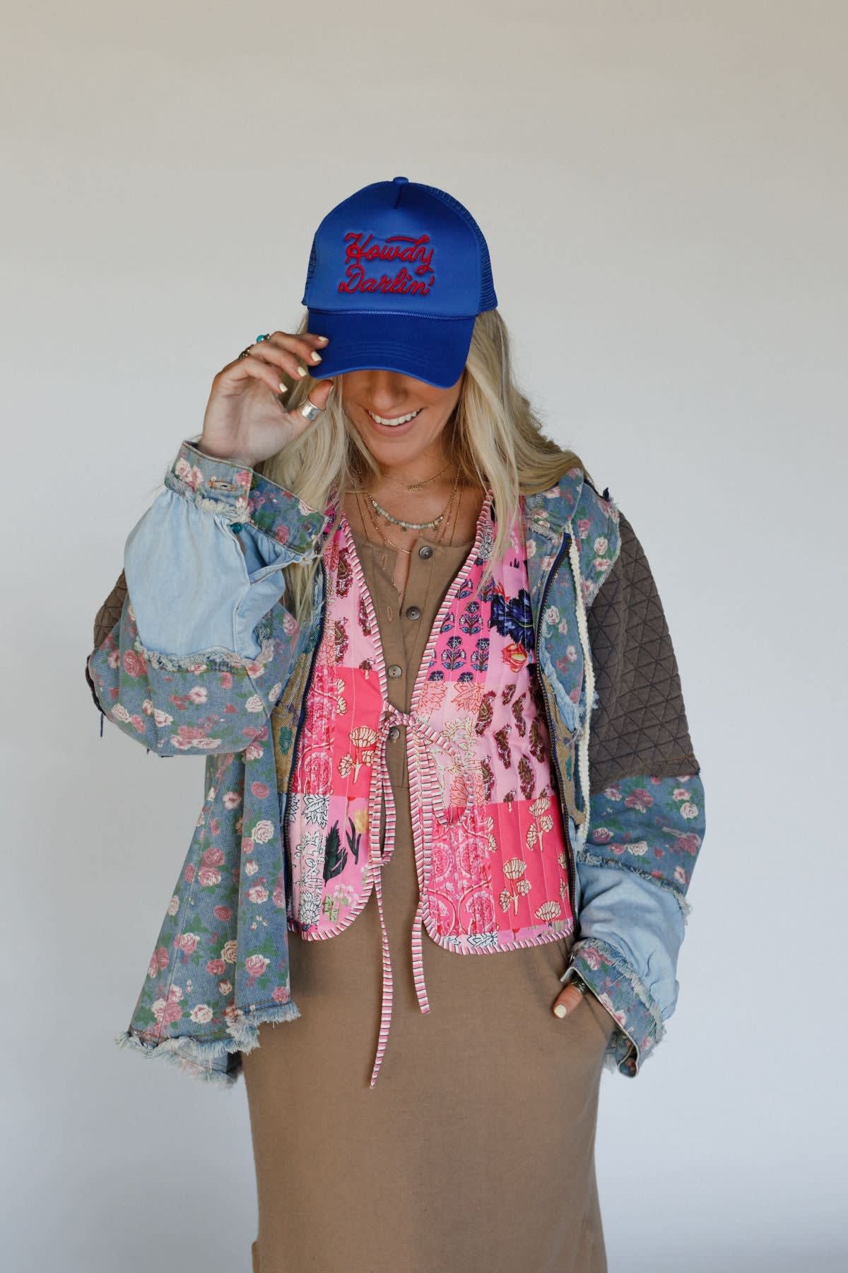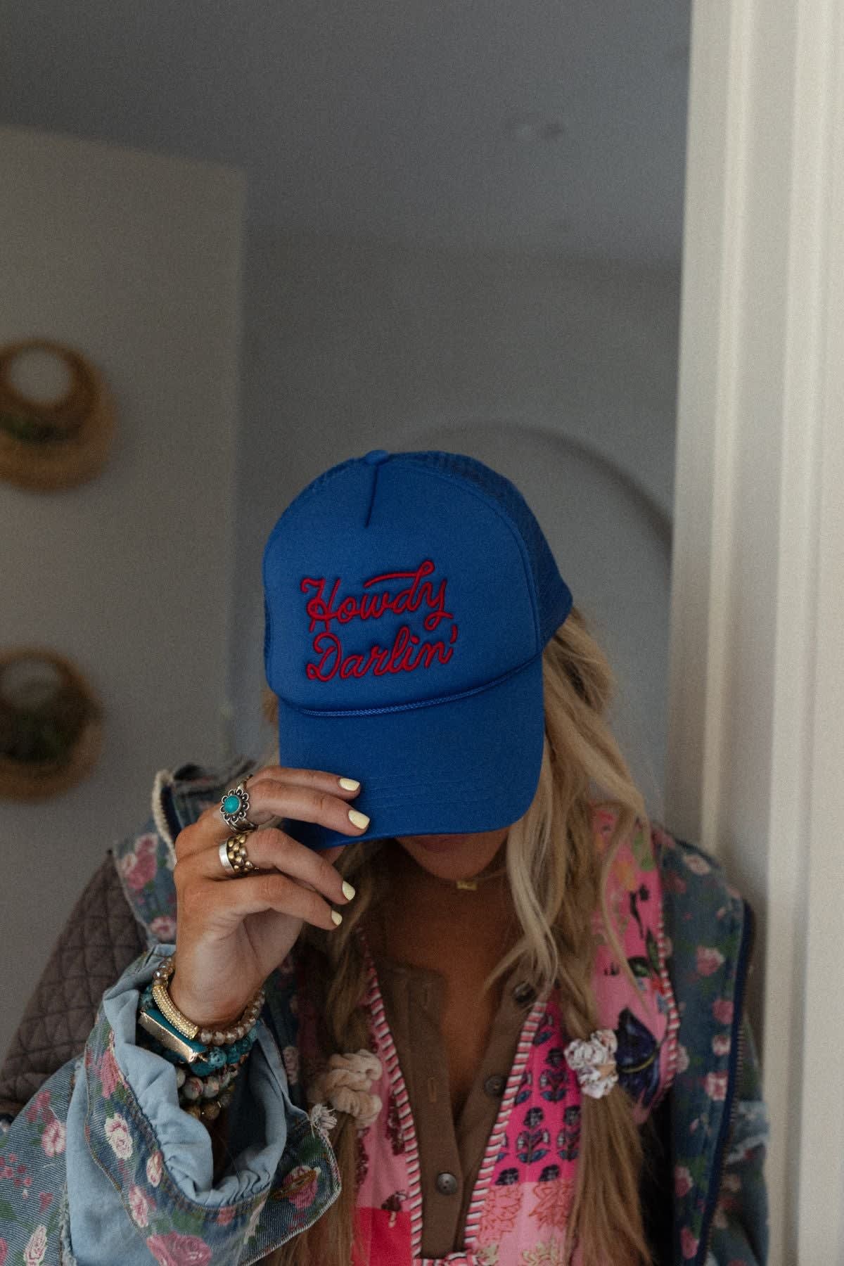 Keep on truckin’ in the Howdy Darlin blue trucker hat. This flirty little accessory is right at home with any tee and jeans look.