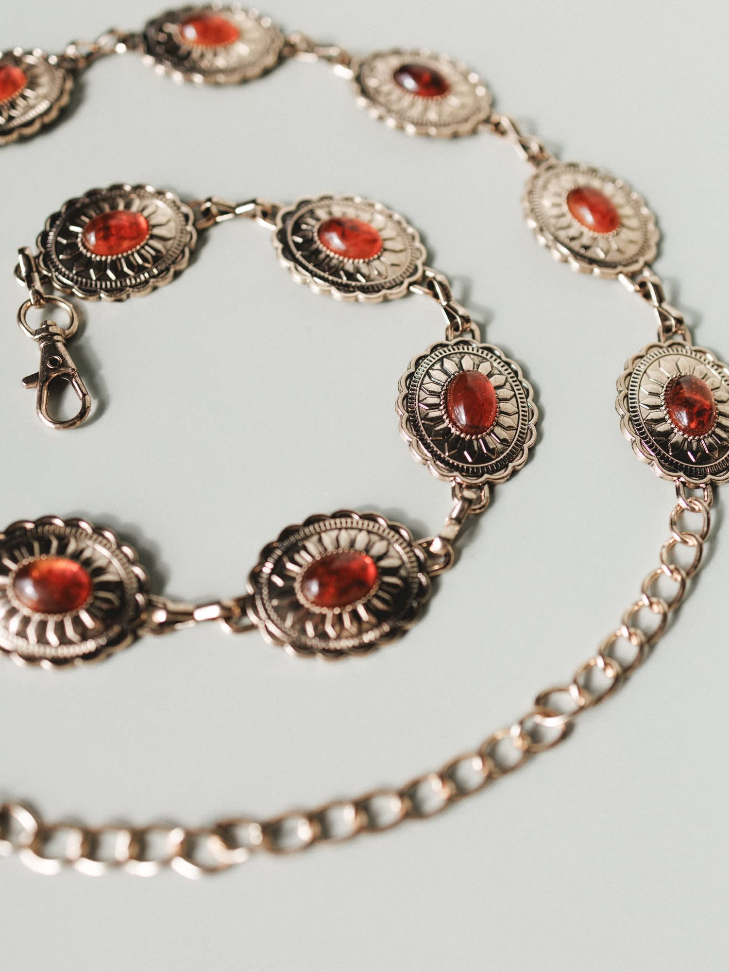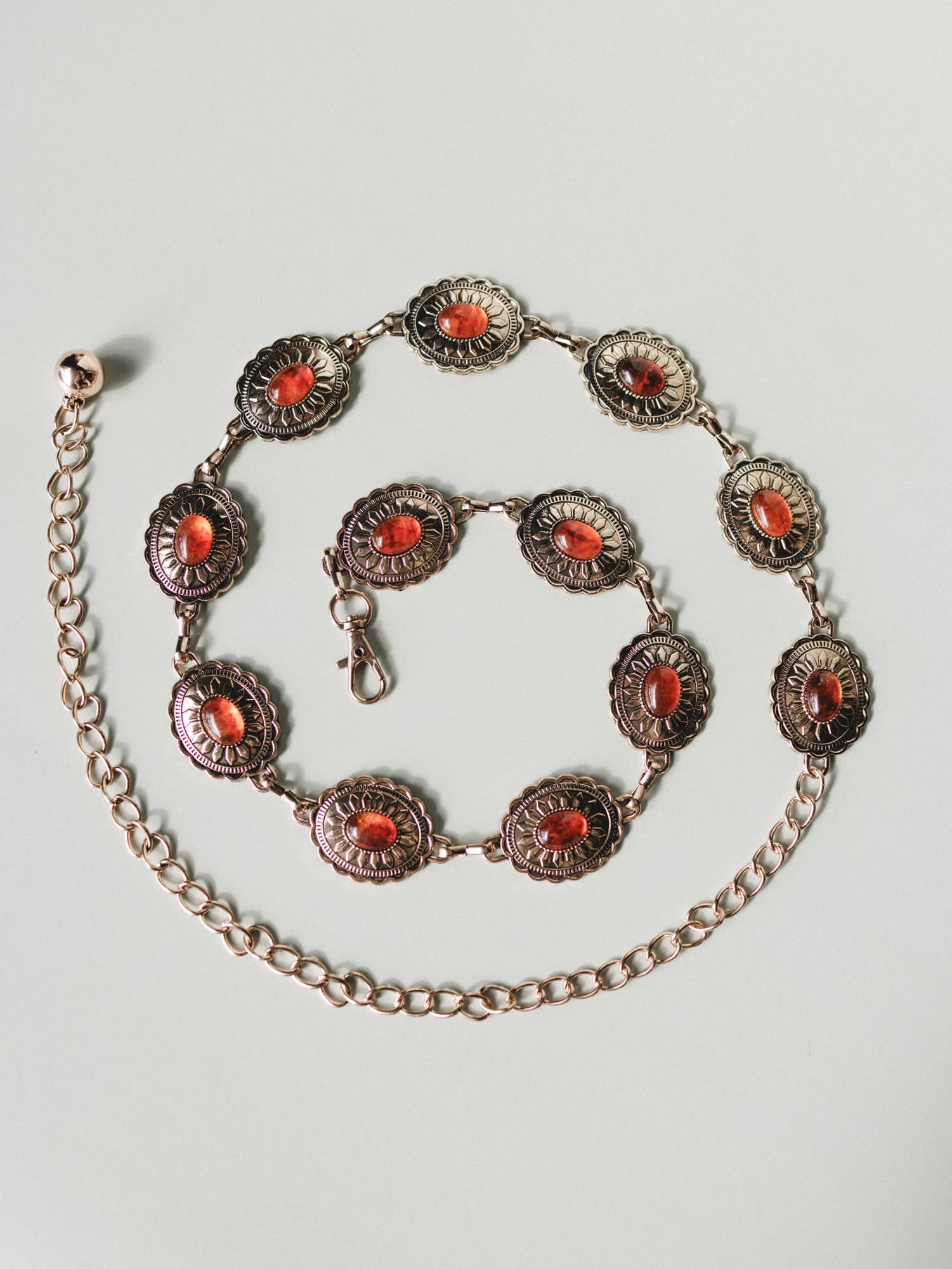 Antique gold-tone concho belt with warm rust stone accents for a classic western boho look