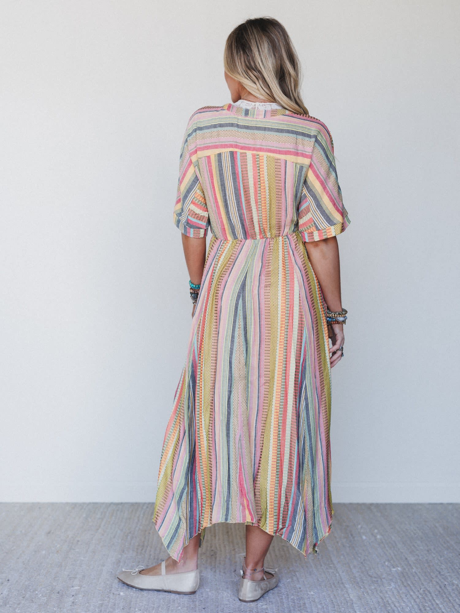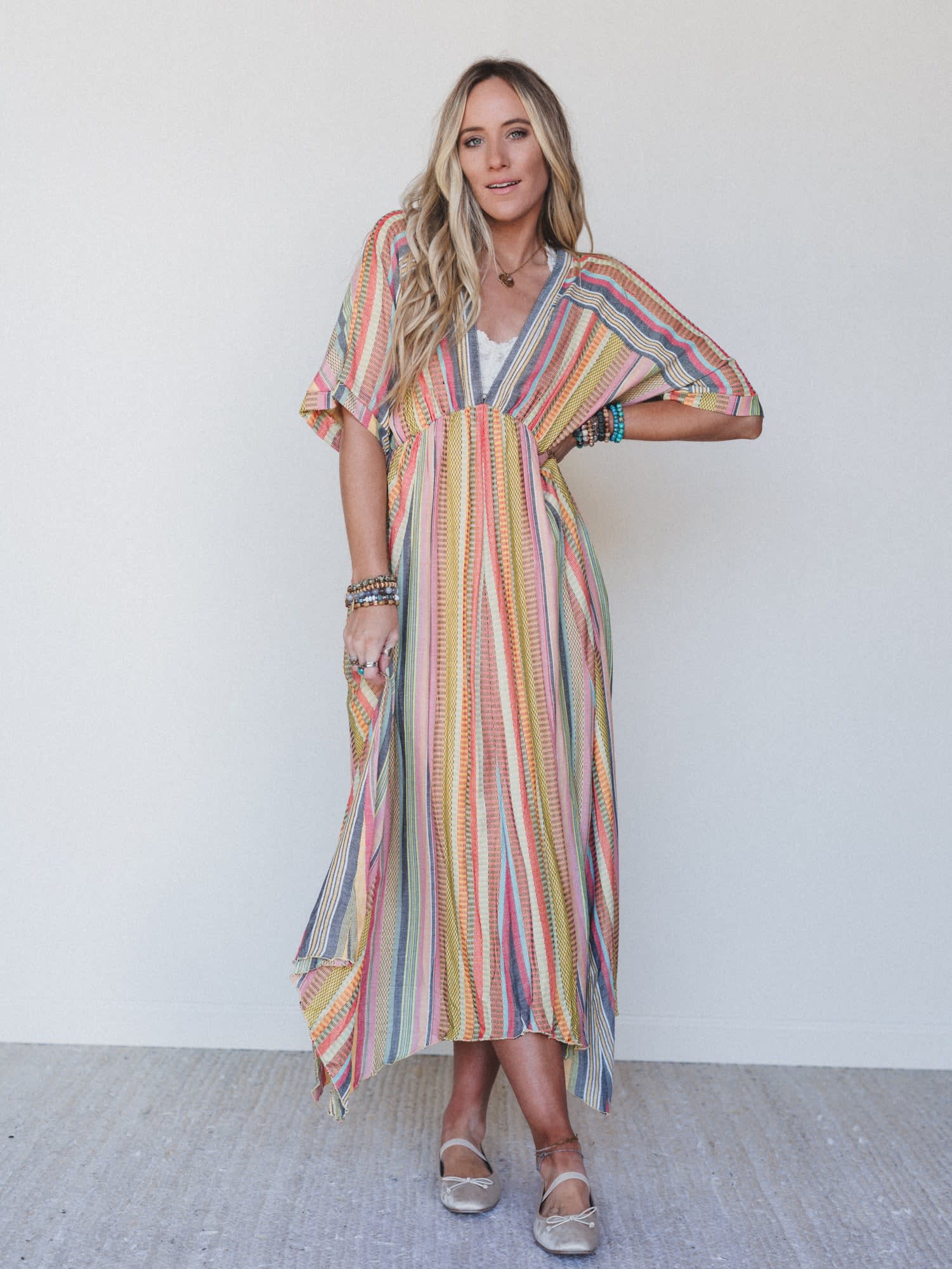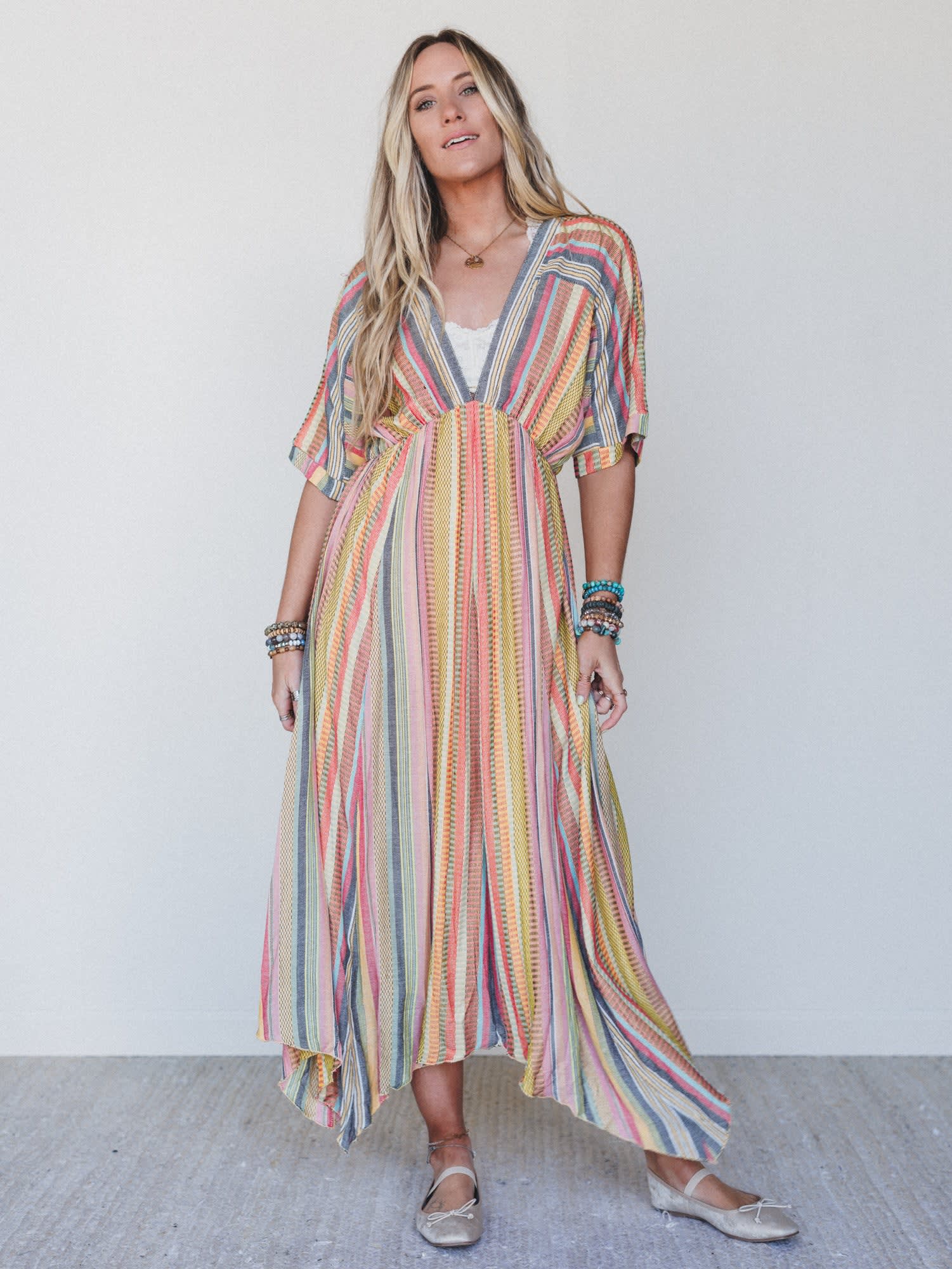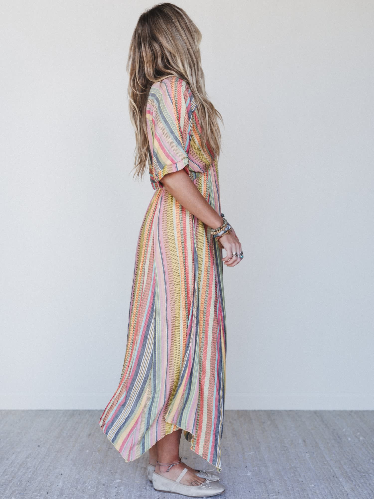 Breeze through sun-drenched days and golden hour strolls in the Island Tan V Neck Maxi Dress — a colorful celebration of carefree living. With its flowing silhouette and vibrant stripes, this dreamy dress is made for barefoot beach walks, farmer's markets, and everything in between.