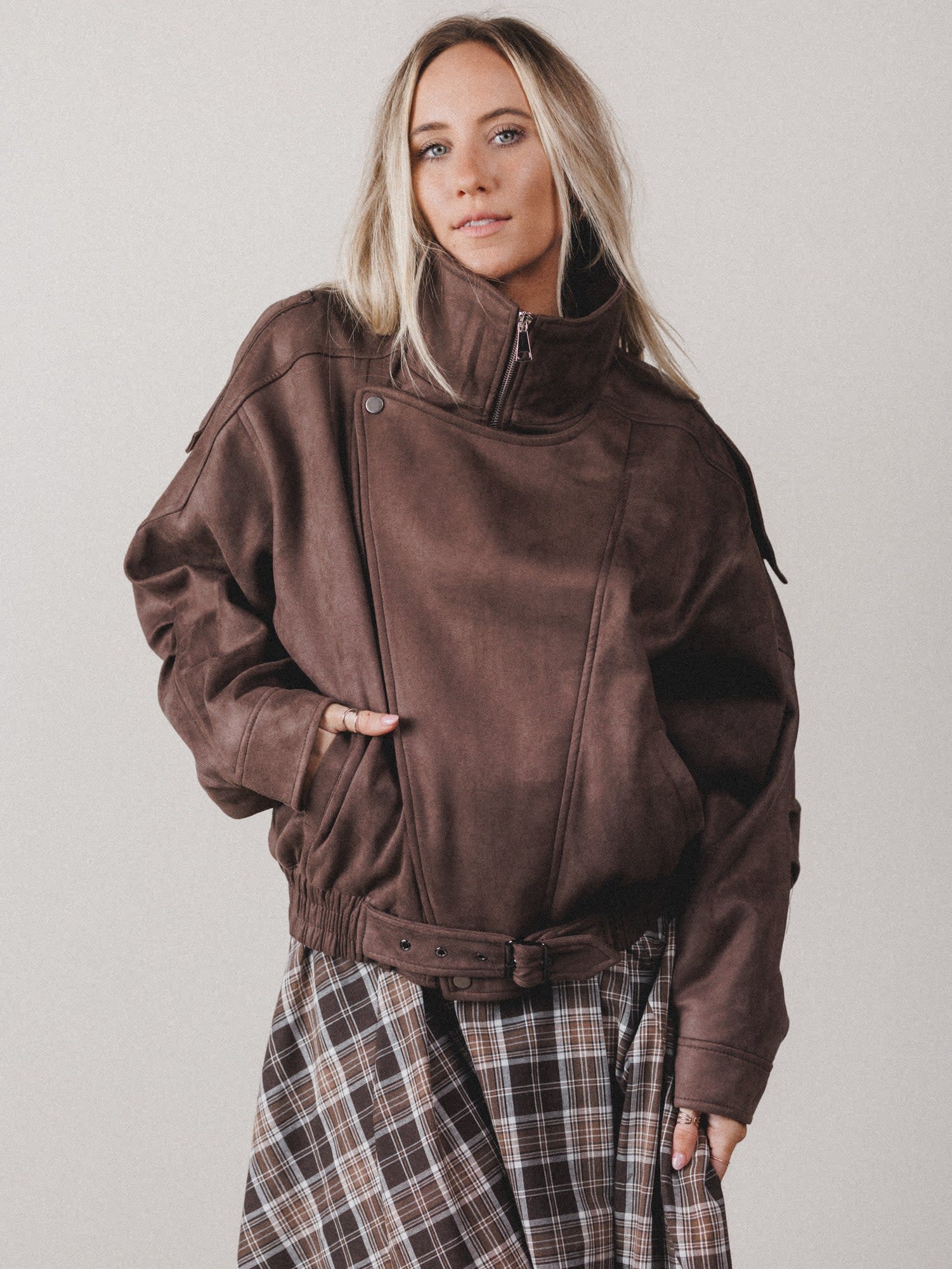 Edgy meets earthy in the James Moto Jacket—your new go-to outer layer for adding instant cool to any outfit. With its rich chocolate brown hue and oversized silhouette, this biker-inspired piece softens up tough-girl vibes with a cozy, luxe feel.