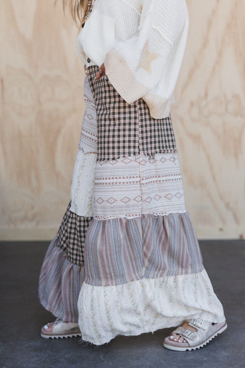 This patchwork maxi skirt features rich earth tones and neutrals, making it easy to pair with a bright cardigan.