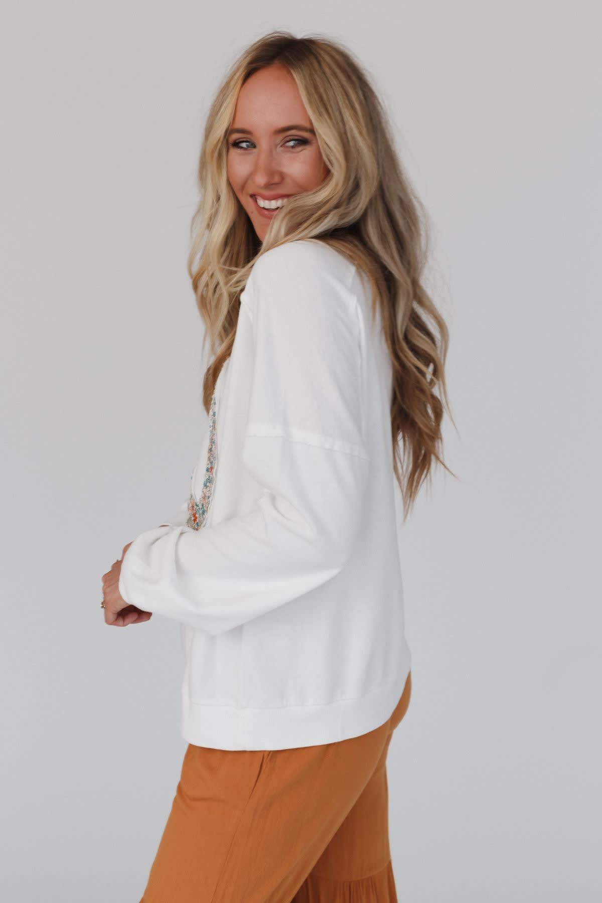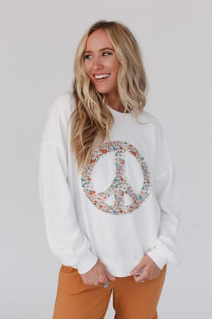 Embrace peace, love, and boho in the Jenny Floral Peace Sign Pullover Top - effortlessly cool and relaxed, perfect for all day comfort!