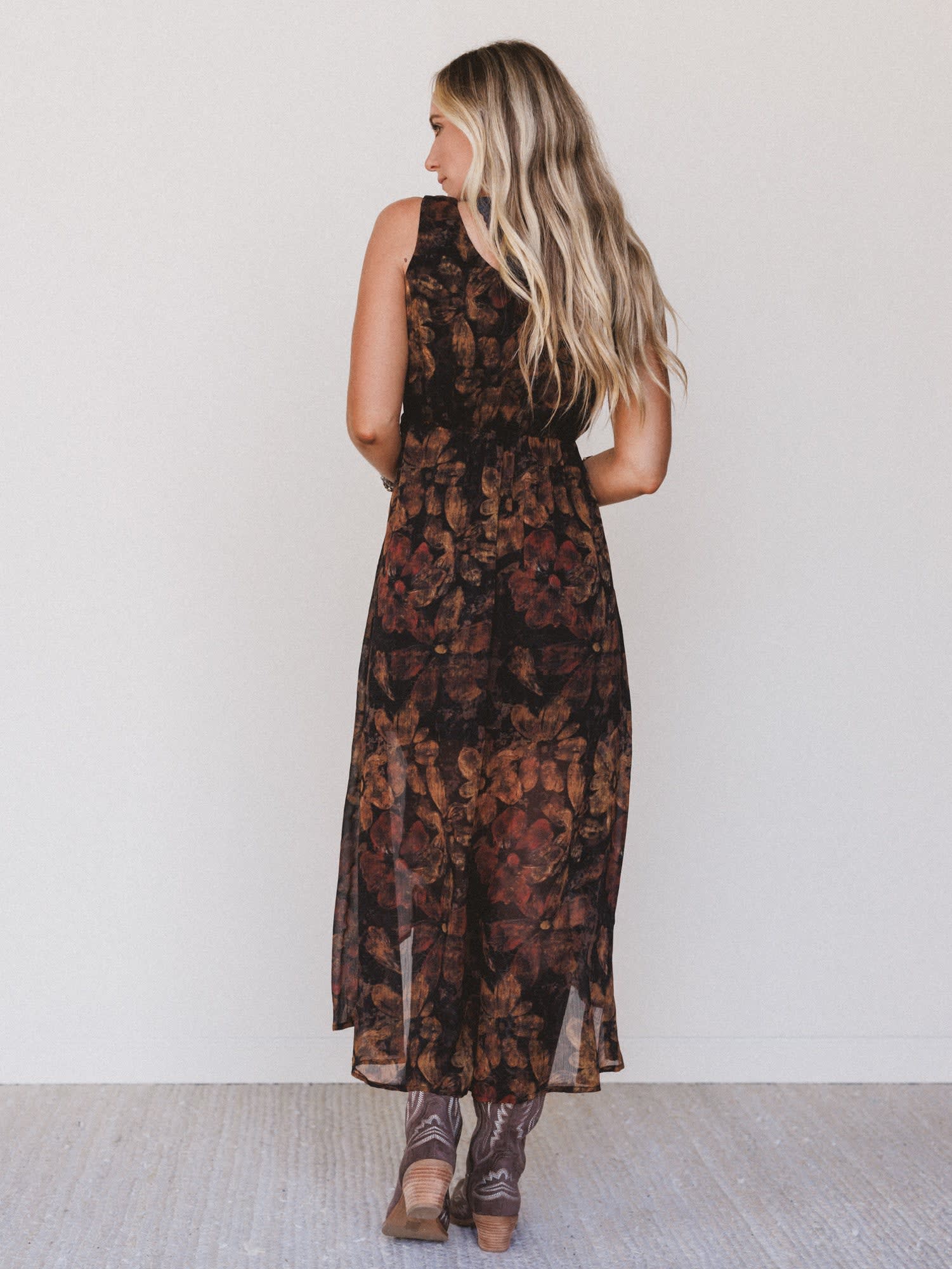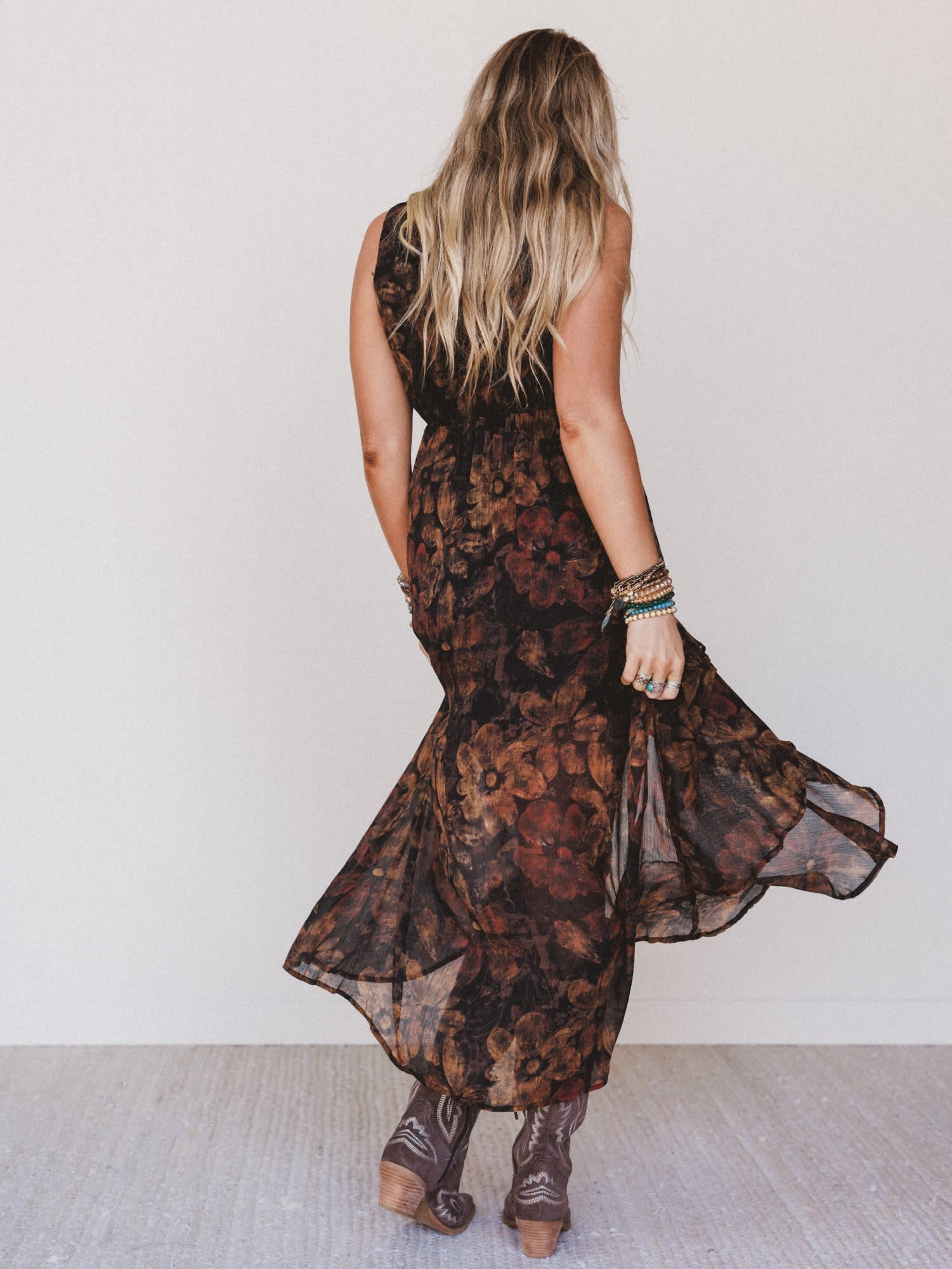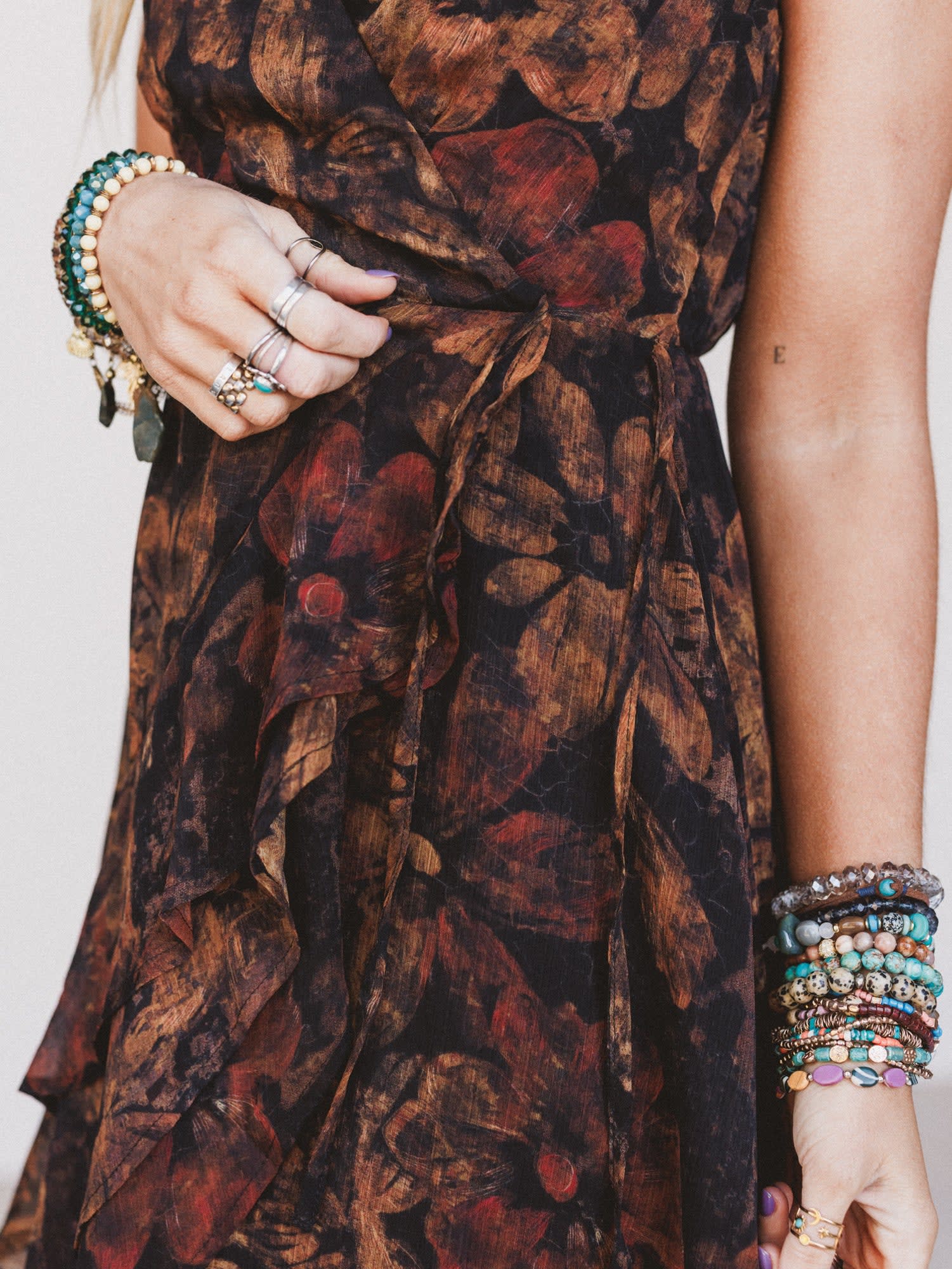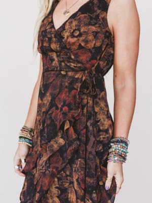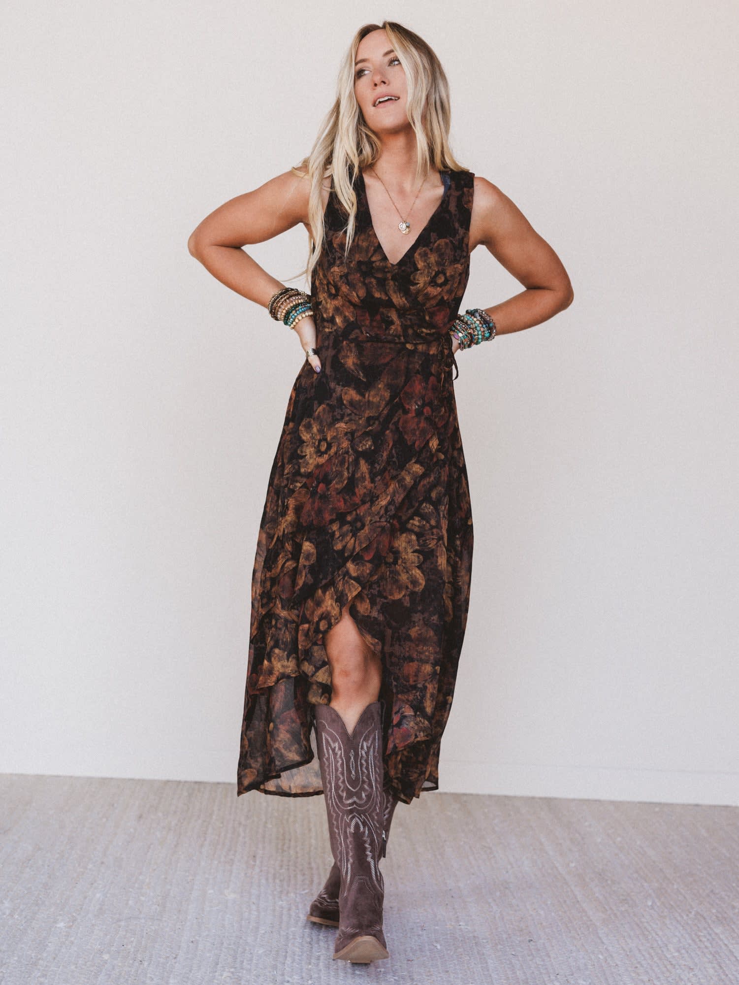 Bold yet romantic, the Jocelyn Wrap Dress is your new go-to for effortless elegance with a boho twist. Featuring a rich floral print in earthy tones and a flattering wrap silhouette, this flowy number moves beautifully with every step.