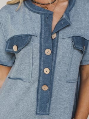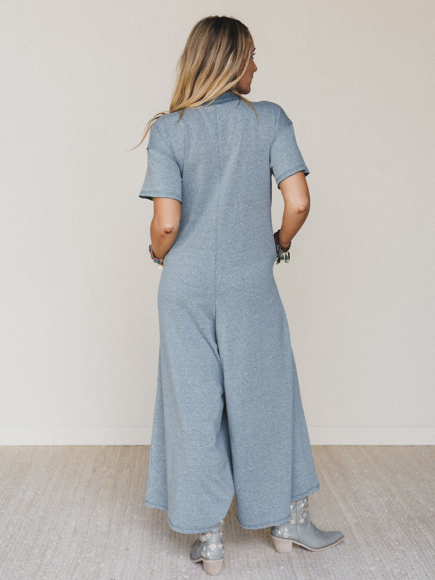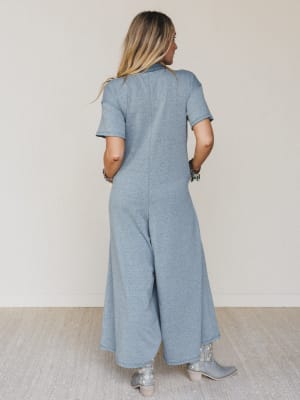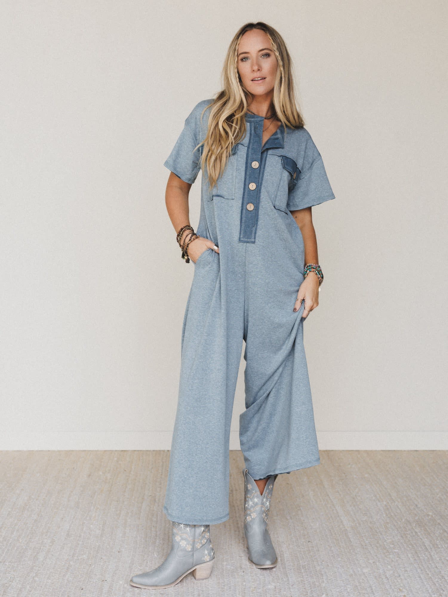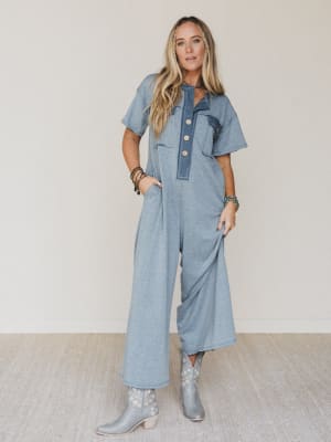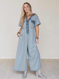 - Features The Nest Jodi Short Sleeve Jumpsuit, a relaxed knit one-piece in washed denim blue with wooden buttons, chest pockets, and wide-leg flow