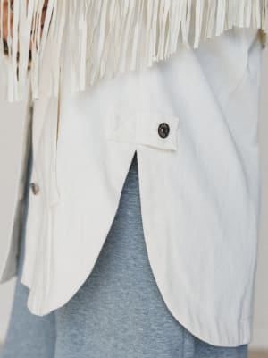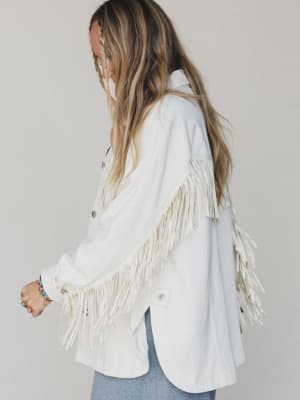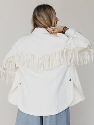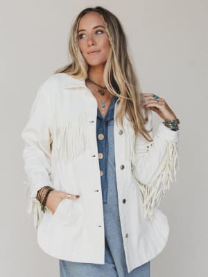 - Topped with the Jackson Hole Button Down Jacket in cream, detailed with dramatic fringe across the back and sleeves for standout western flair
