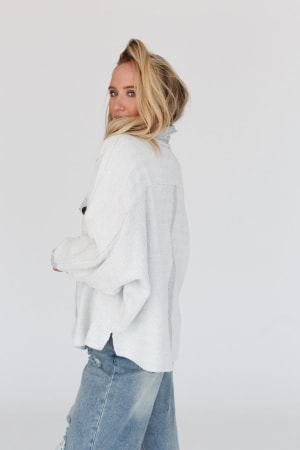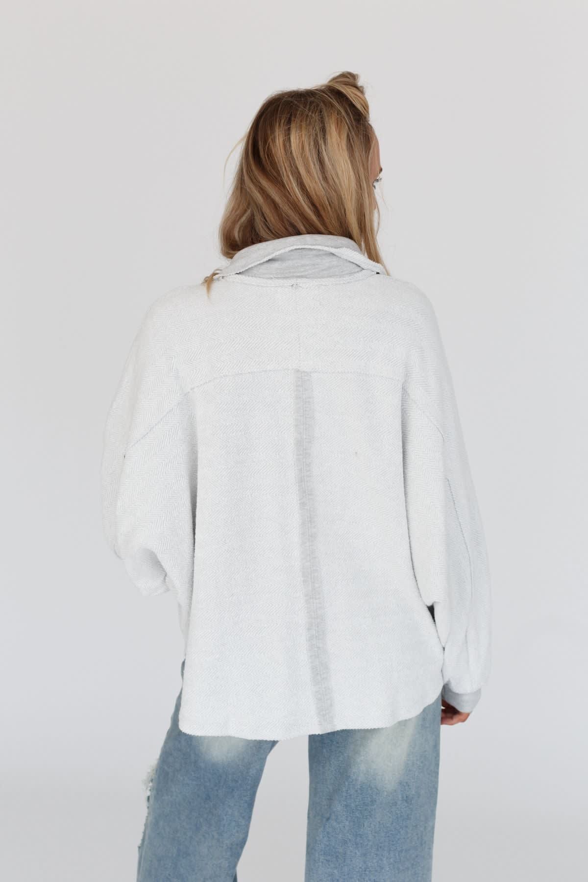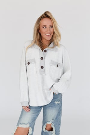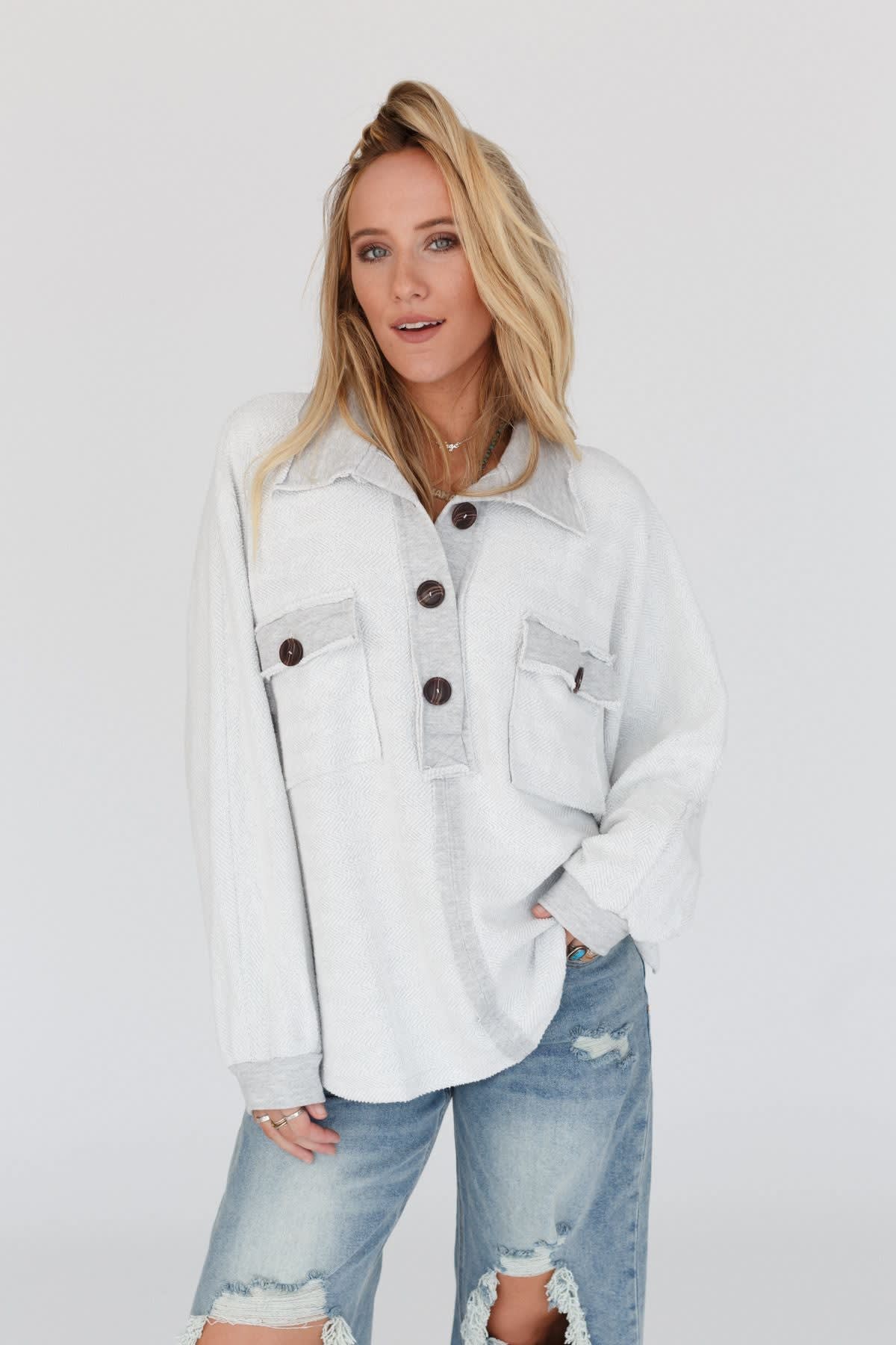 • Exaggerated collar neckline with a Henley button-up front closure
