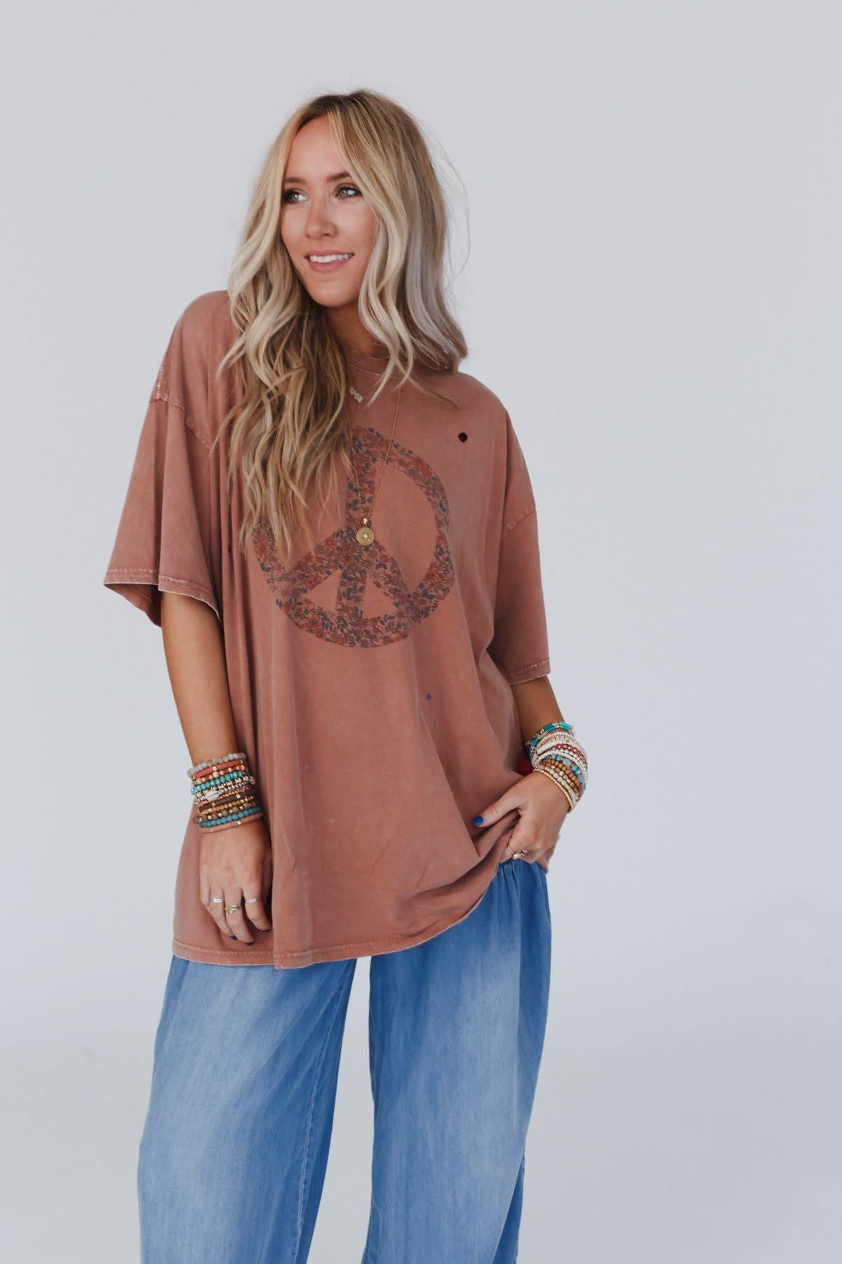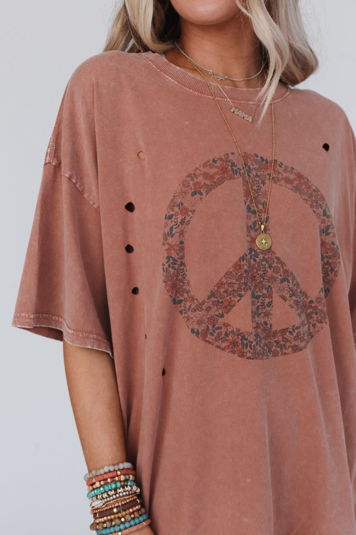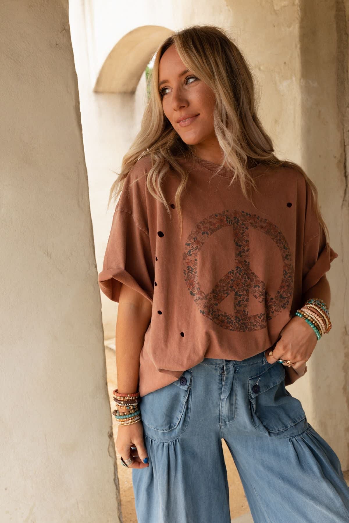 Nothing but peace and love in the Jude Oversized Peace Sign Graphic Tee! This boho-inspired tee is the perfect blend of comfort and style, making it a must-have addition to your boho wardrobe because it features: