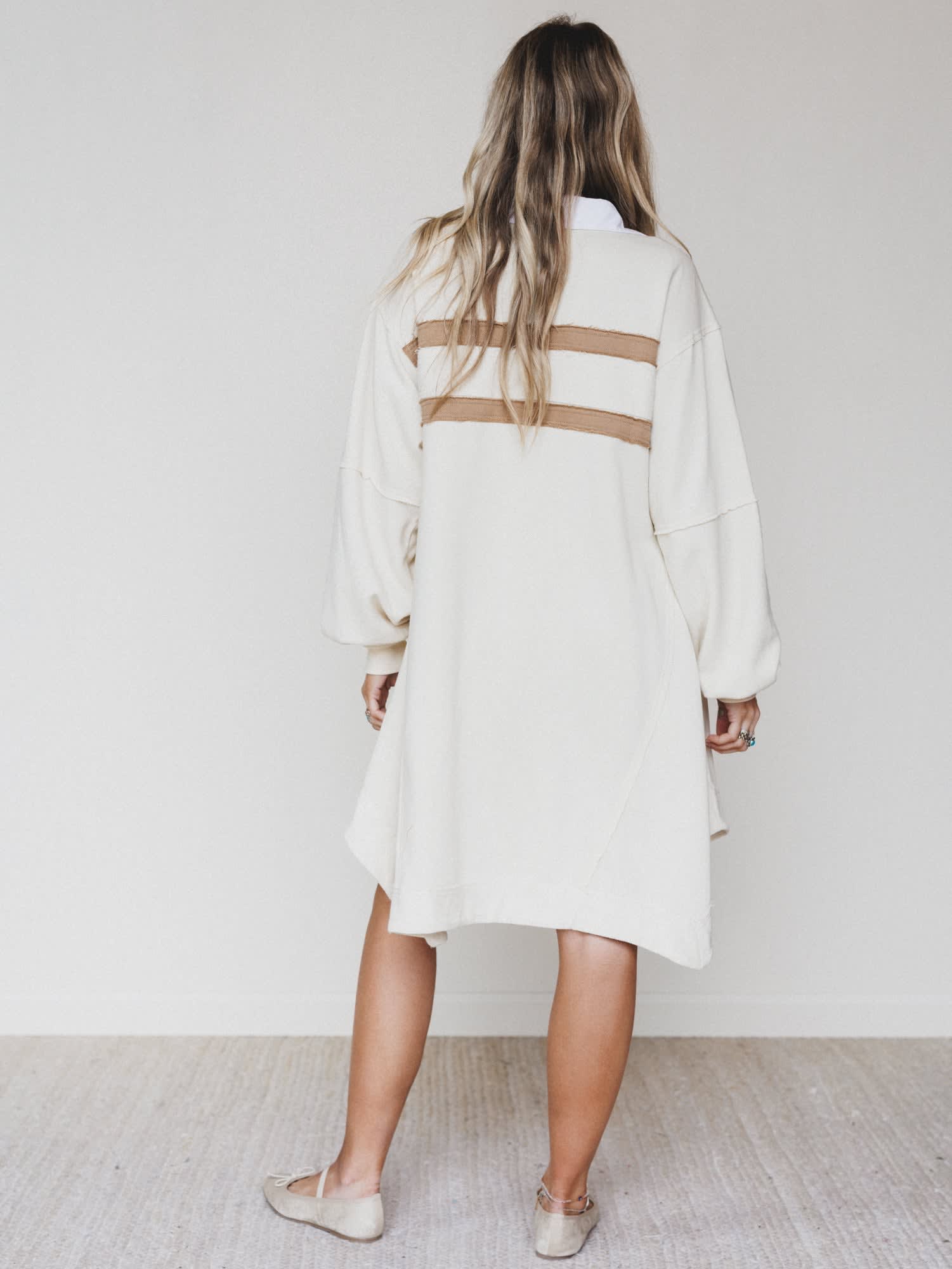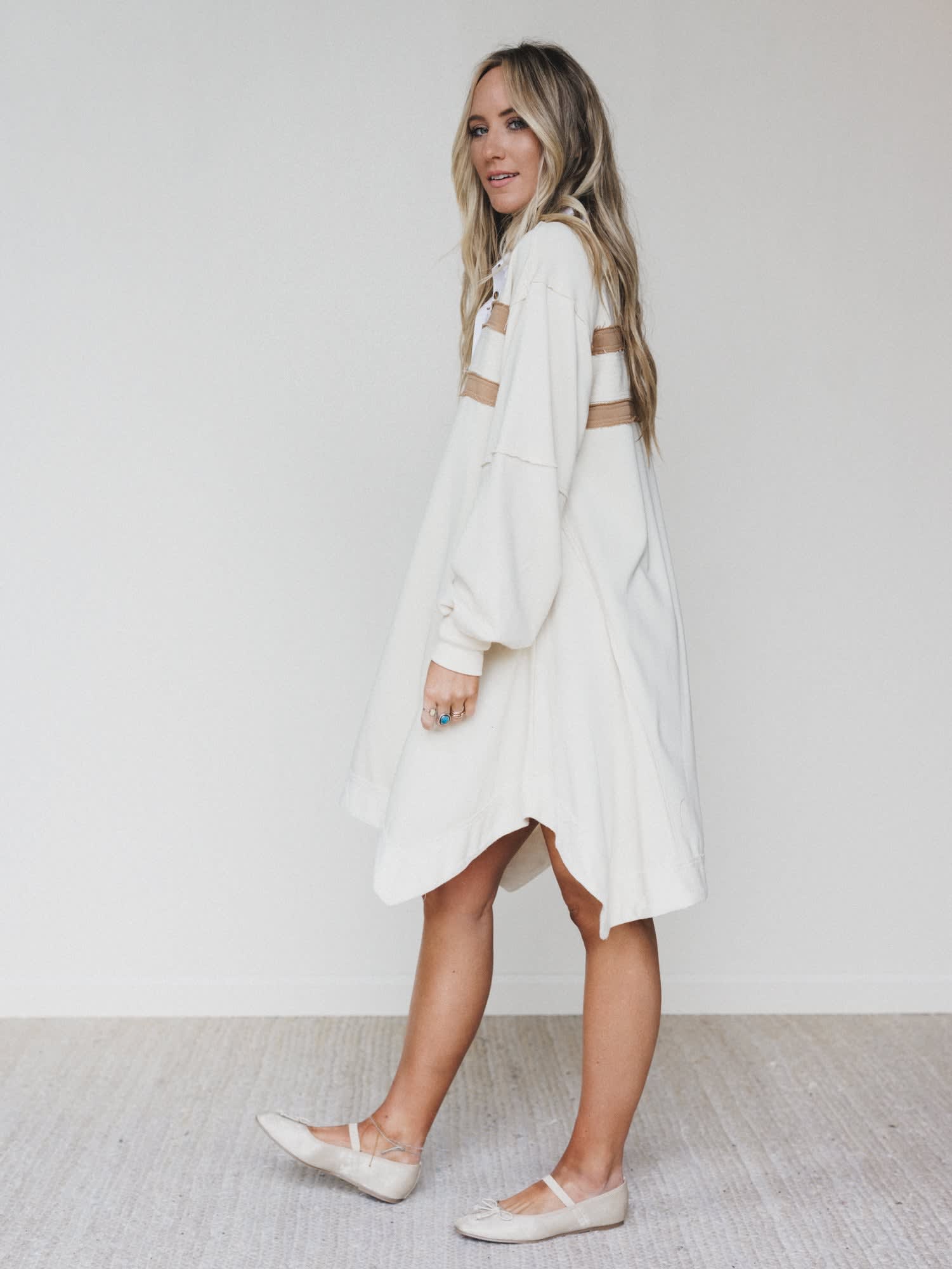 If you’re looking for what to wear on a casual coffee date or need an easy throw-on piece for busy mornings, the Juniper Dress has you covered. This relaxed sweatshirt dress blends sporty stripes with laid-back boho energy for that effortlessly styled look.
