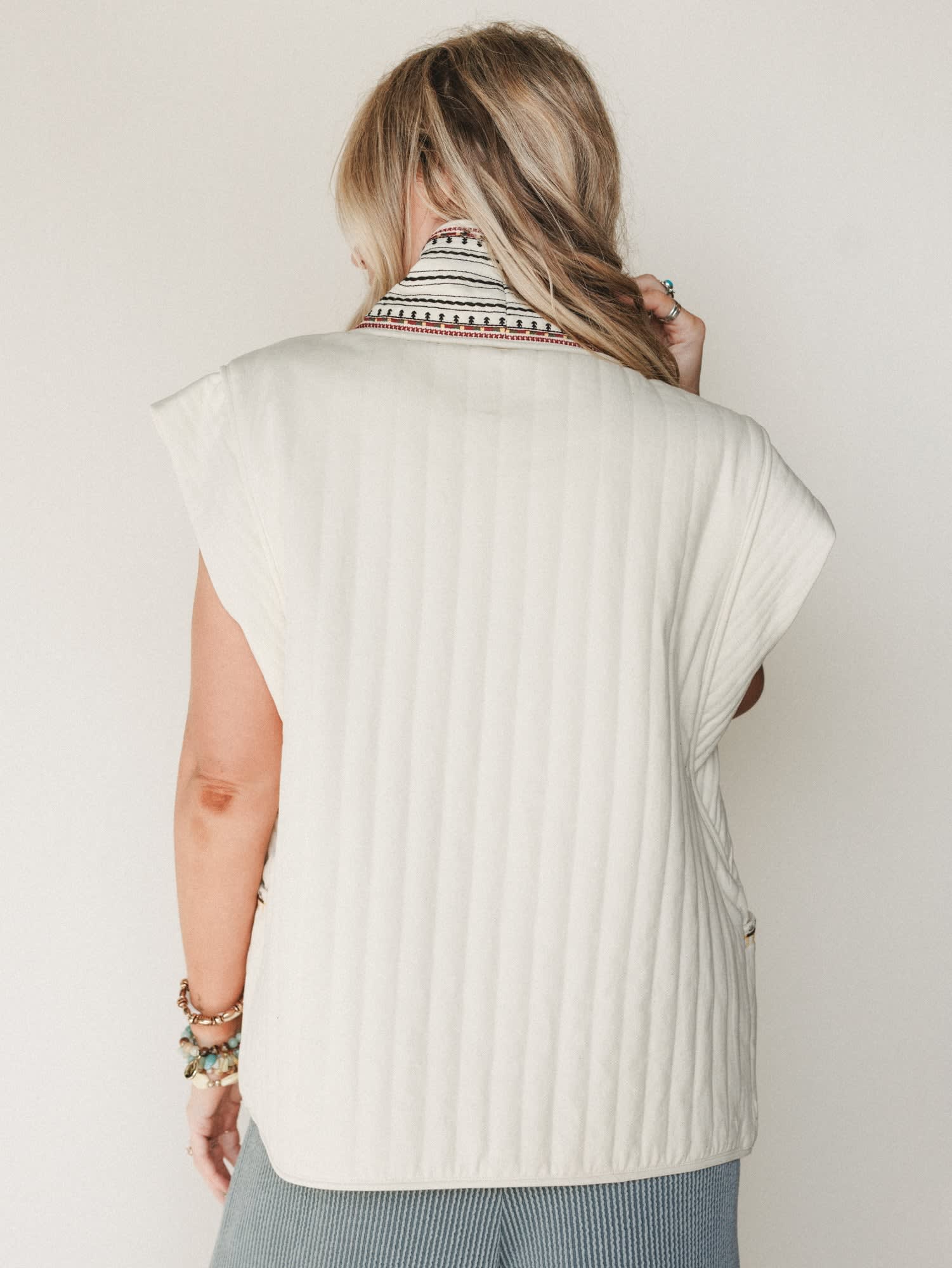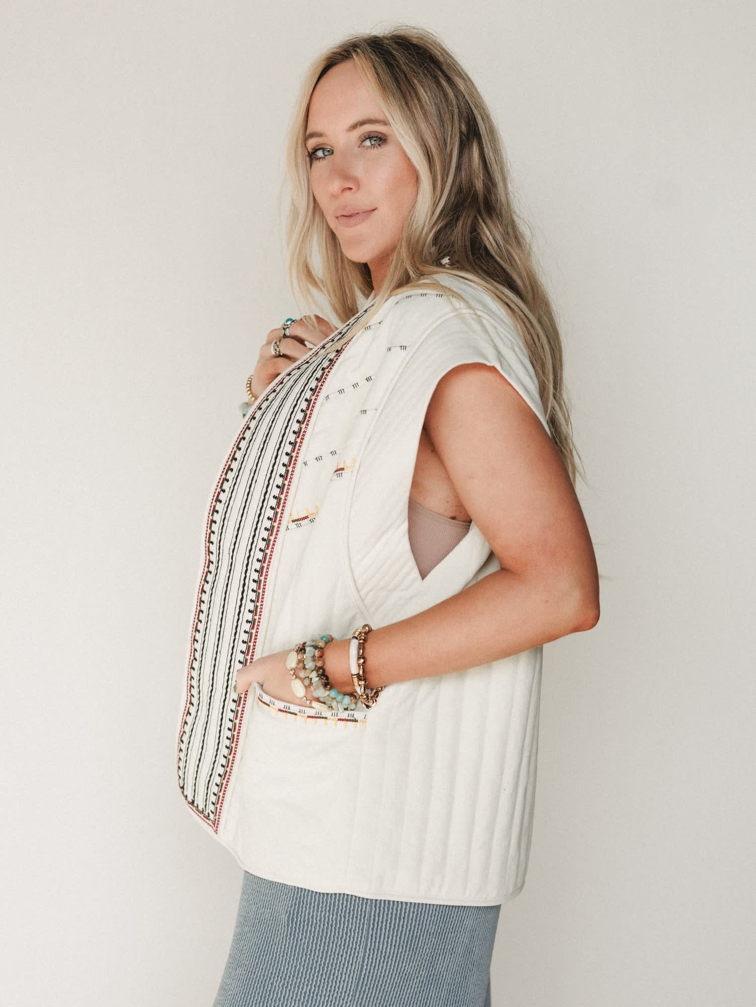 Soft beige quilted vest with intricate embroidered detailing for a relaxed boho look
