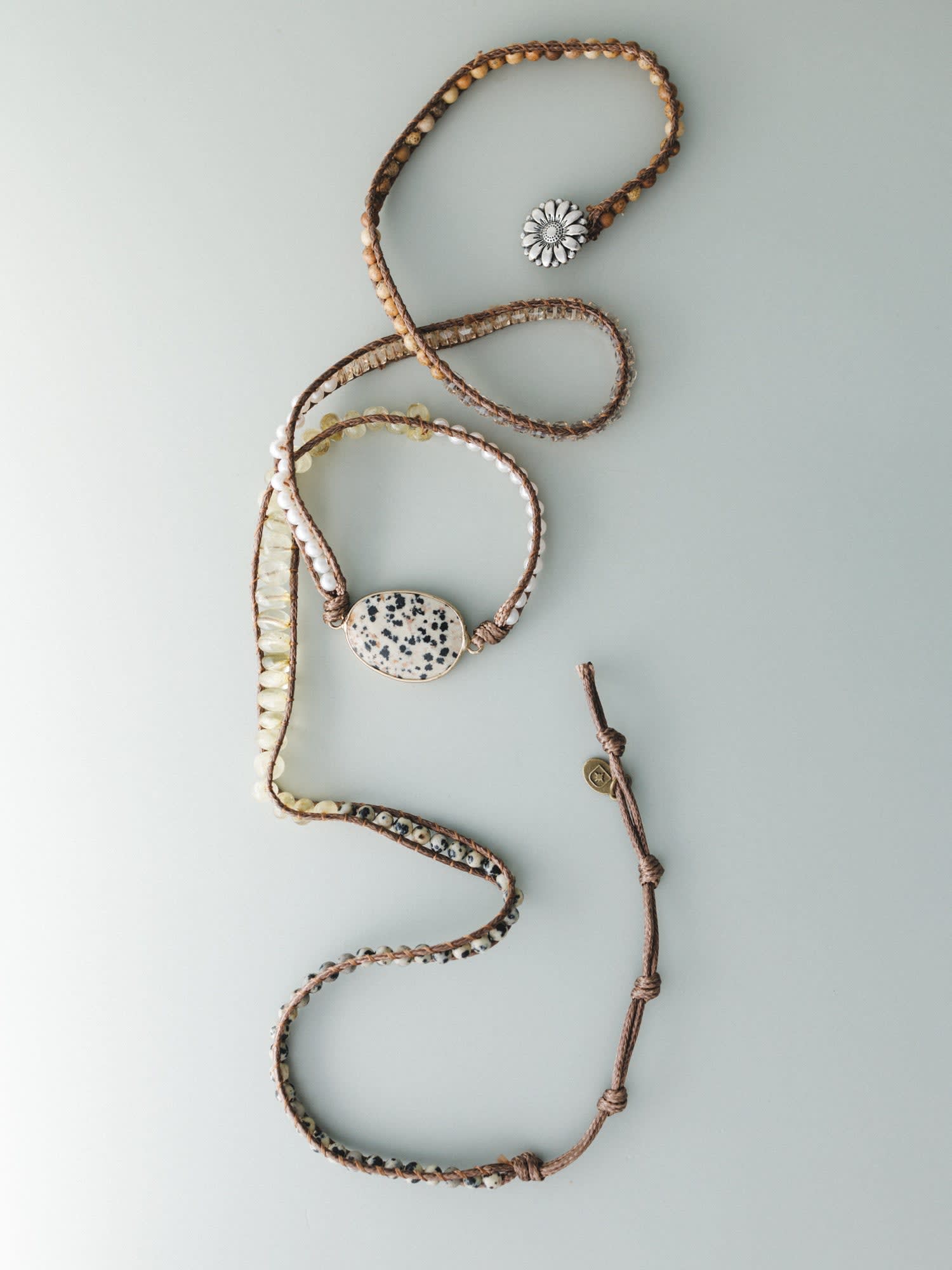 - Cotton poly cord, natural stone, and glass stones