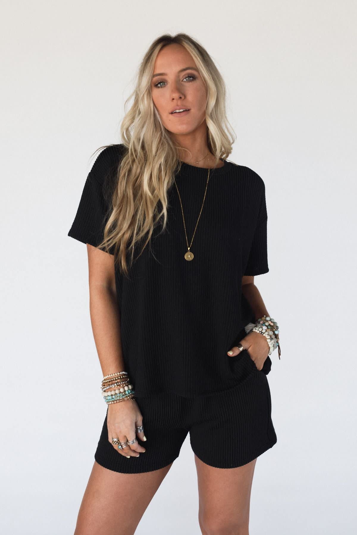 Meet your new go-to lounge set. This ribbed black tee and shorts set can also easily be dressed up with jewelry and boots for your next outing.