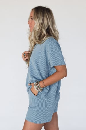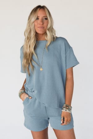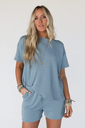 Meet your new go-to lounge set. This ribbed black tee and shorts set can also easily be dressed up with jewelry and boots for your next outing.