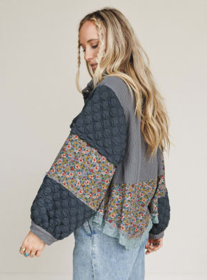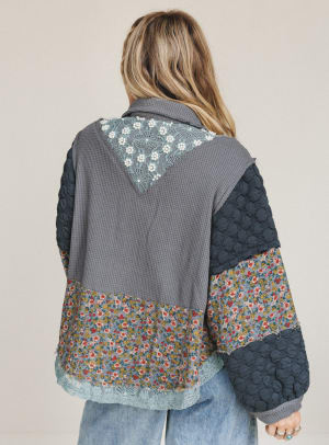 - Waffle knit cotton base with quilted puff sleeves and front pockets