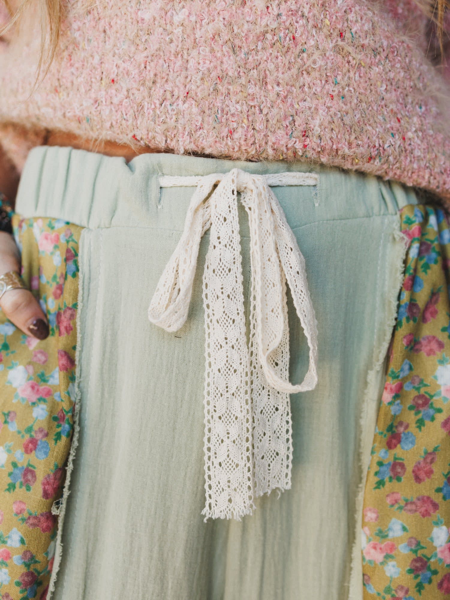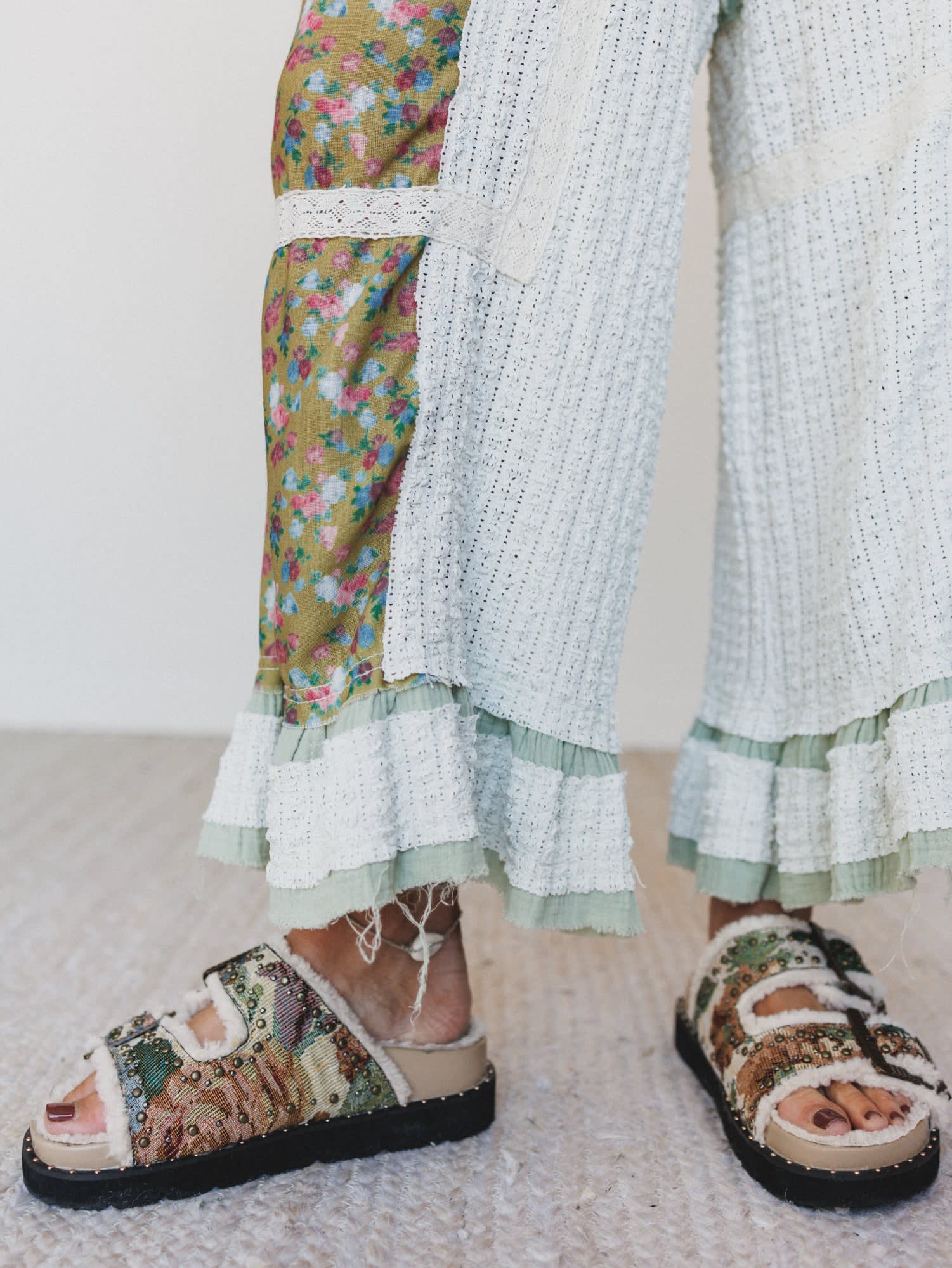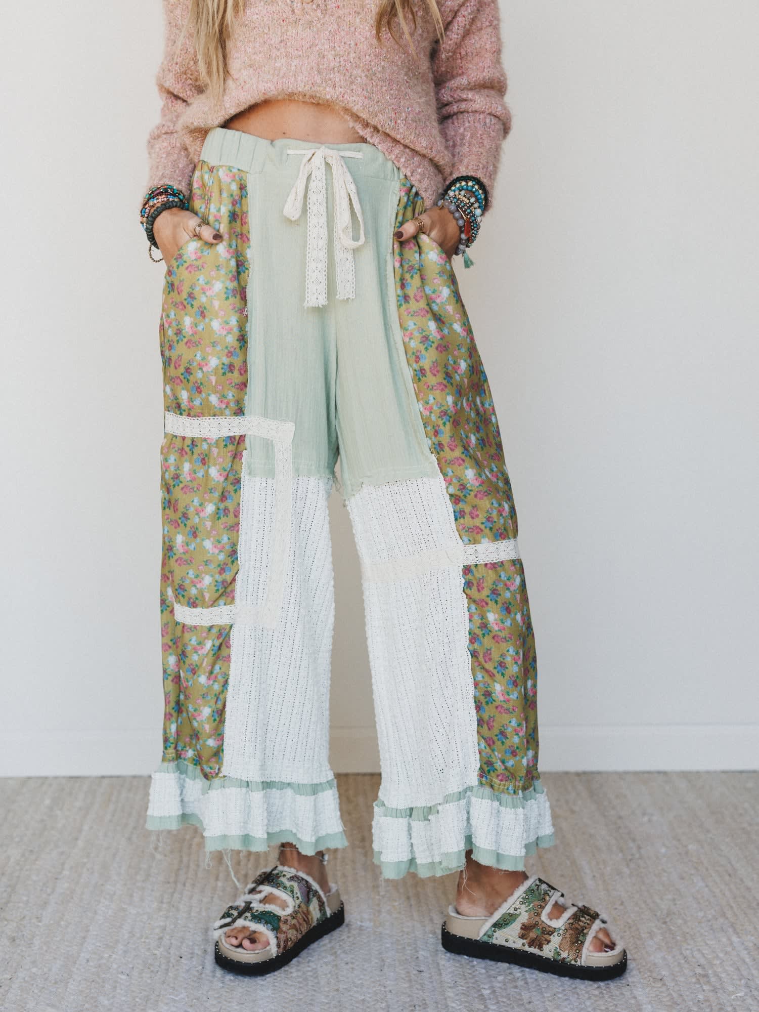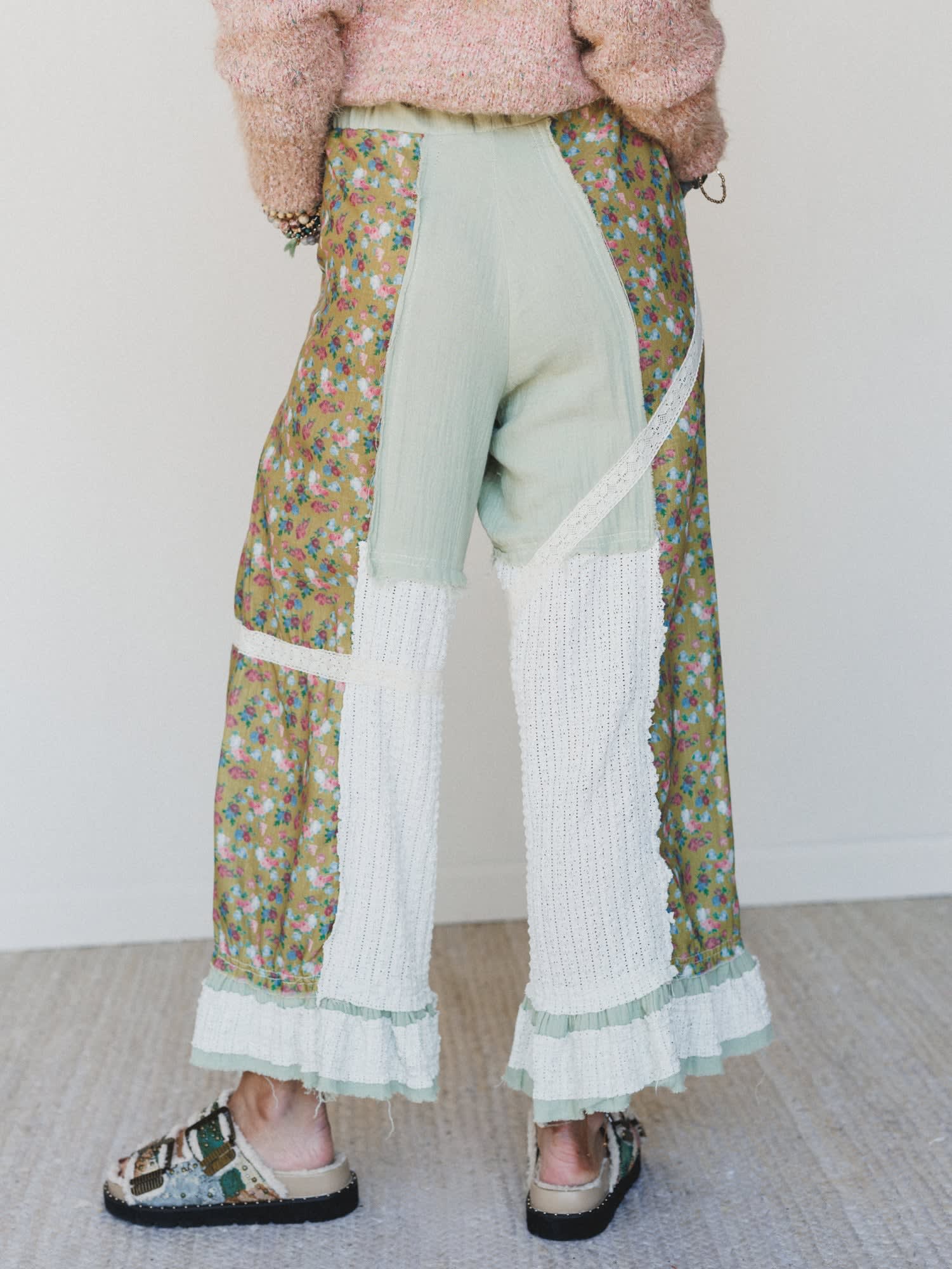 - Everyday All Day Pants: Statement patchwork pants featuring floral panels, crochet lace accents, and ruffled hems for serious whimsy