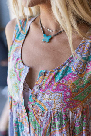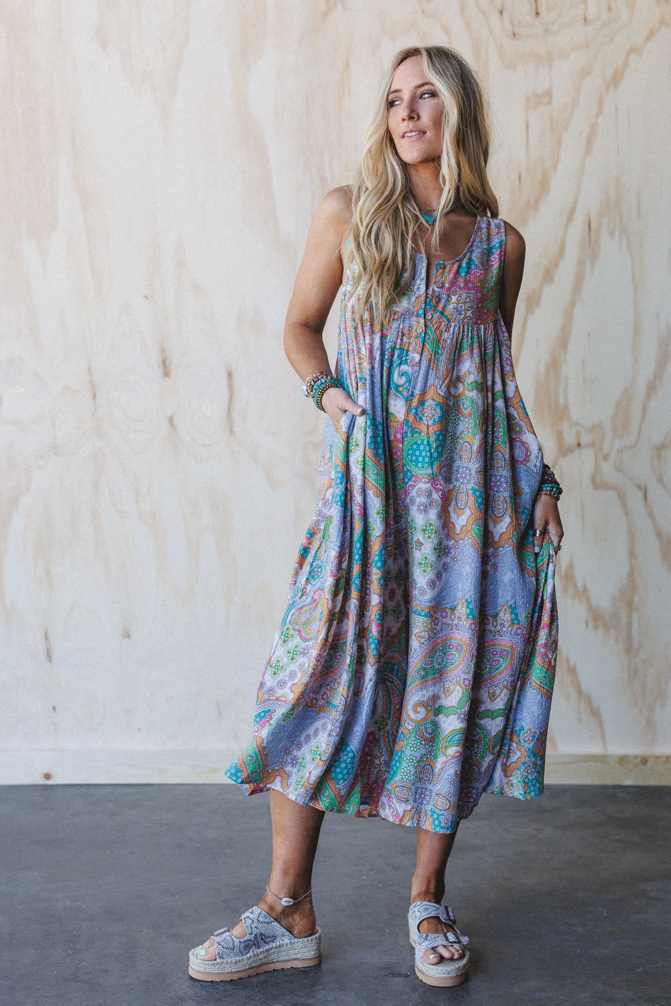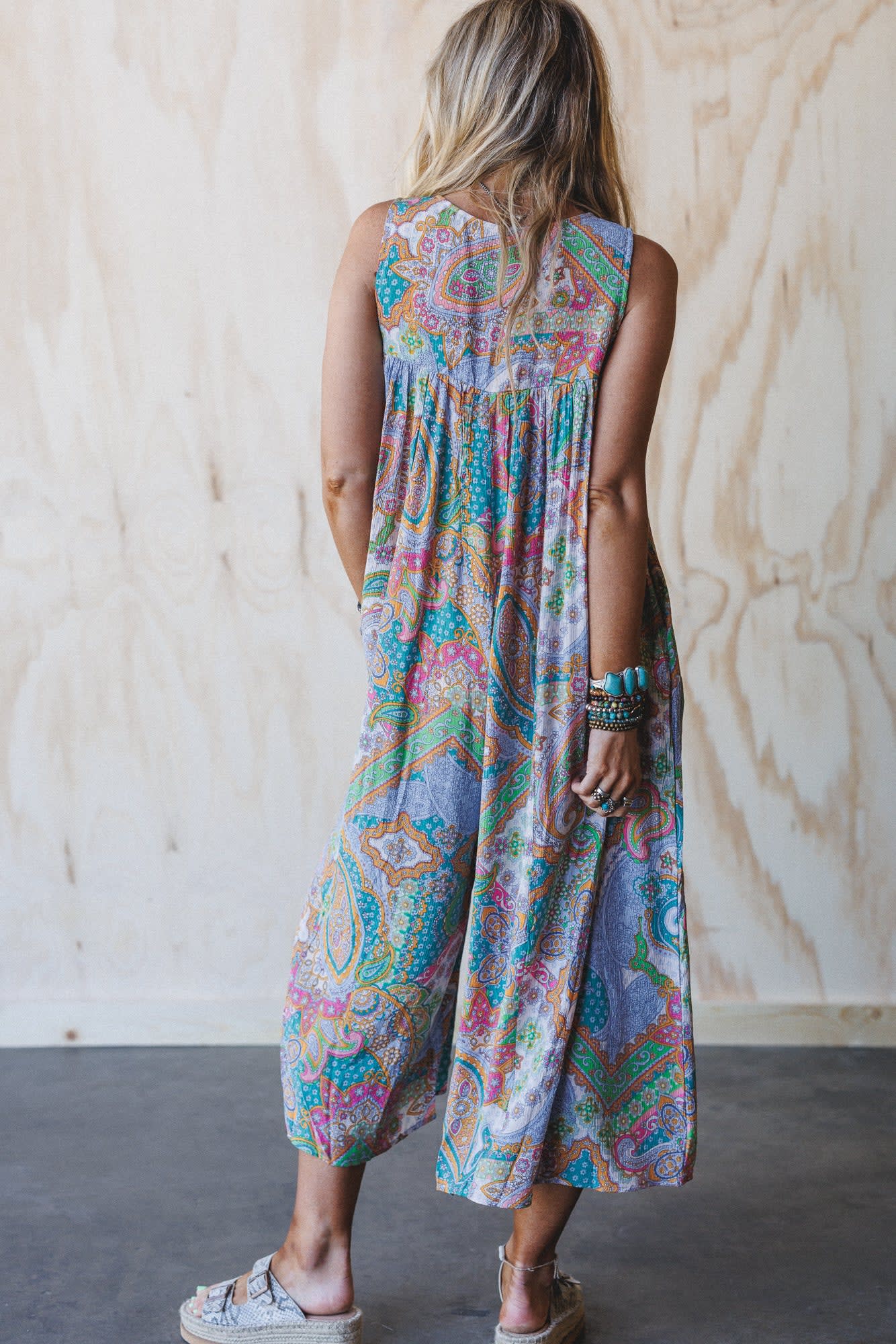 This retro boho jumpsuit is so lively and colorful, all you need is a denim jacket to top it off.