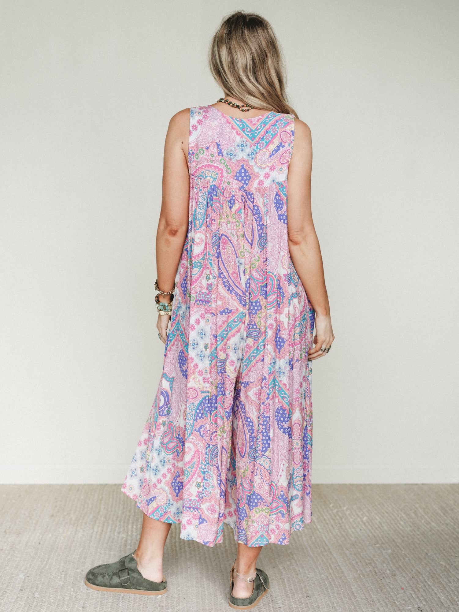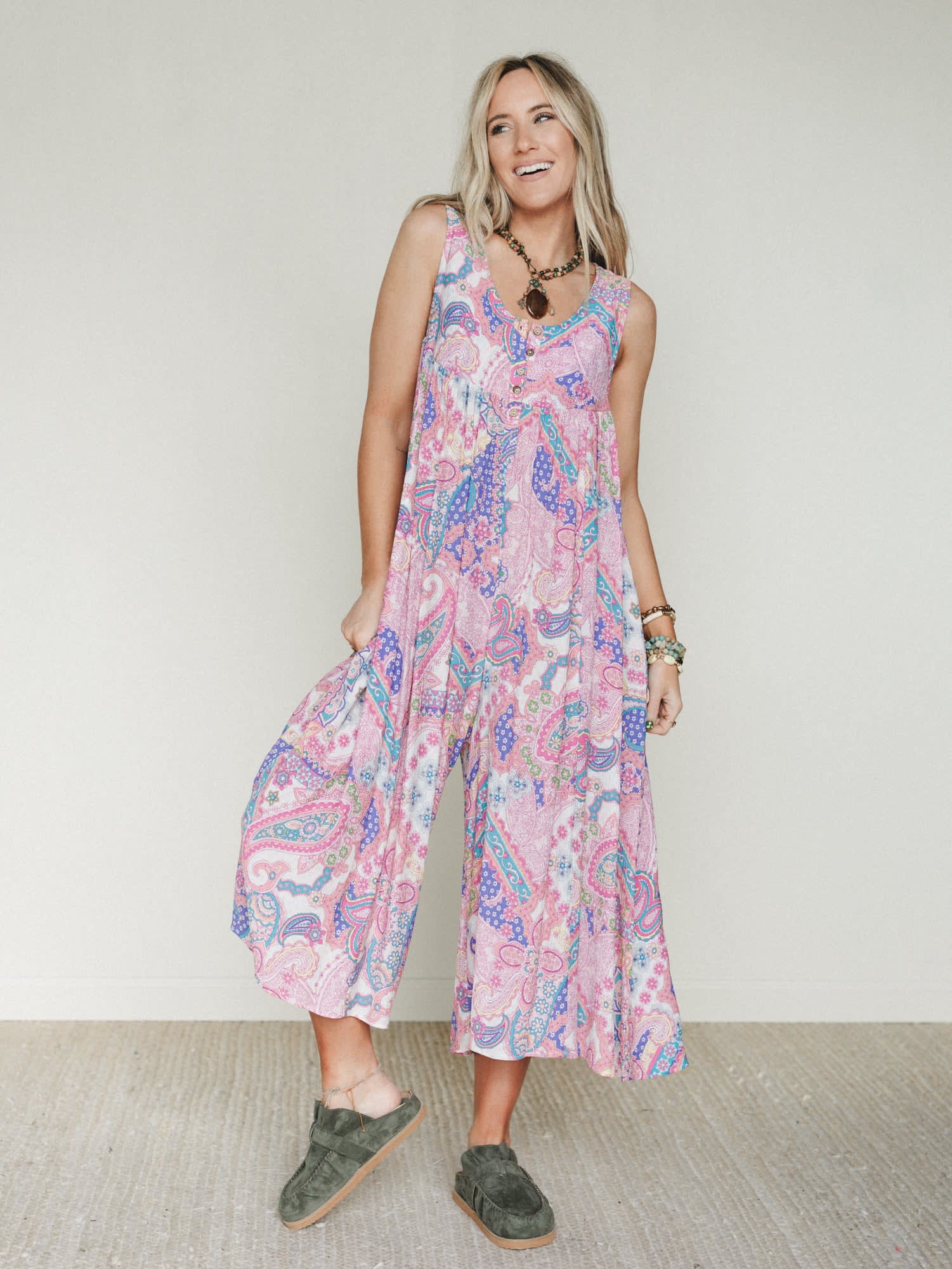 Meet the jumpsuit that makes getting dressed for a festival outfit or sunny weekend plans feel effortless. The Leona Paisley Print Jumpsuit brings all the carefree charm of boho style with its flowy silhouette and dreamy light pink paisley print.