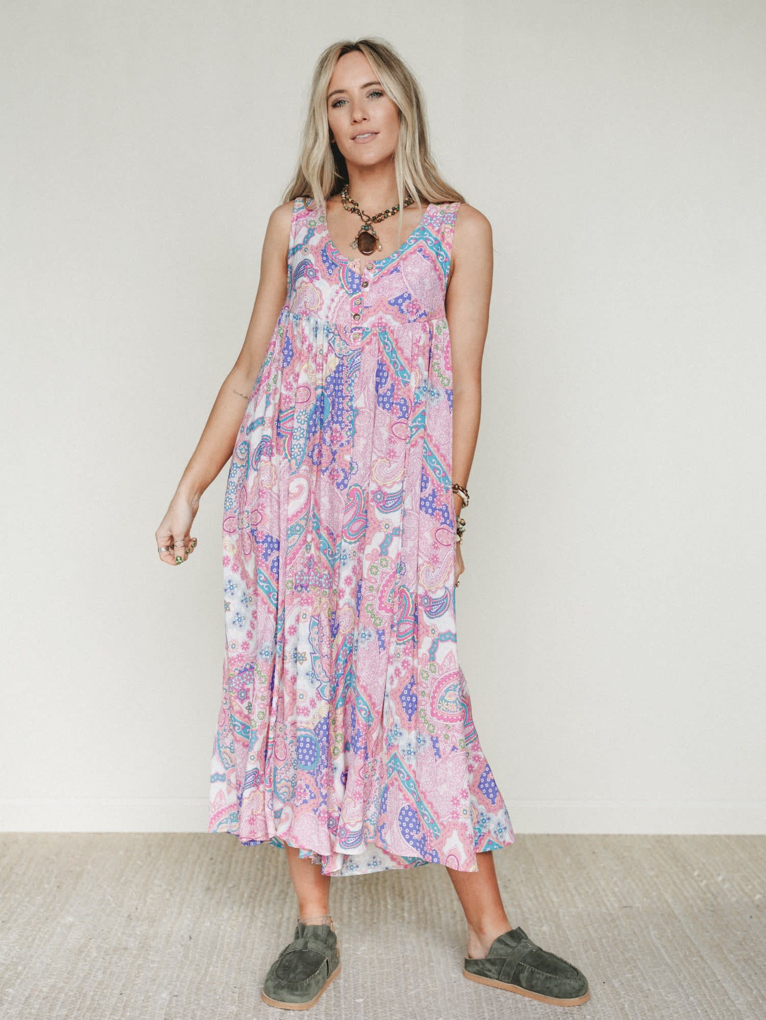 Sleeveless design with button front detail adds a flattering, laid-back boho touch.