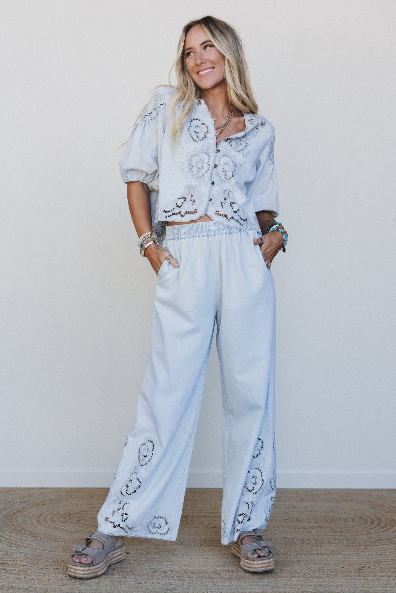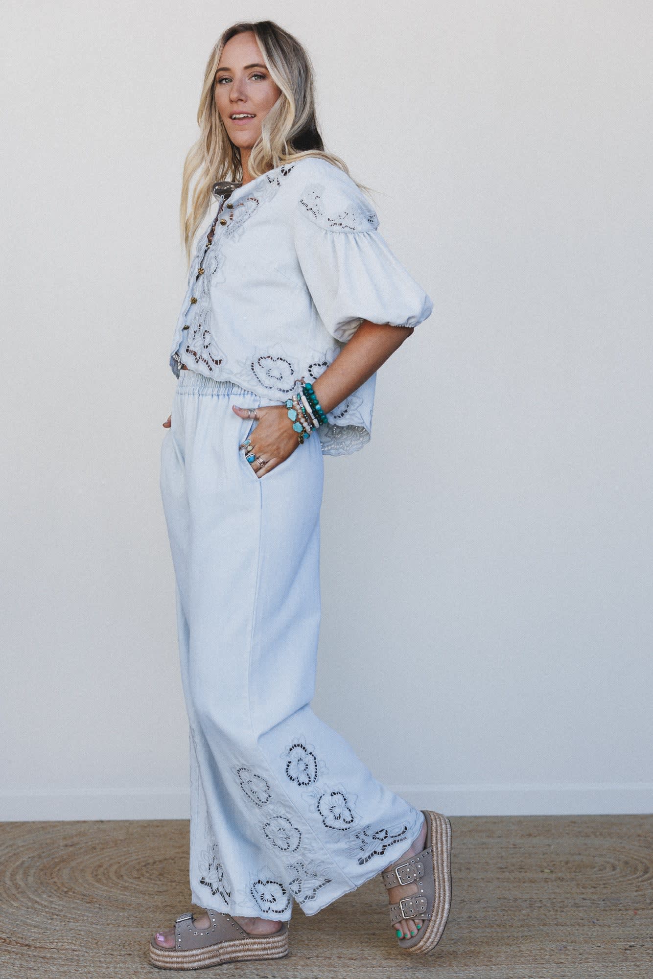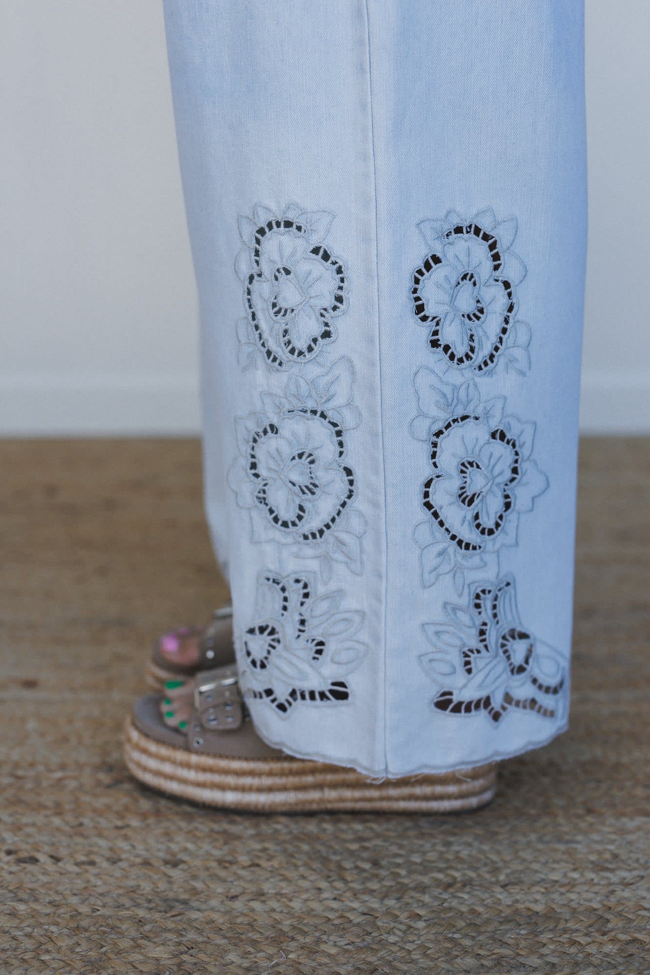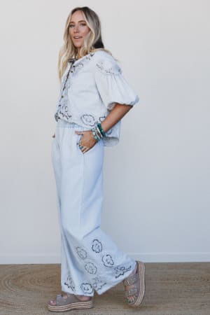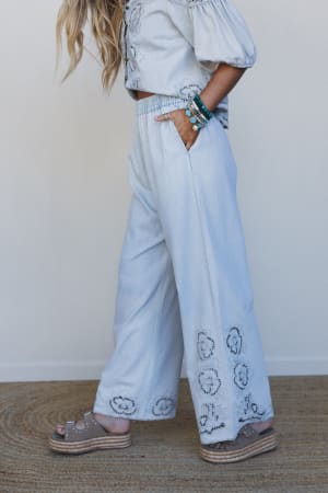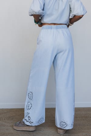 • Flowy, free, and fabulously bohoβ€”these embroidered denim pants are your new festival favorites. Dress them up with a lace top or keep it casual with a tee.
