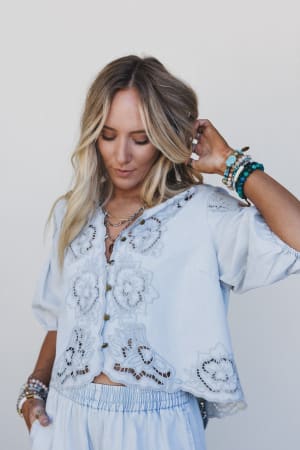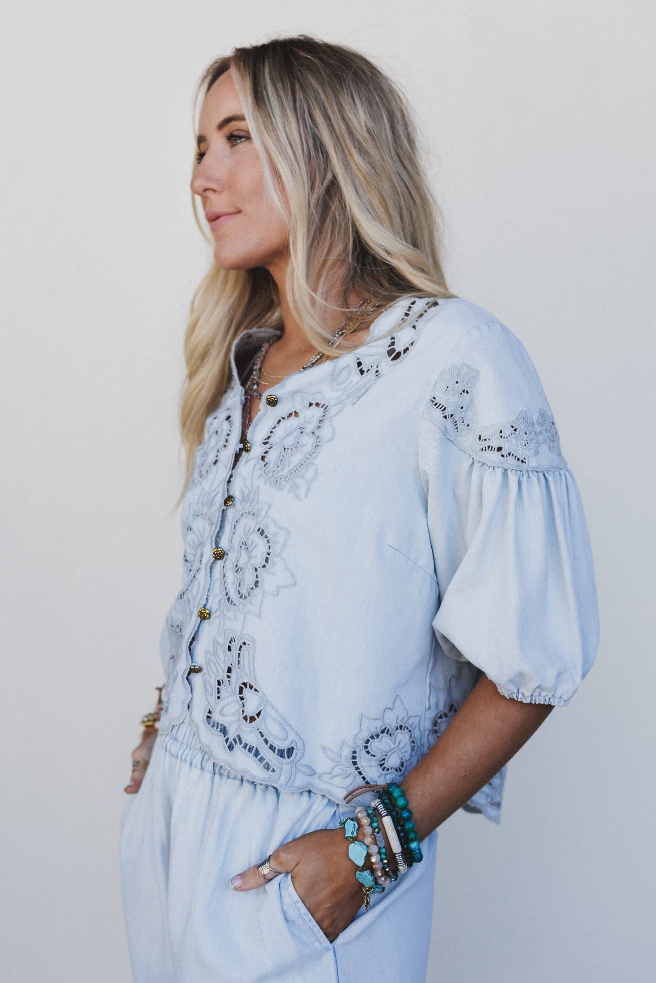 • This denim eyelet top brings a touch of artisanal charm to your summer style. Embroidery and breathable cotton make it a boho wardrobe essential.