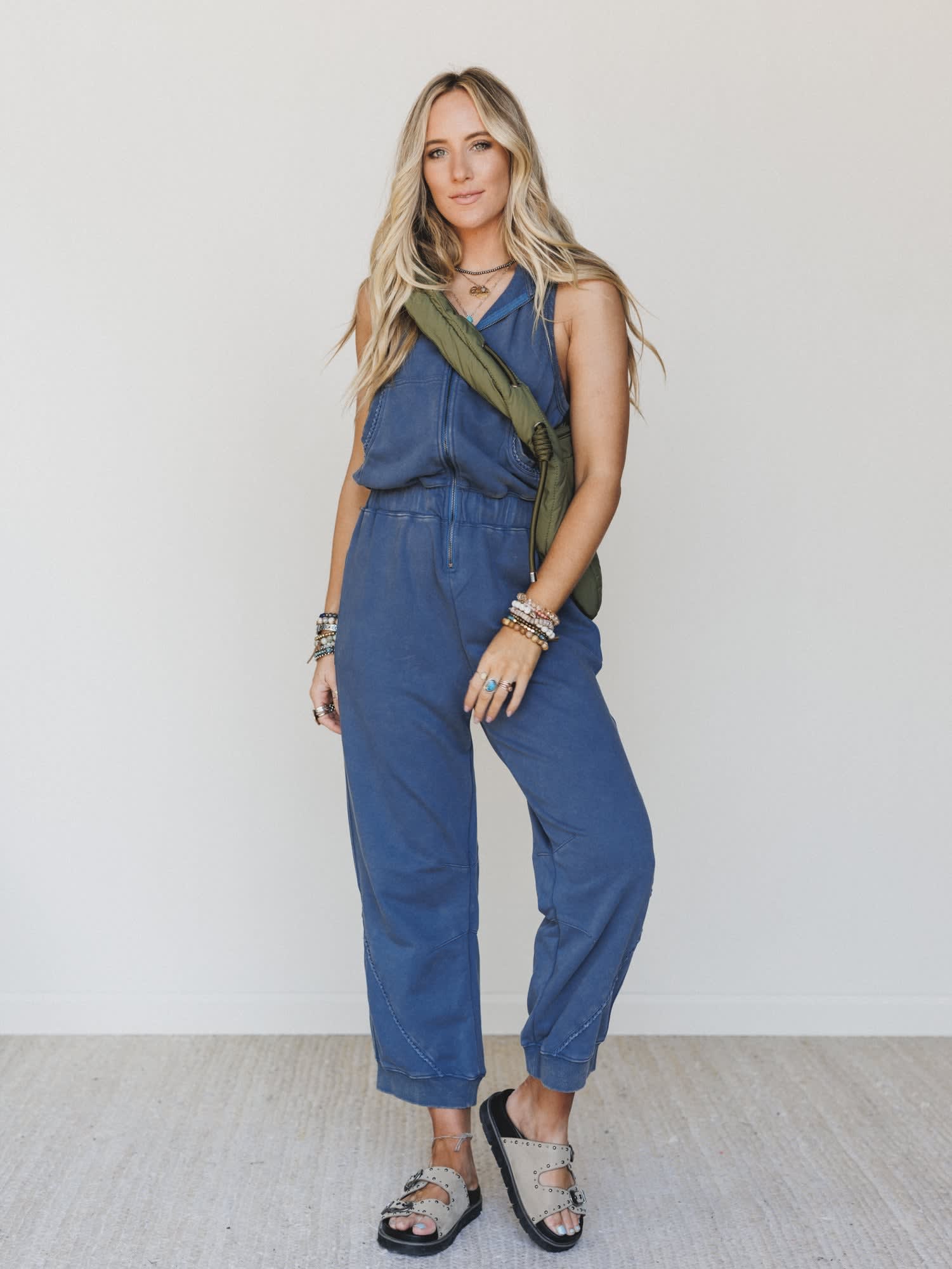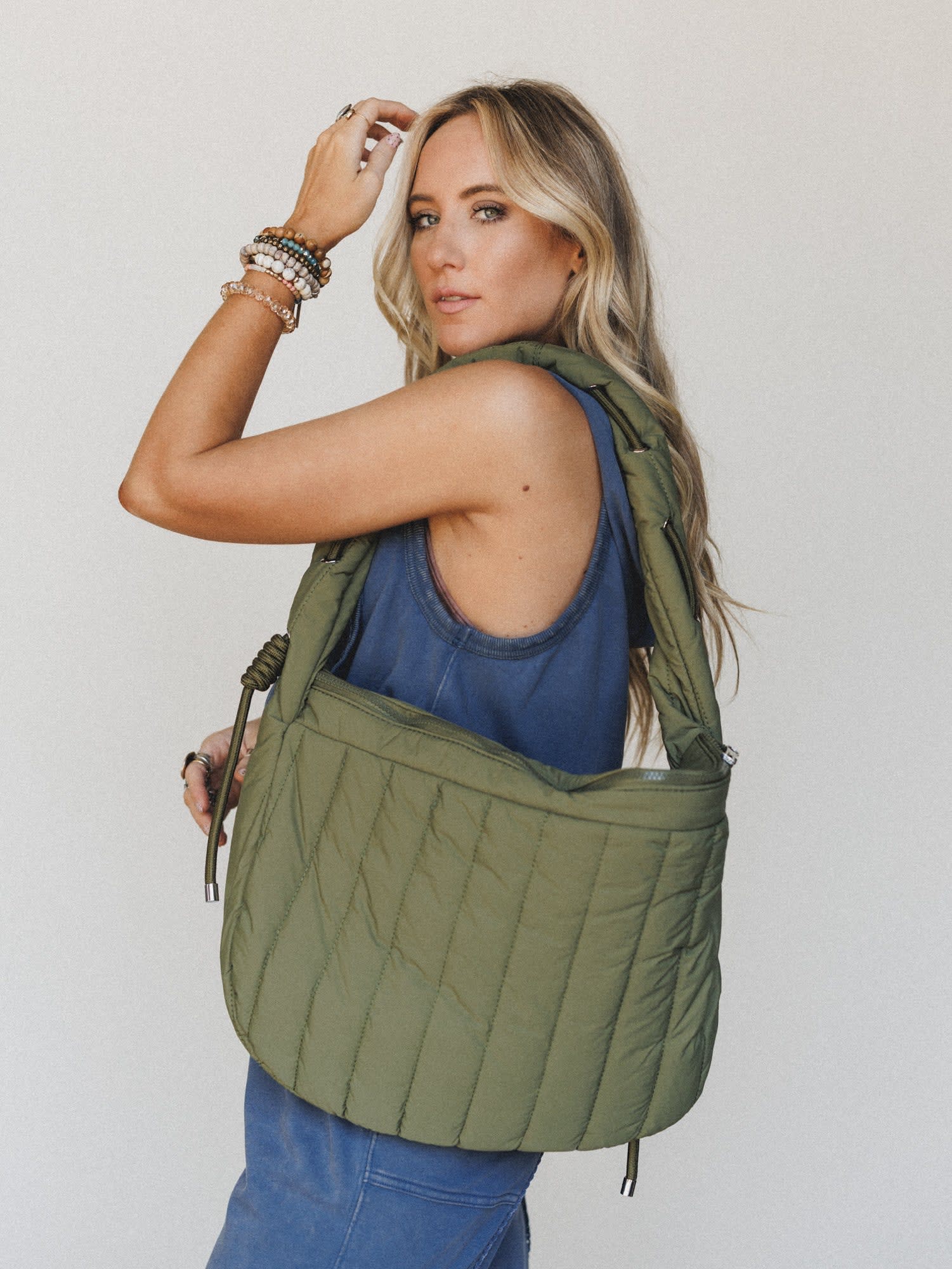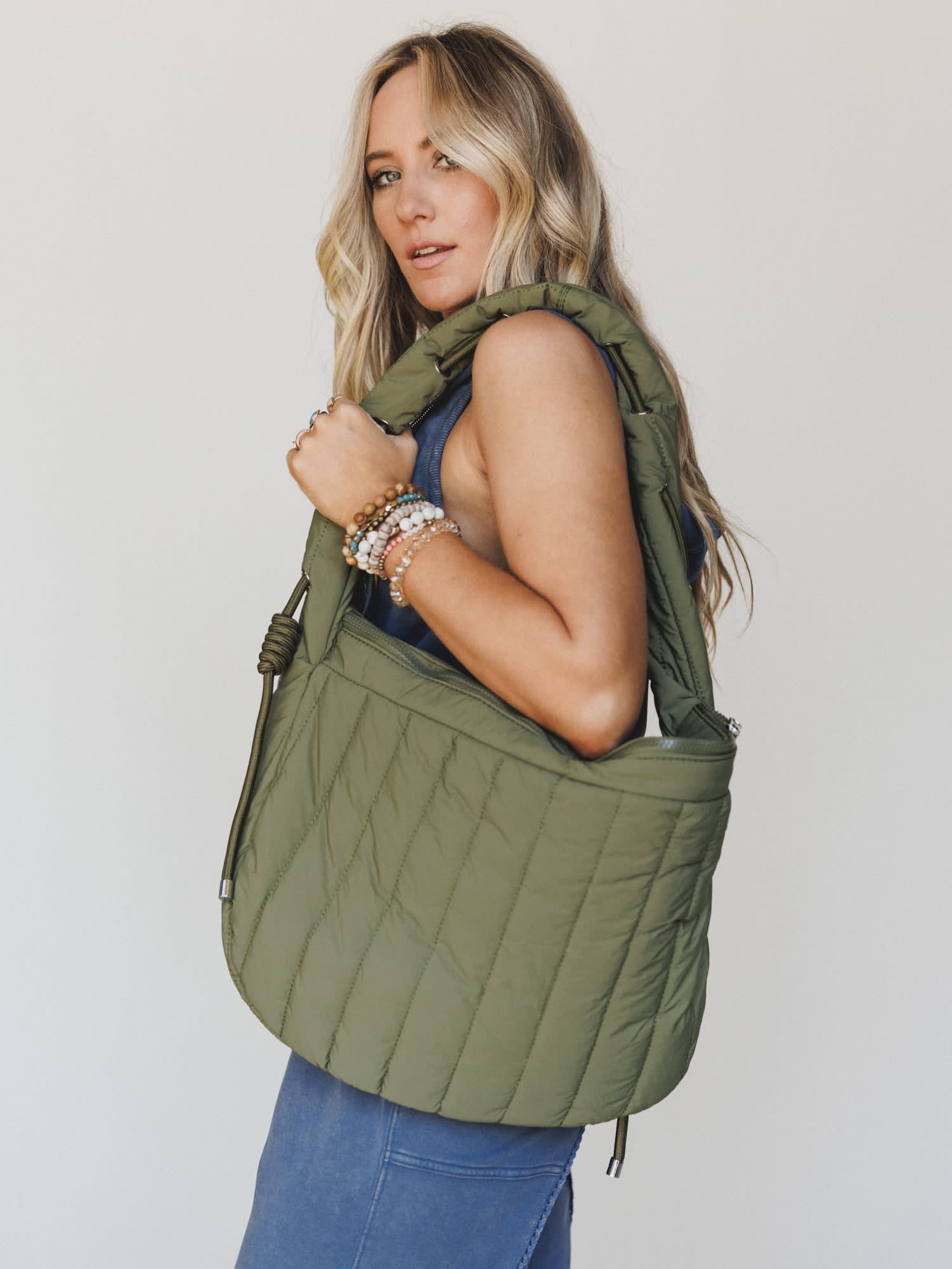 - Olive quilted finish with a soft, puffer-style texture for an on-trend neutral look