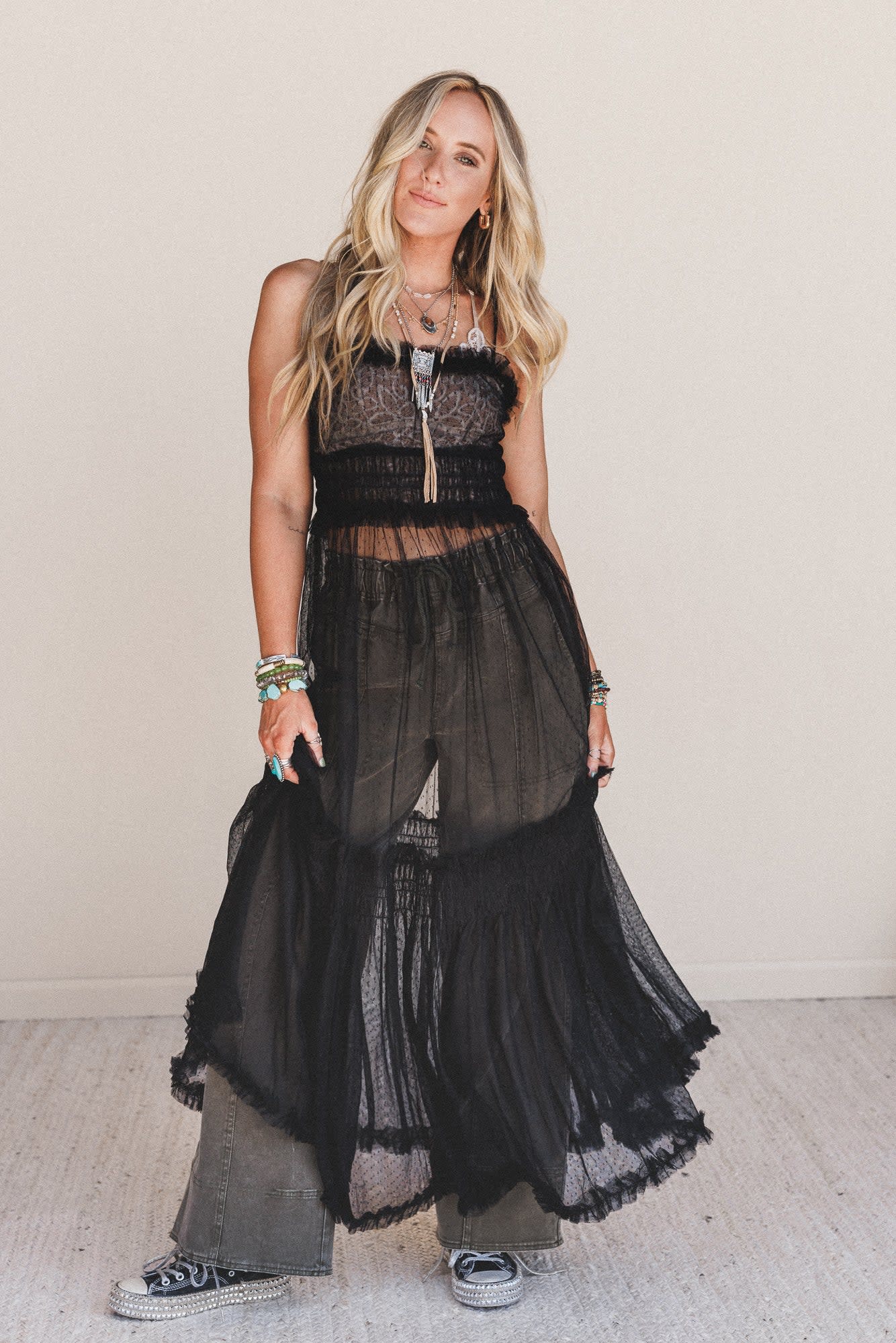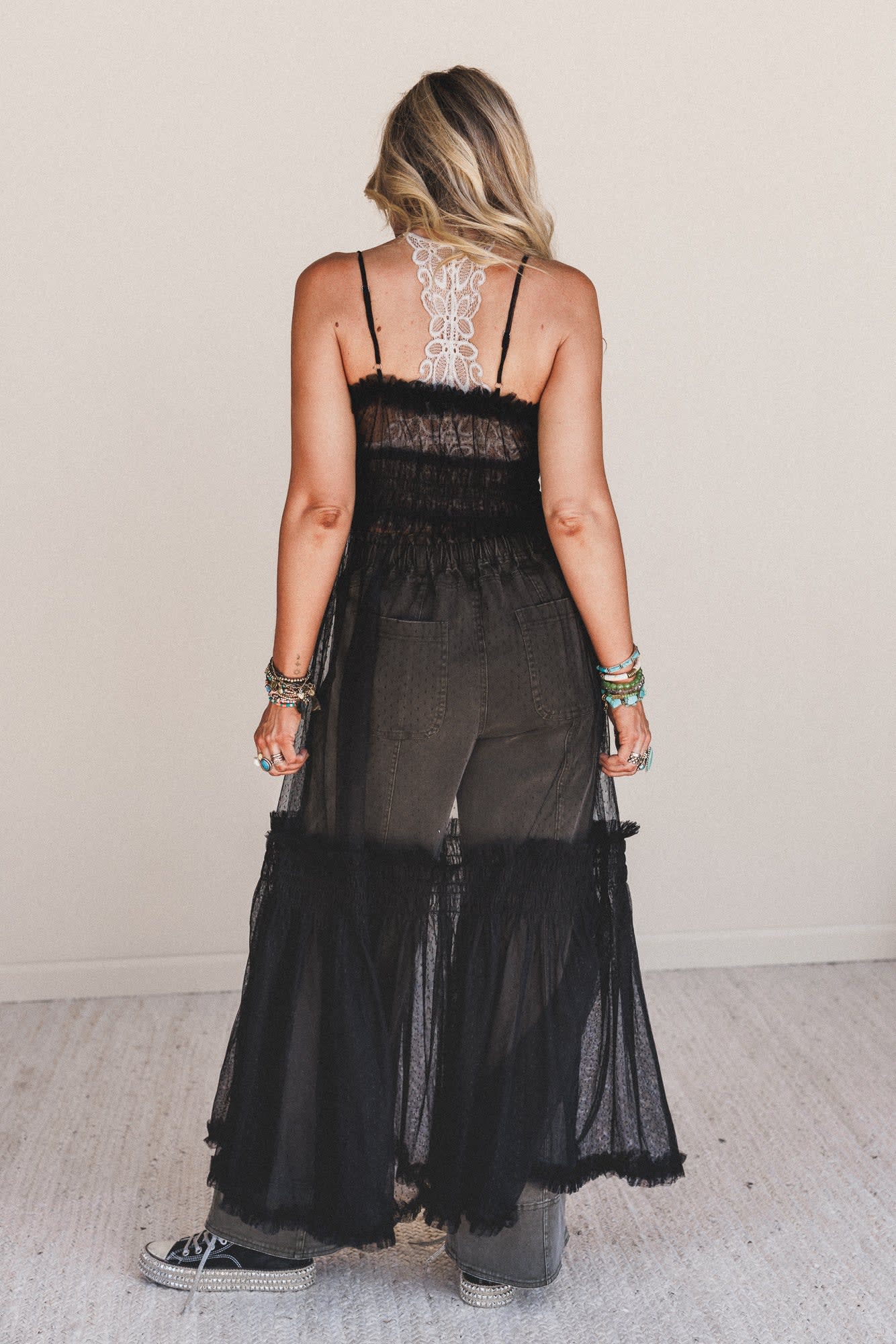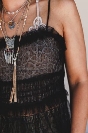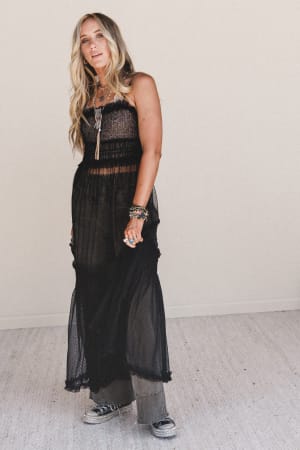 Dreamy and ethereal, this black maxi dress is made for sunlit strolls and moonlit dances. Lightweight layers give it a breezy, romantic feel.