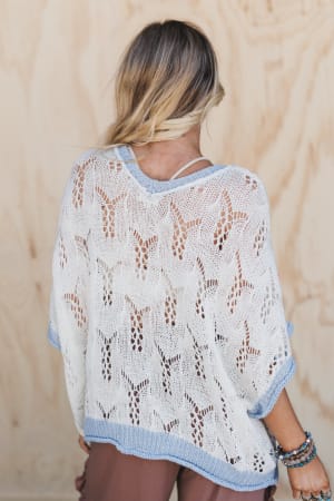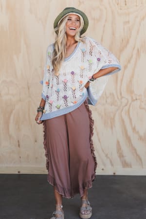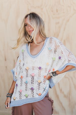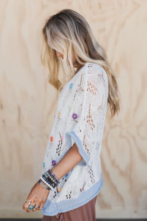 This colorful lace crochet top pairs perfectly with lightwash overalls and sneakers for a cute casual look.