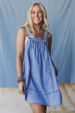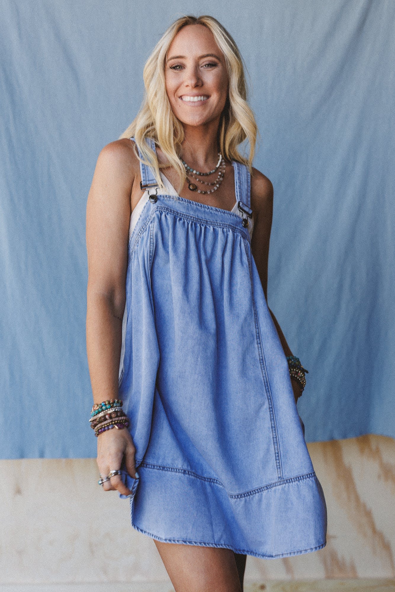 Pair this boho denim dress with tall boots and a sheer top for a cute night out look.