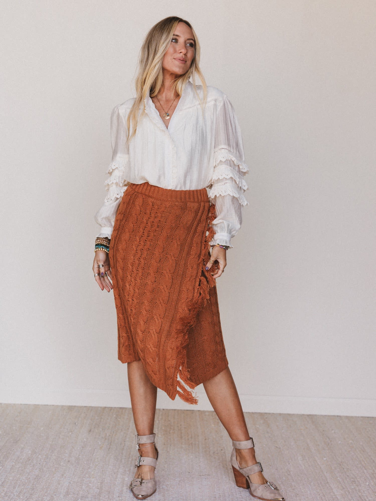 Style it with a ruffled blouse or fitted mock neck for a look that’s both polished and playful. From markets to mountains, this skirt brings the cozy wherever you go.