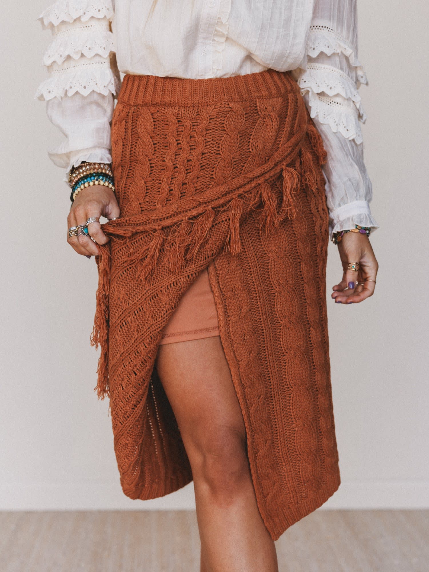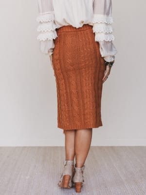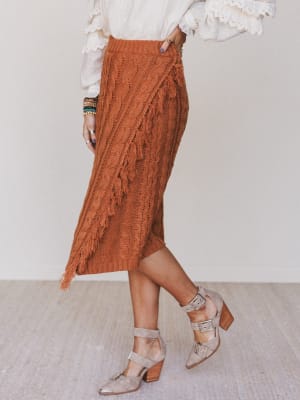 The Liz Midi Skirt is a cozy statement piece that blends texture, comfort, and serious autumn vibes. With chunky cable knit and playful fringe detailing, it's everything you love about your favorite sweater—reimagined as a curve-loving skirt.