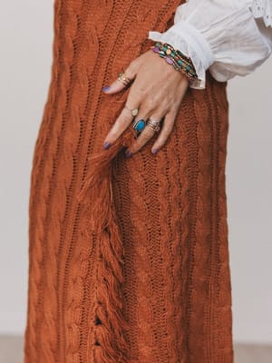 - Rich cinnamon hue with thick cable knit for that perfect fall feel