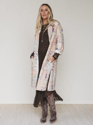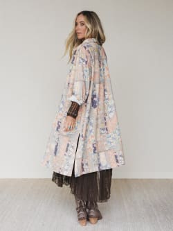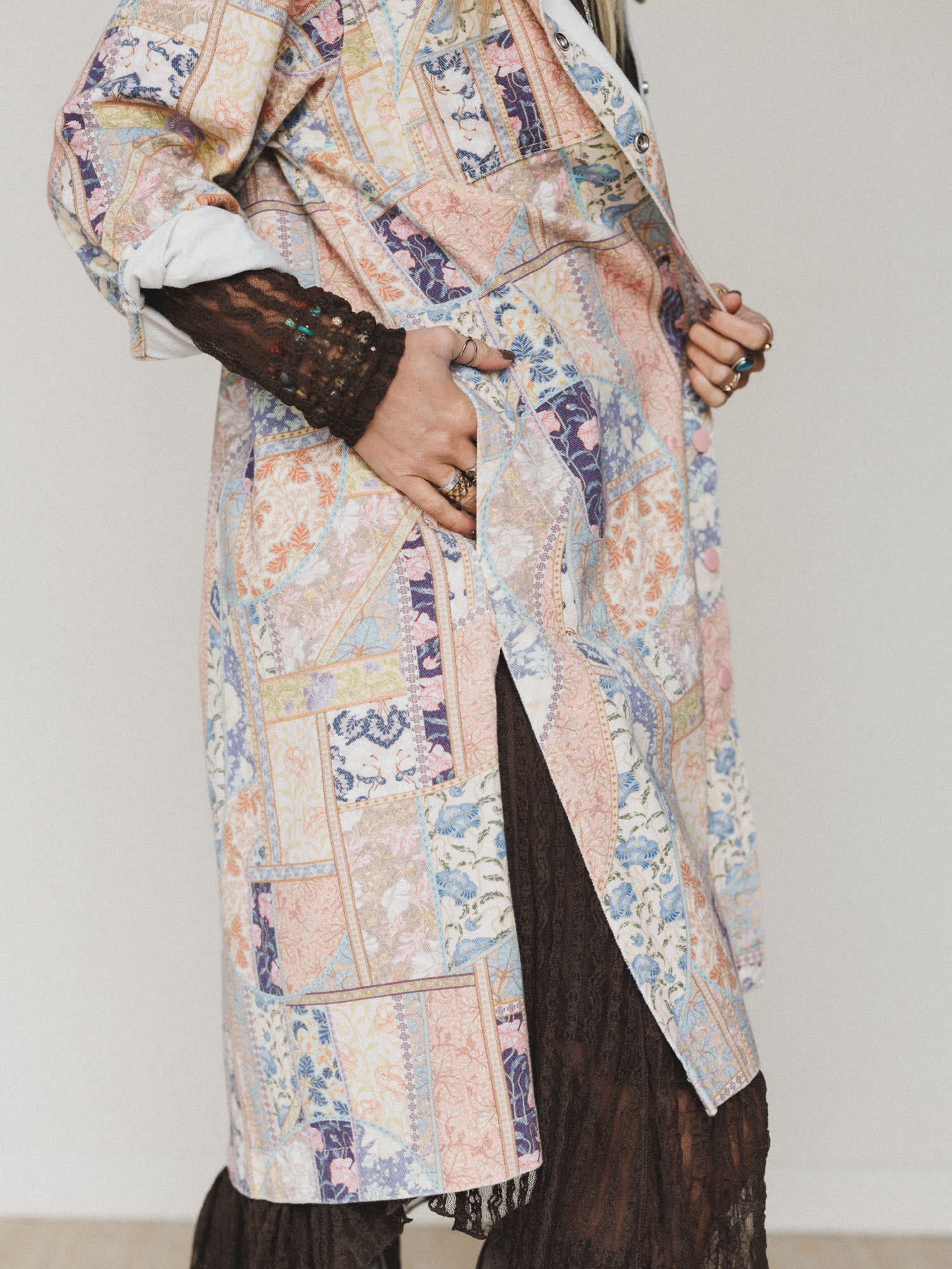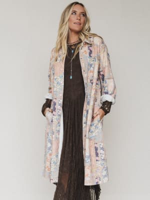 - Bloom Soft Jacket adds a dreamy patchwork print with soft pastel tones and a lightweight, duster-style fit