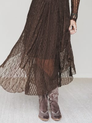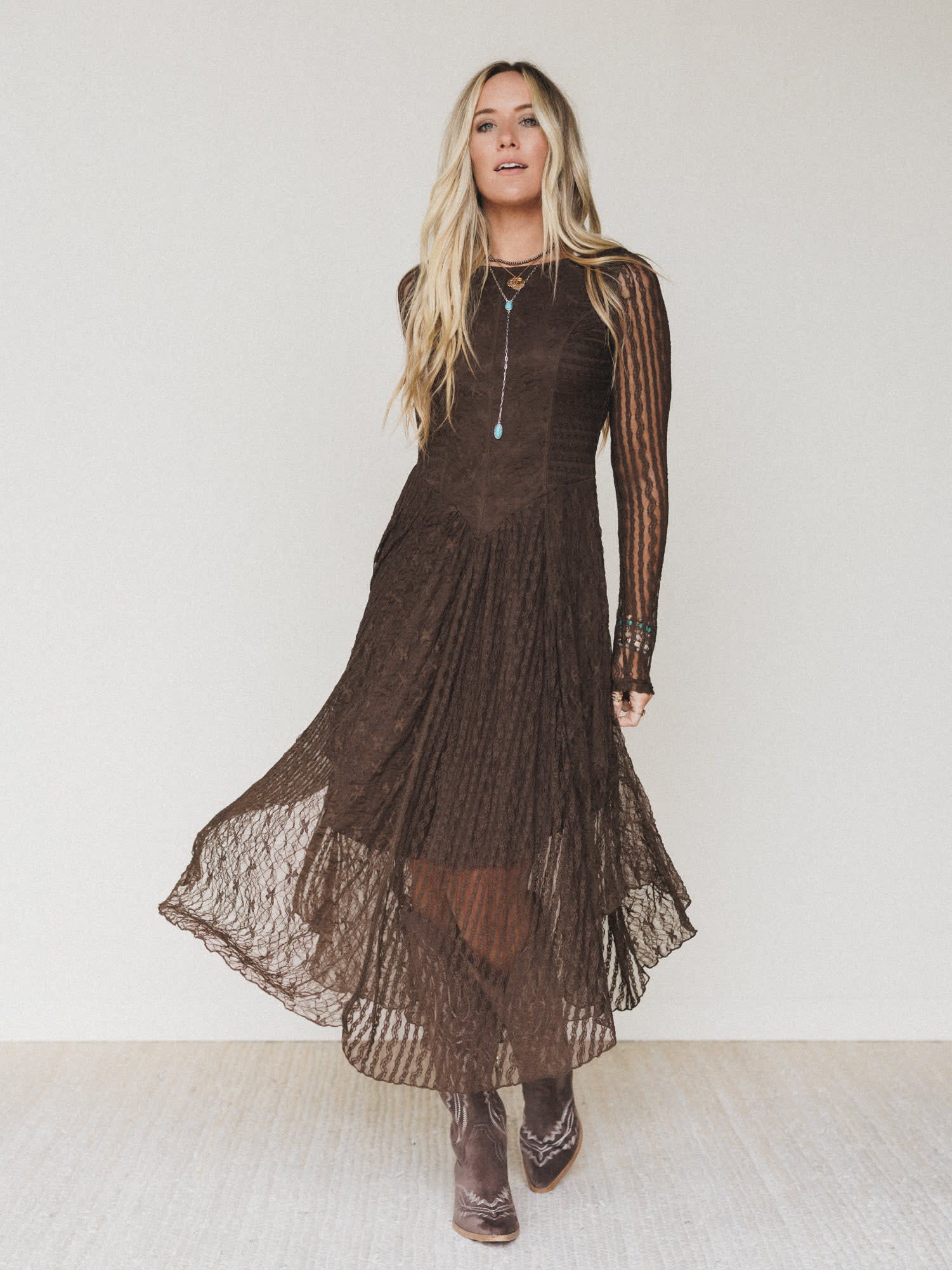 - Lace Story Dress features sheer long sleeves, a high-low hem, and a rich chocolate hue that sways with every step