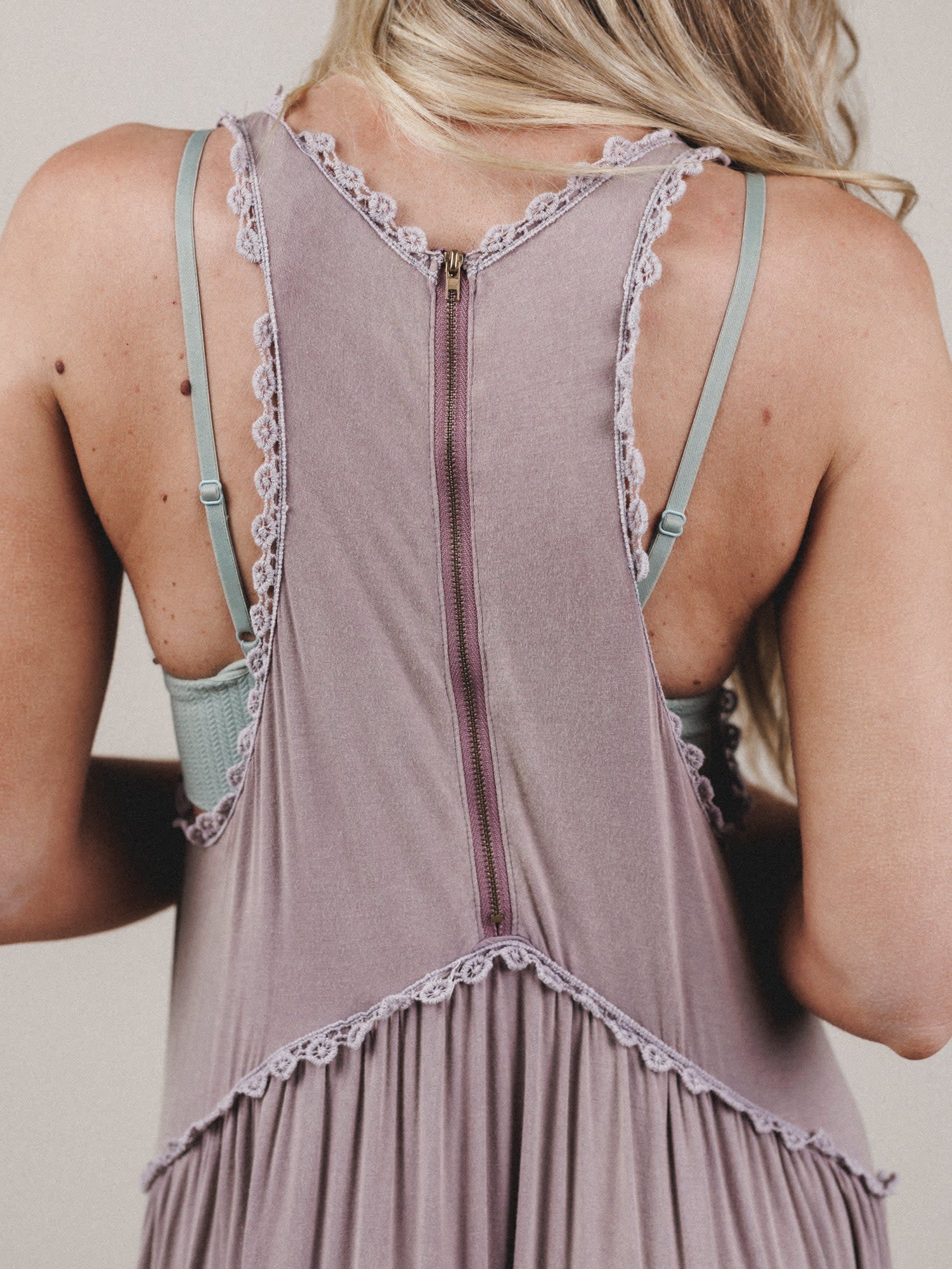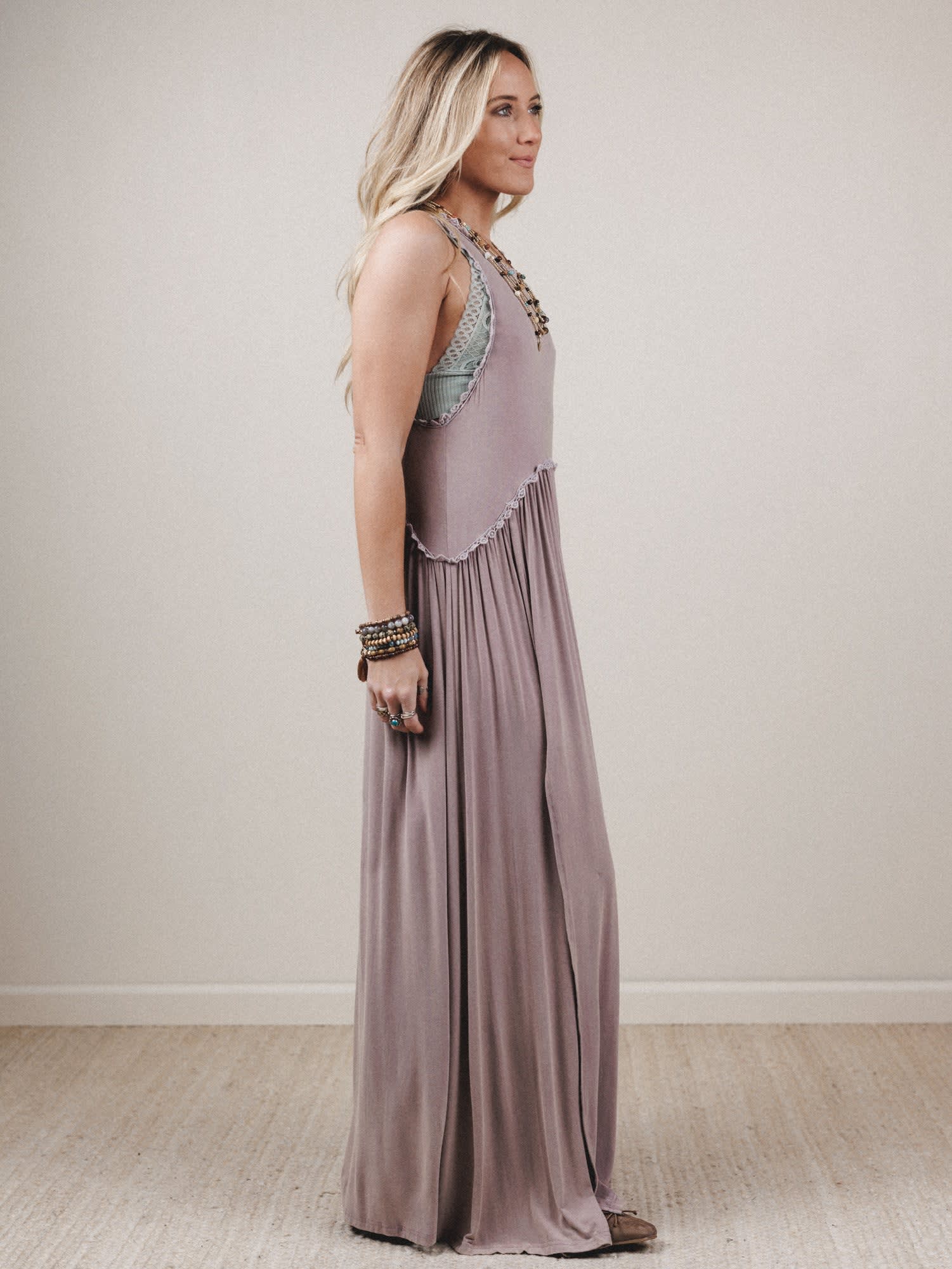 - Daisy Chain Maxi Dress – A soft, dusty mauve tank dress with lace trim, a high-low gathered waist, and a flirty front slit. It moves with every breeze and layers like a dream.