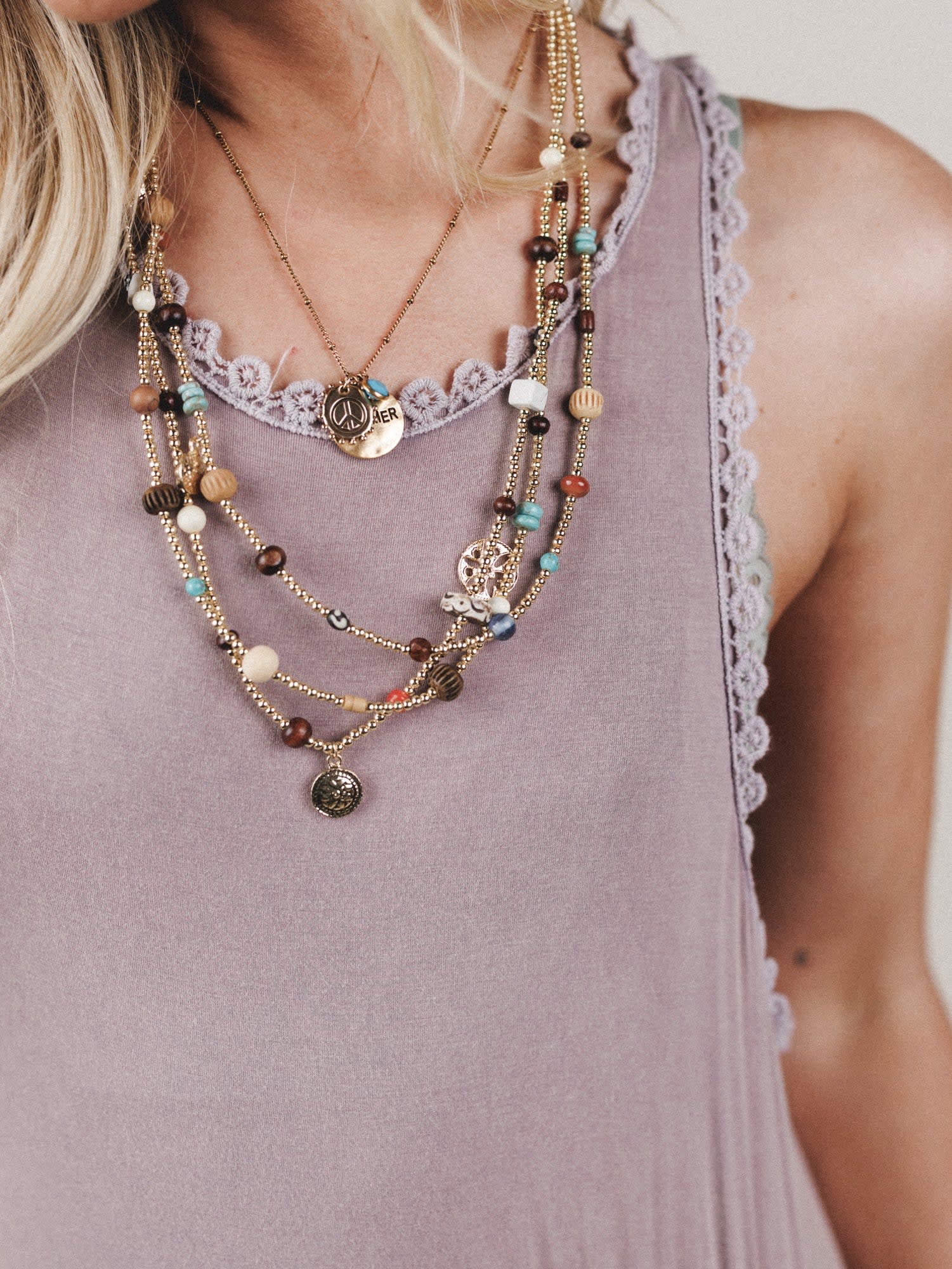 - Lost And Found Layered Necklace – A multistrand, beaded necklace featuring a mix of earthy tones, tiny charms, and worn gold accents—your new go-to for layering or wearing solo.