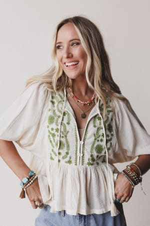 This babydoll top pairs perfectly with light wash wide leg jeans and booties for a polished yet casual look.