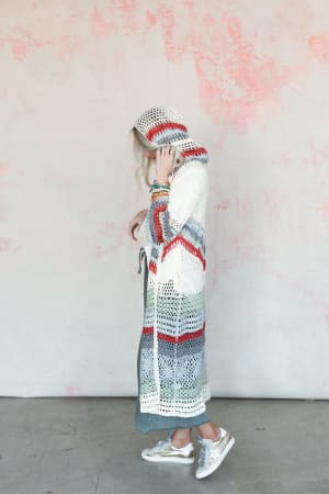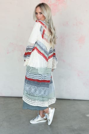 This duster-length cardigan is knitted to perfection with soft, spongy yarn in open weave for a rich touchable texture. The beautiful pallet of neutrals has pretty pops of color in rows with angled accents and a touch of floral knit. With bell sleeves, a draped hood, and softly scalloped edges--this open-front layer embraces your fresh, bohemian style.