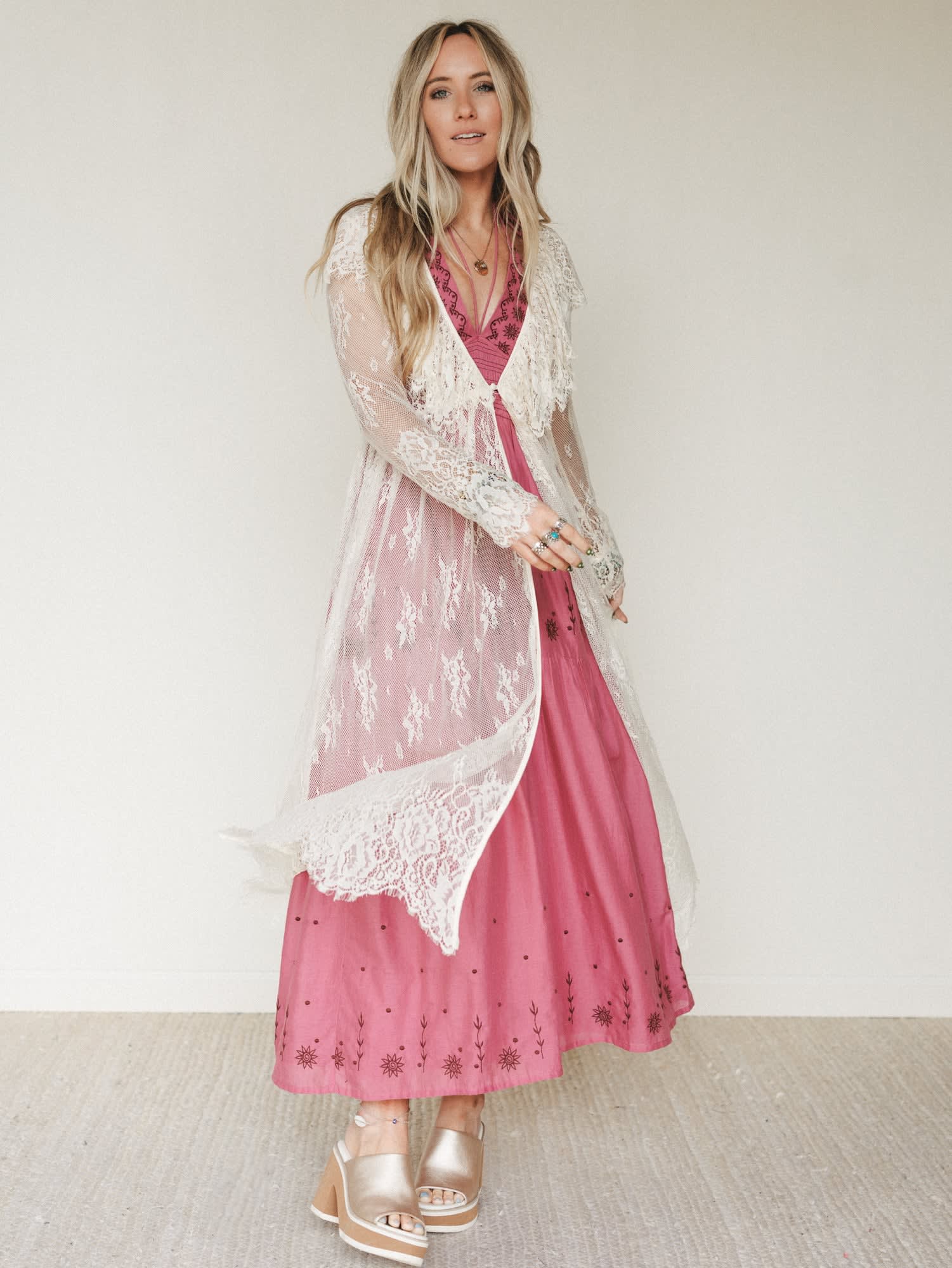 The kind of piece you’ll reach for when you want to elevate a simple outfit into something dreamy—think the perfect layer for a festival outfit or sunset dinner by the water. The Love Letters Baroque Lace Duster brings romantic cream lace and flowing movement to any boho look.