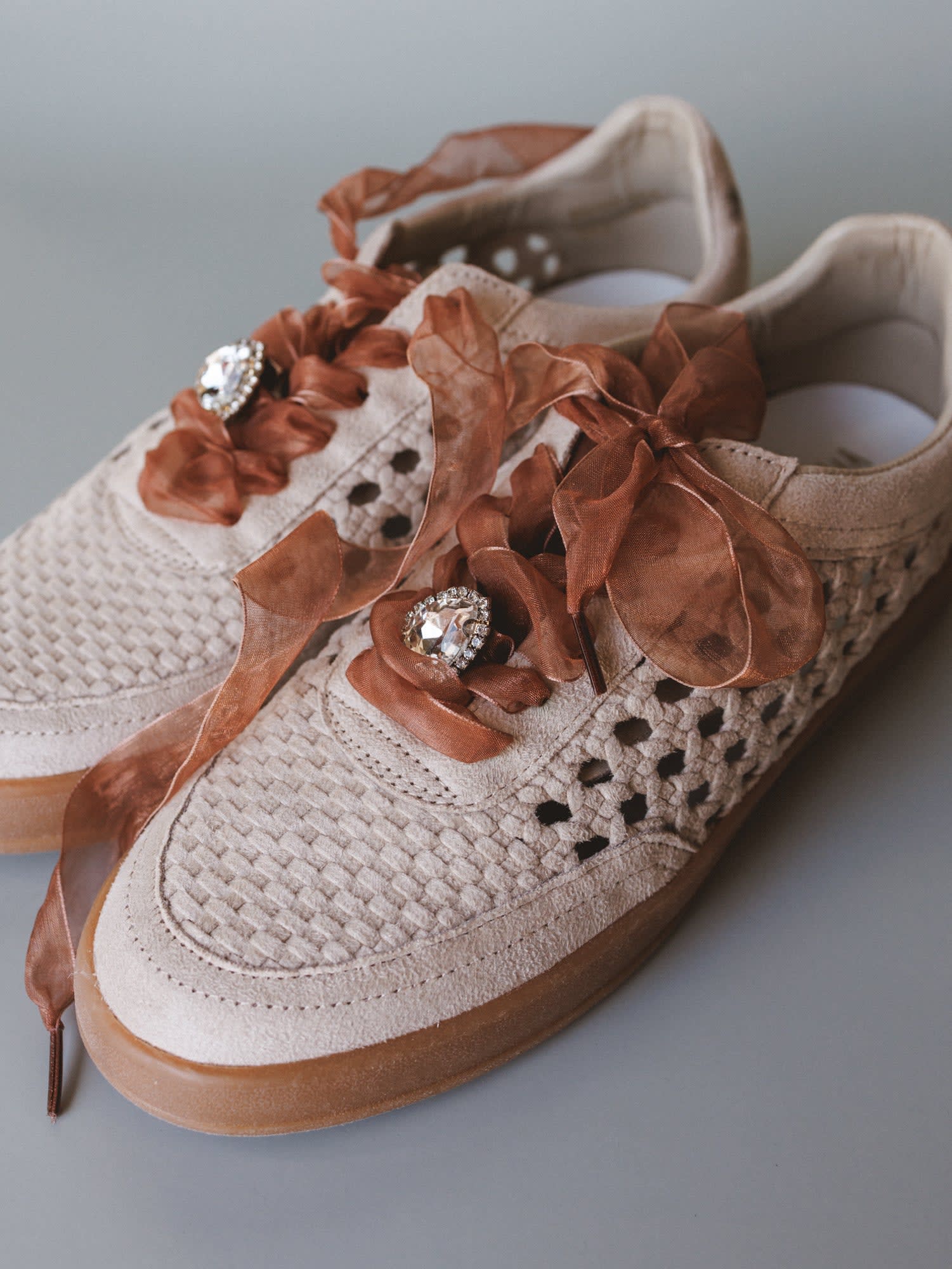 Soft neutral sneakers with a woven textured upper for a unique look