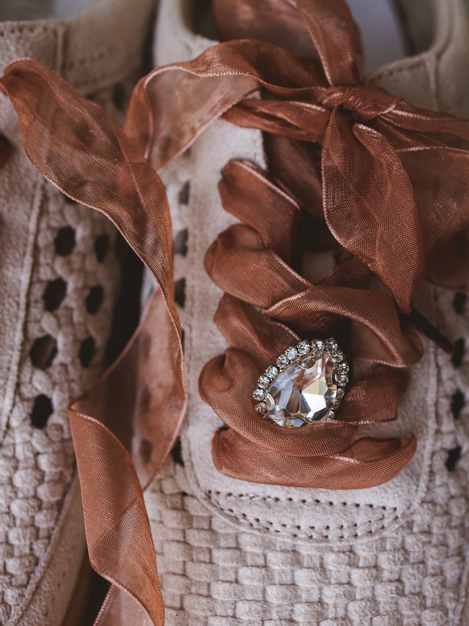 Sheer ribbon laces with jeweled accents add a feminine, vintage-inspired touch