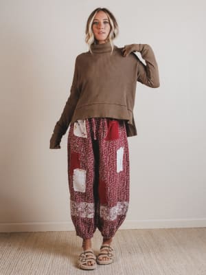 - Pairs perfectly with patchwork pants, denim, or leggings