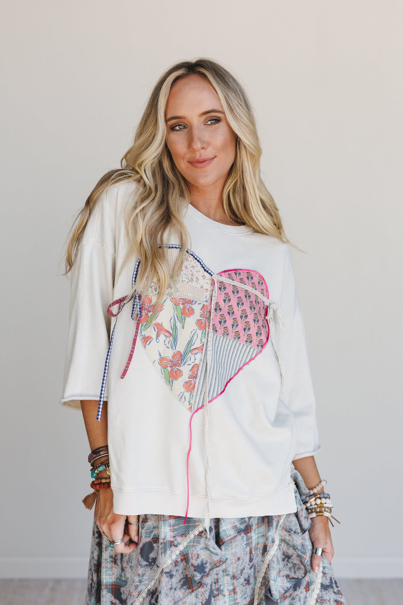 Whimsy meets nostalgia in the most heartwarming way. The Love Ties Mix Print Top is a sweet throwback to patchwork days and handmade love—perfect for cozy hangs or styling up with a flirty skirt.