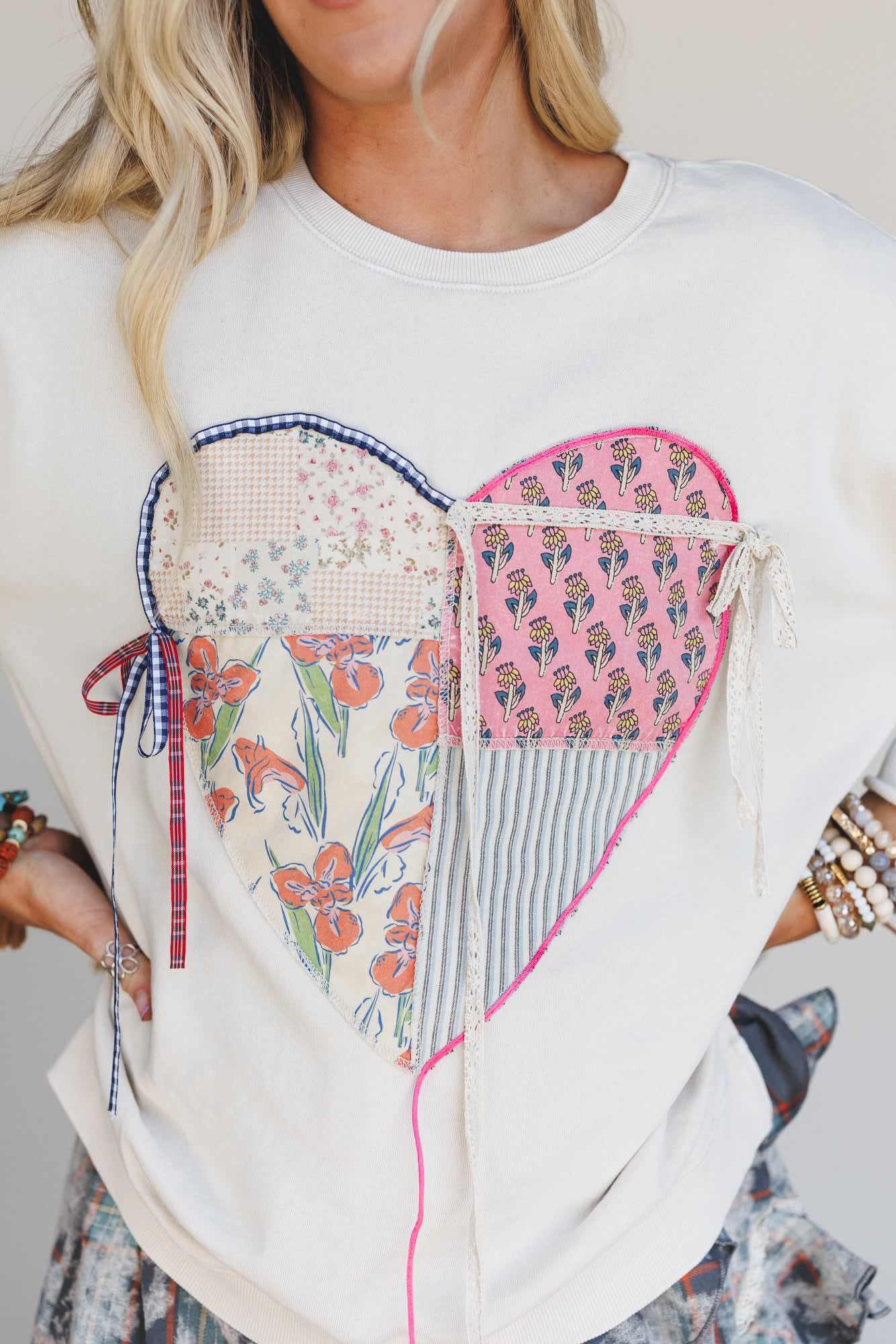 • Oversized heart patchwork detail with mixed floral + stripe prints