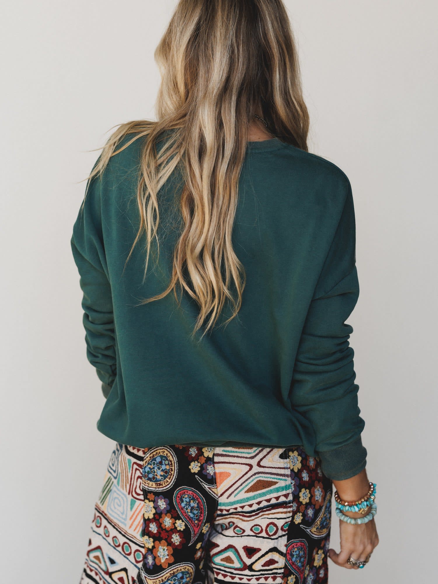 - Forest green graphic sweatshirt featuring the Lucky Lady Sweatshirt with an oversized horseshoe design and relaxed fit