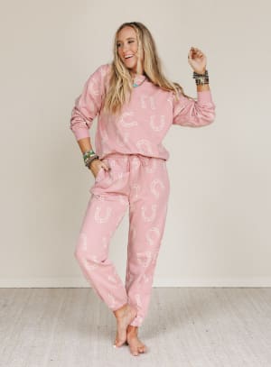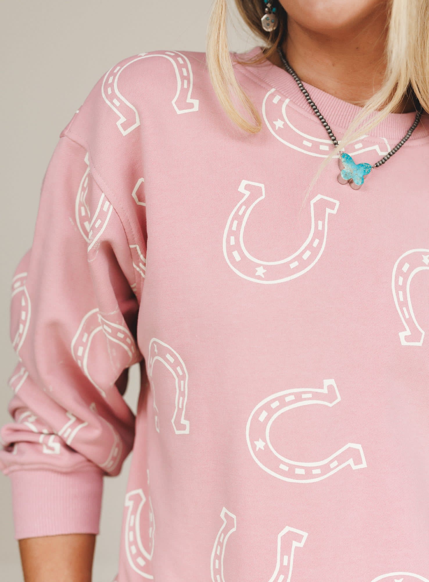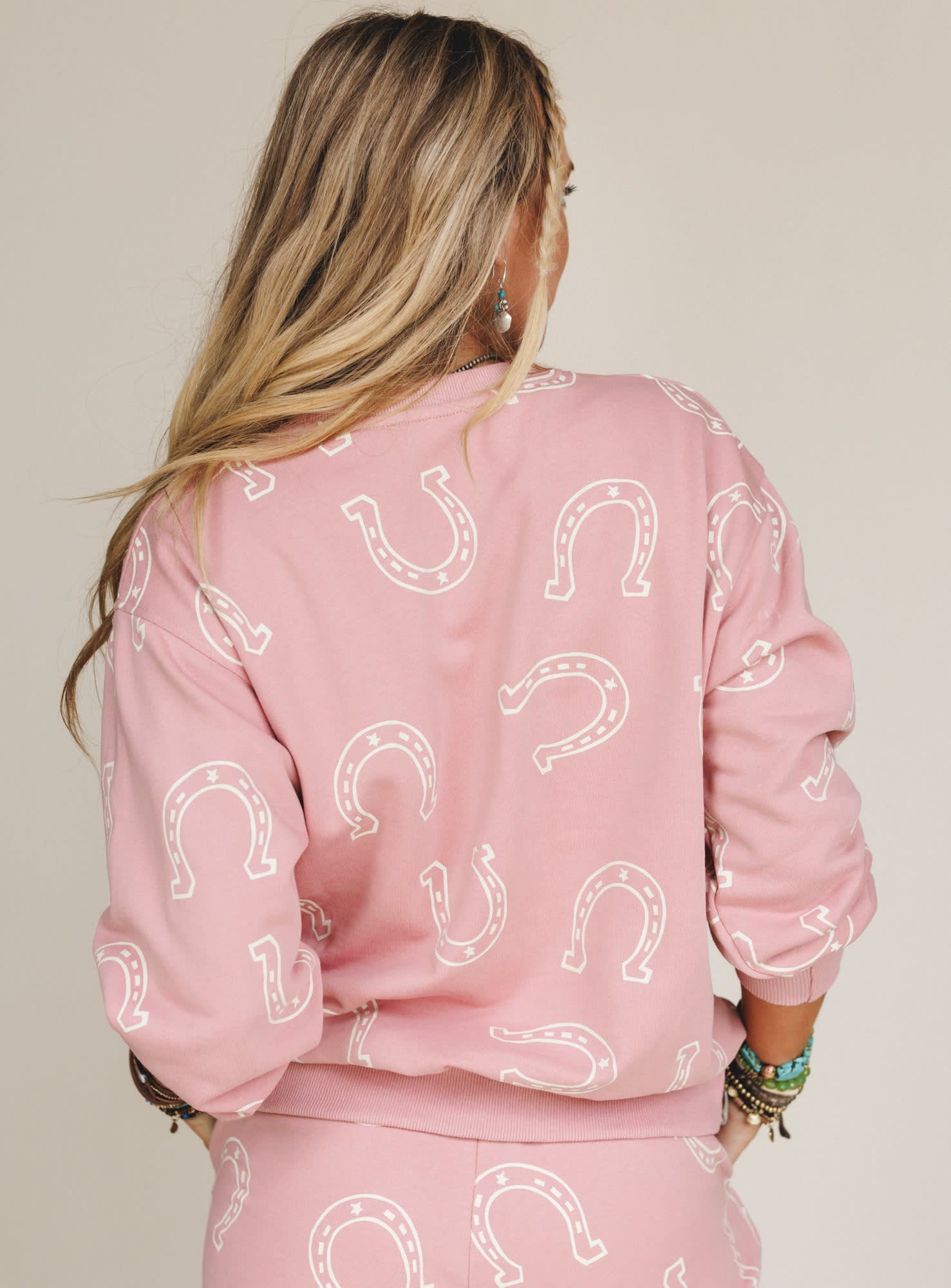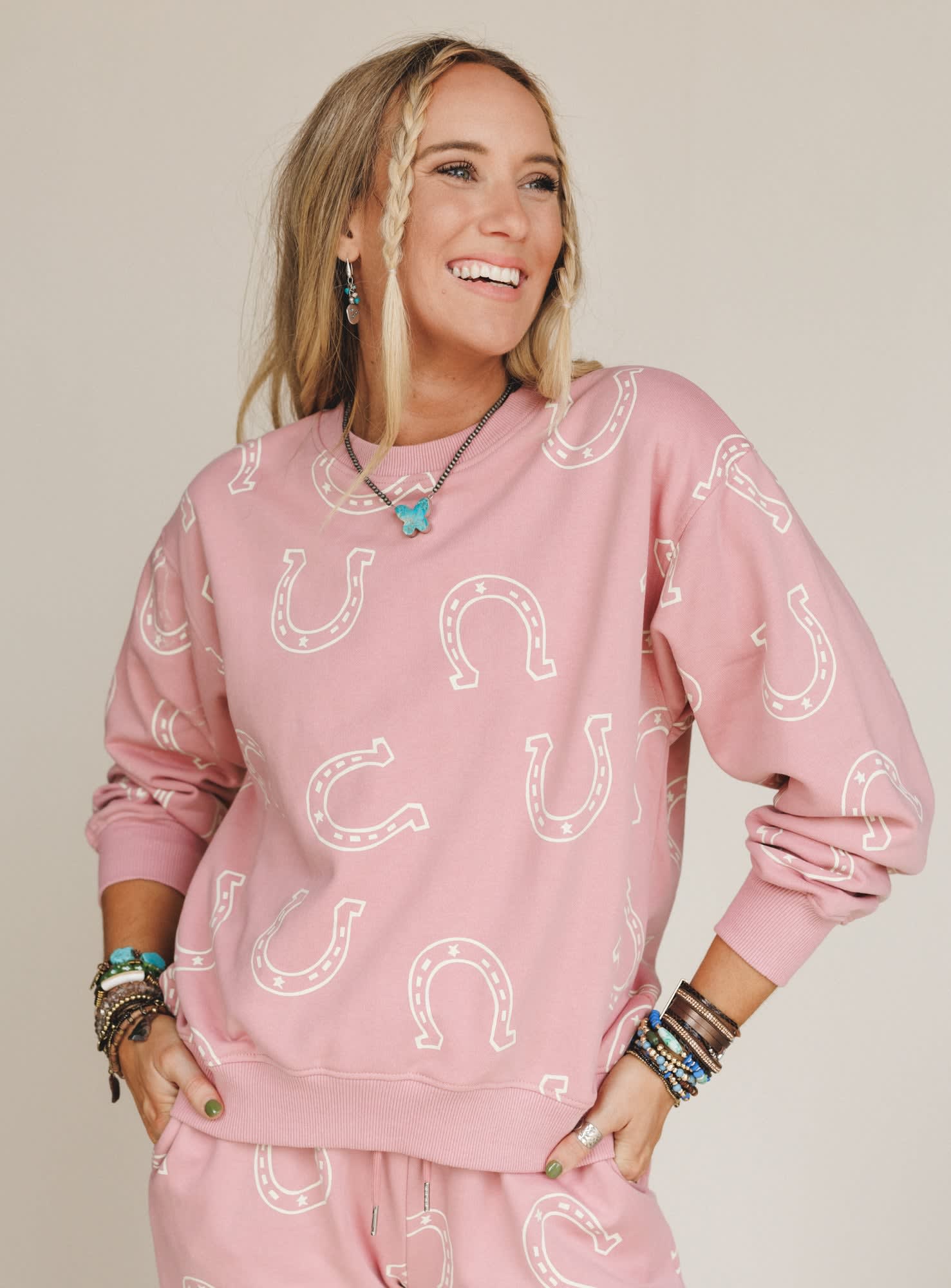 Get ready to manifest all the good vibes in this cozy-meets-cute sweatshirt. The Lucky Range Sweatshirt brings playful charm to your casual lineup with its pink hue and allover horseshoe print—because a little extra luck never hurts.