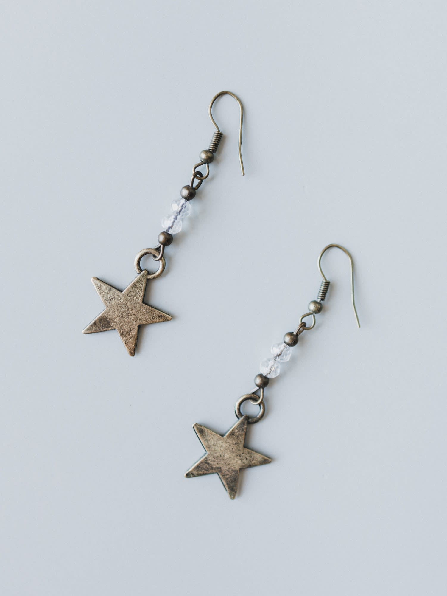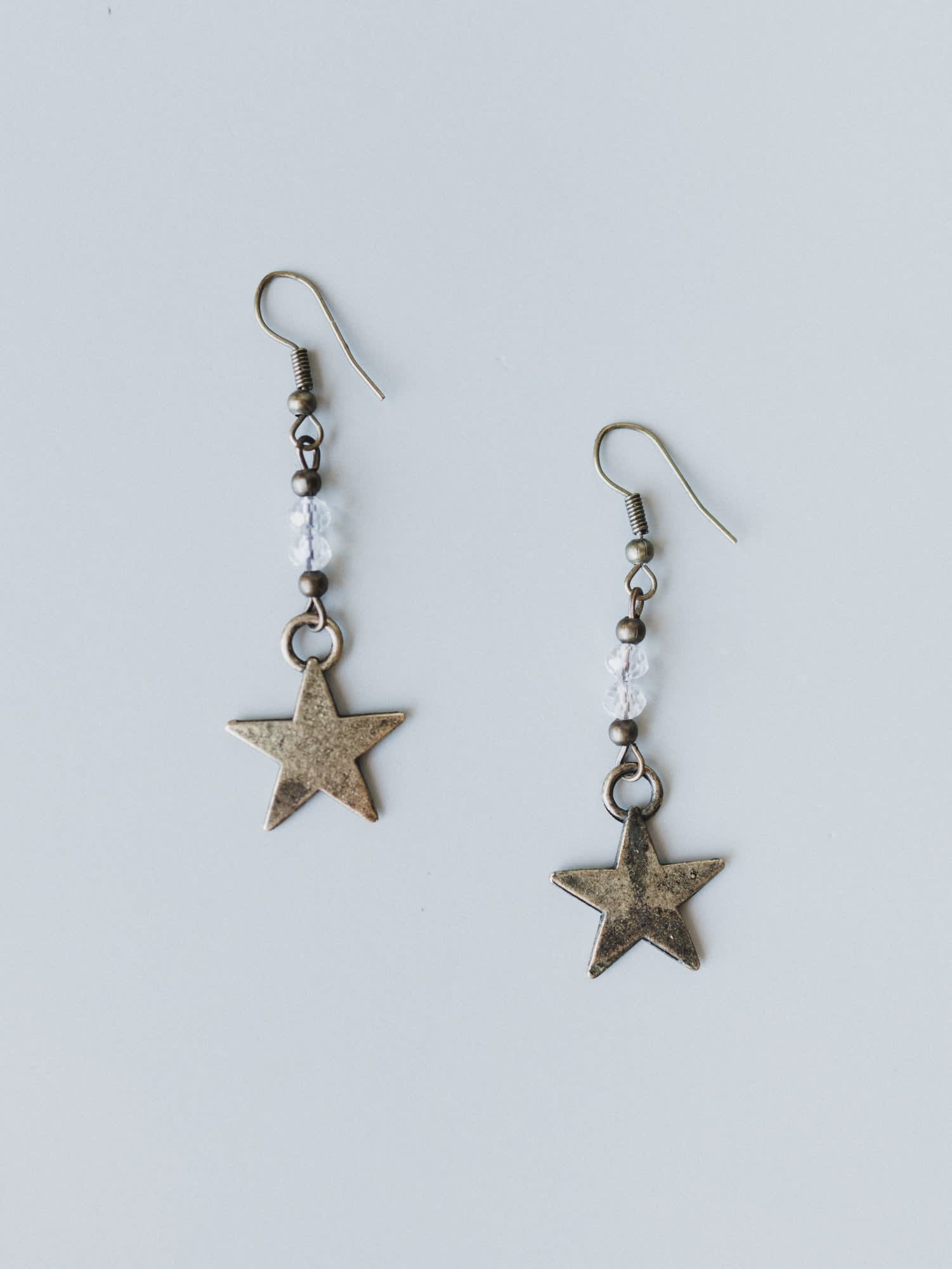 - Features an antiqued brass star charm suspended from a delicate wire hook with a small faceted clear crystal bead accent for a touch of subtle sparkle.
