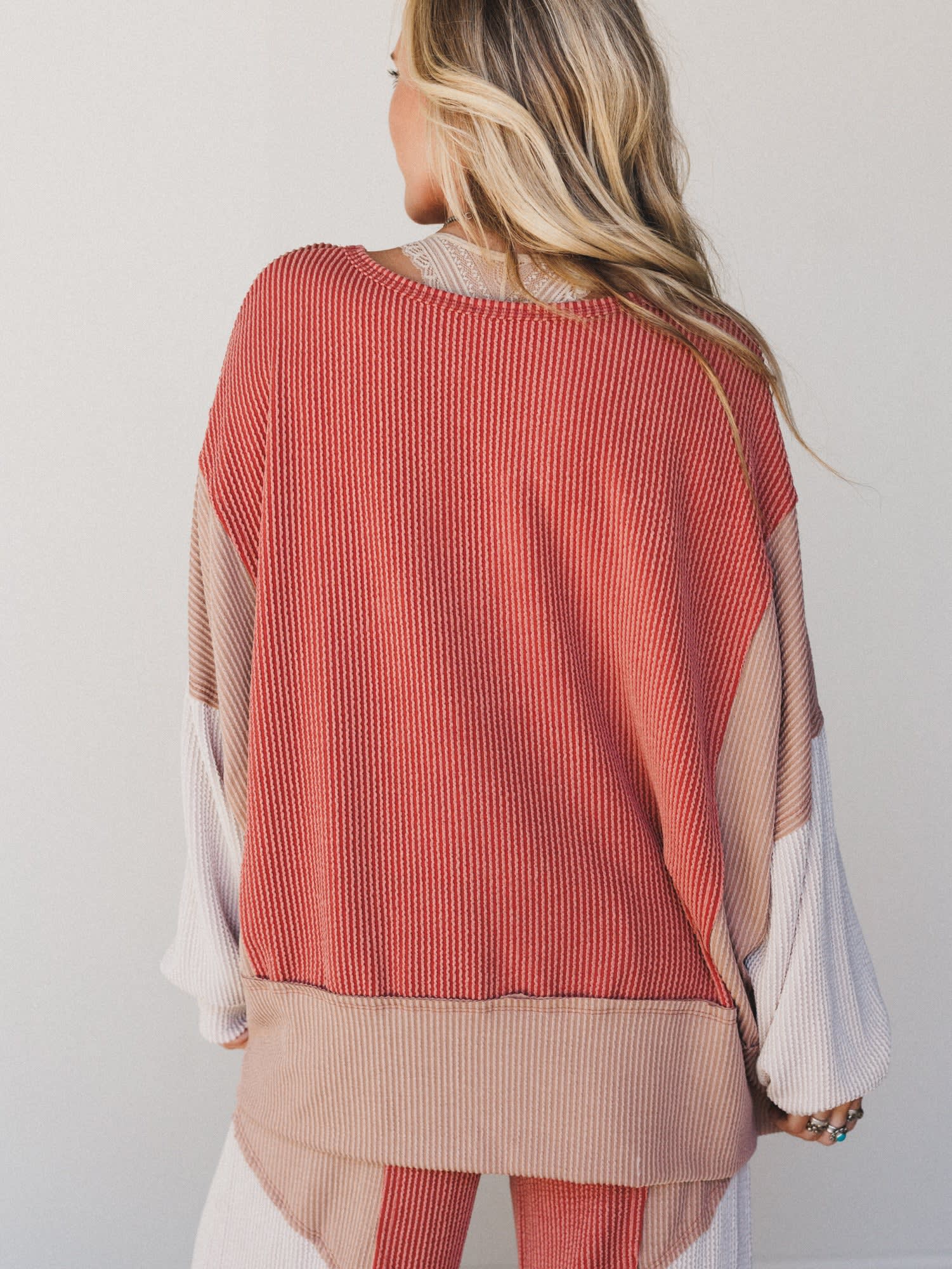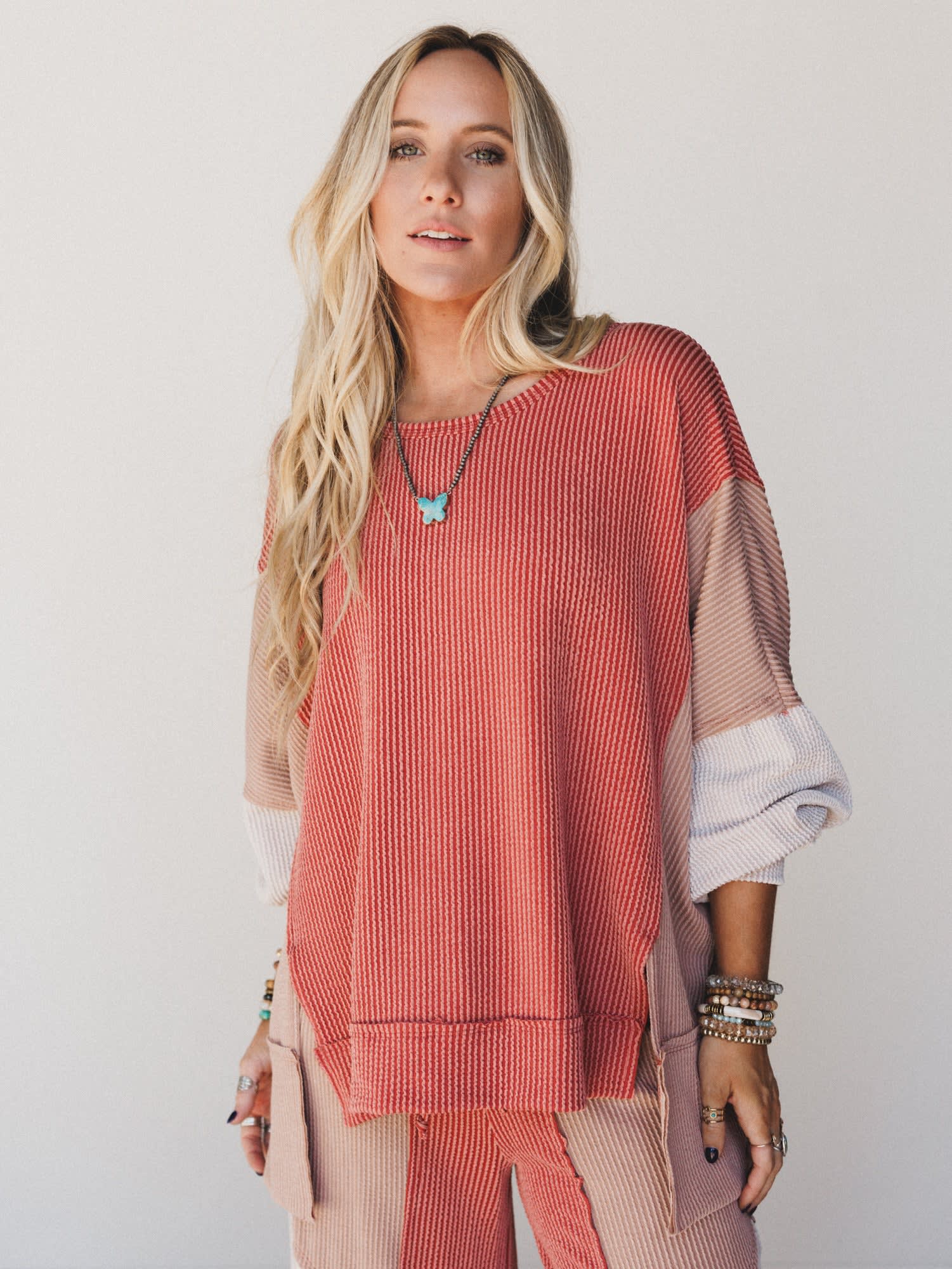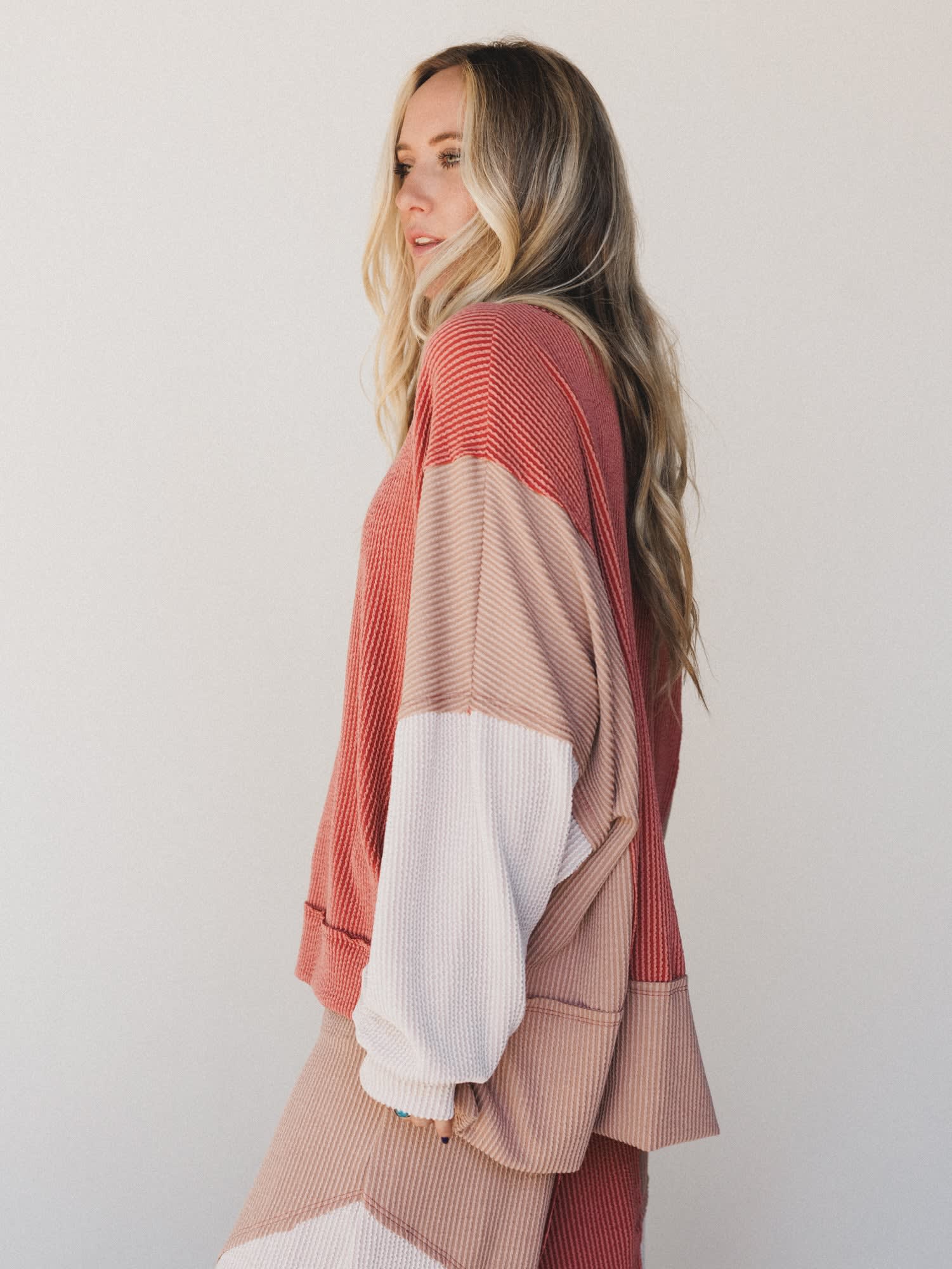 - Made to Love Color Block Top – Oversized and oh-so comfy, this waffle knit pullover features a dreamy mix of mauve, blush, and ivory in an easygoing silhouette.