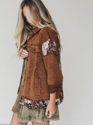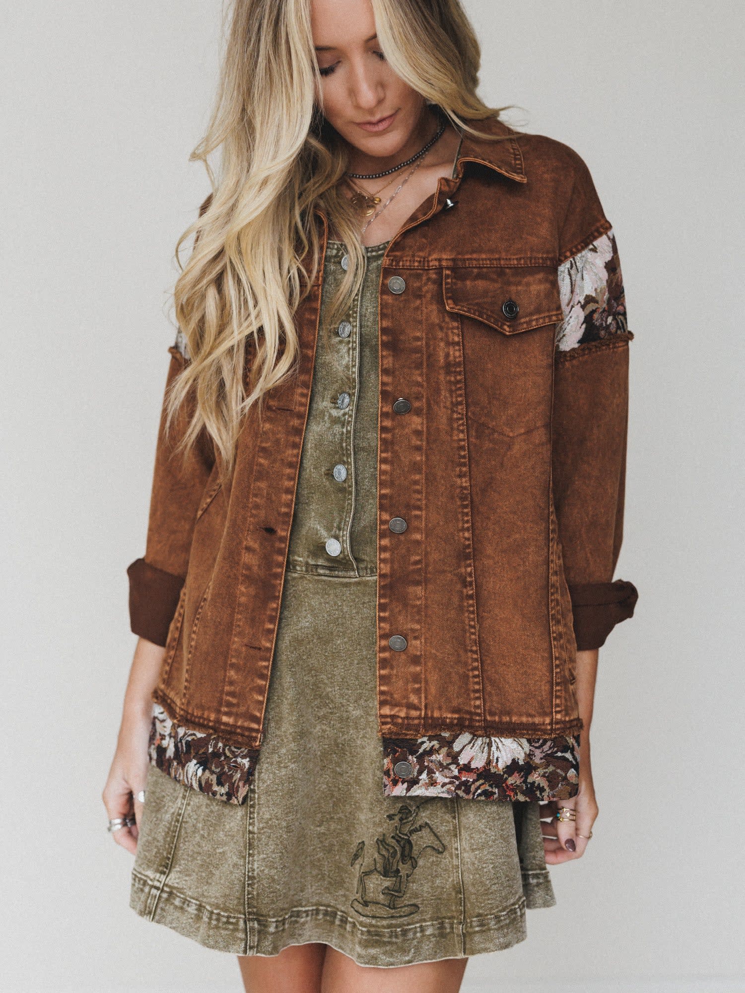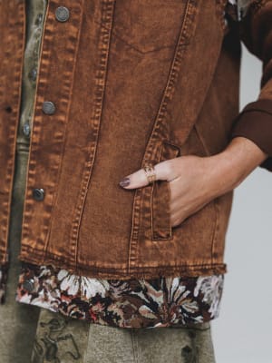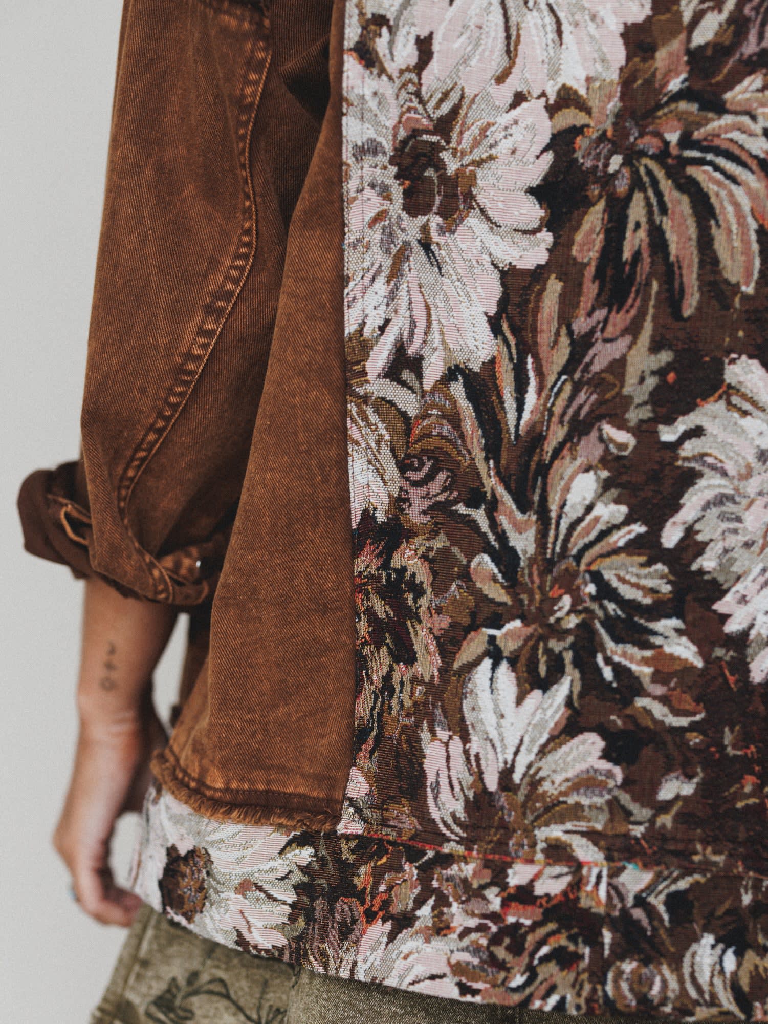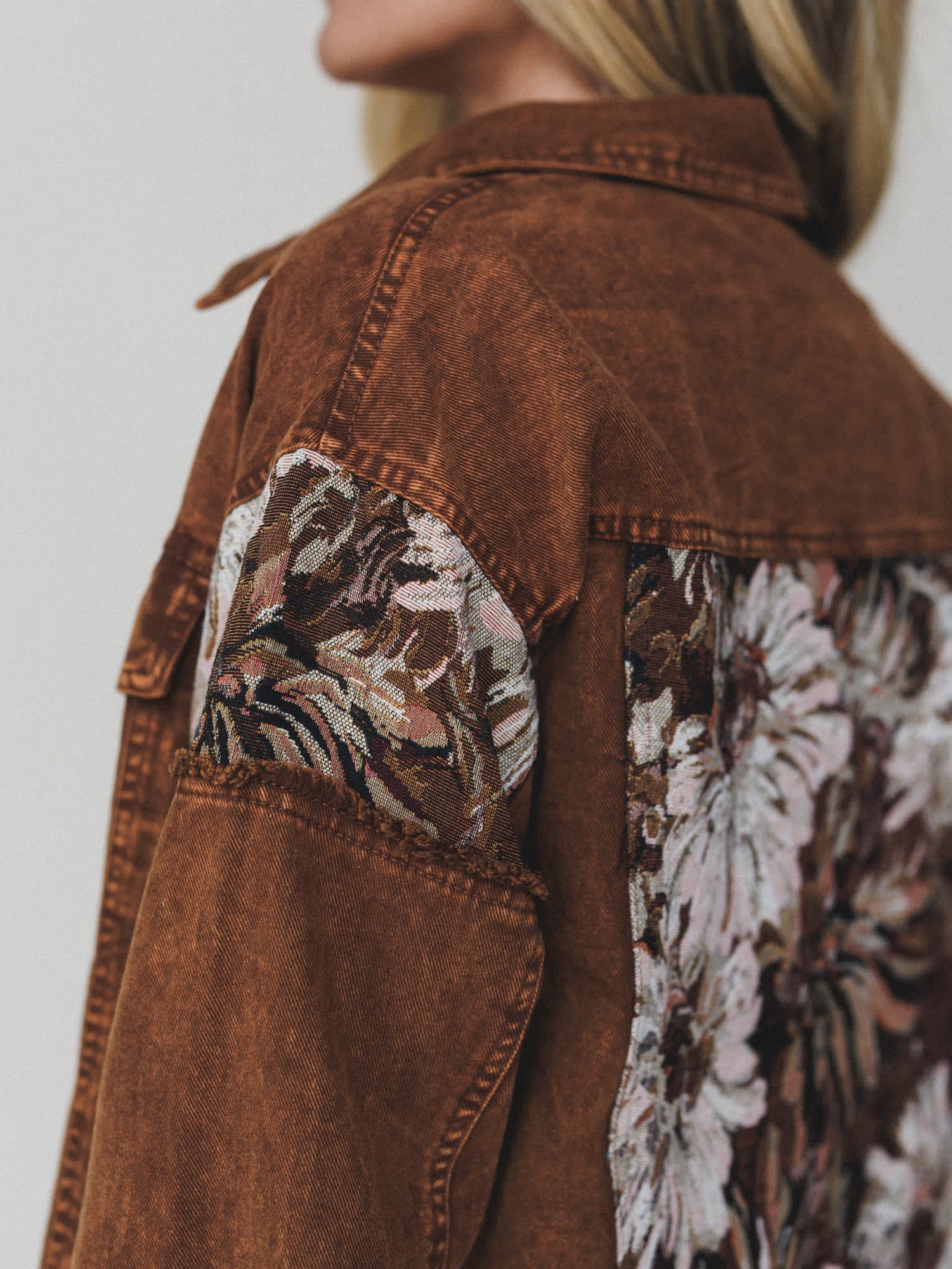 • Rich rust-washed denim with floral tapestry paneling for a vintage-meets-boho vibe