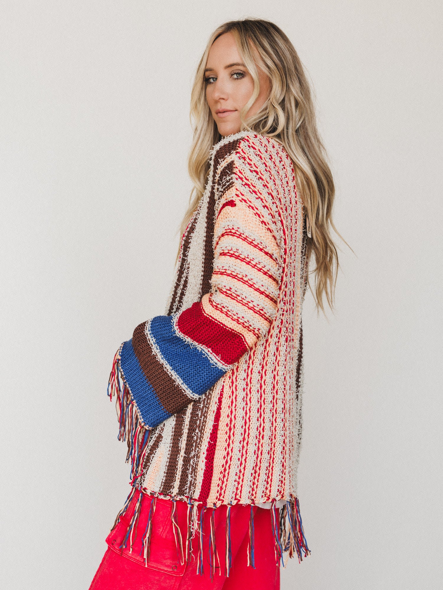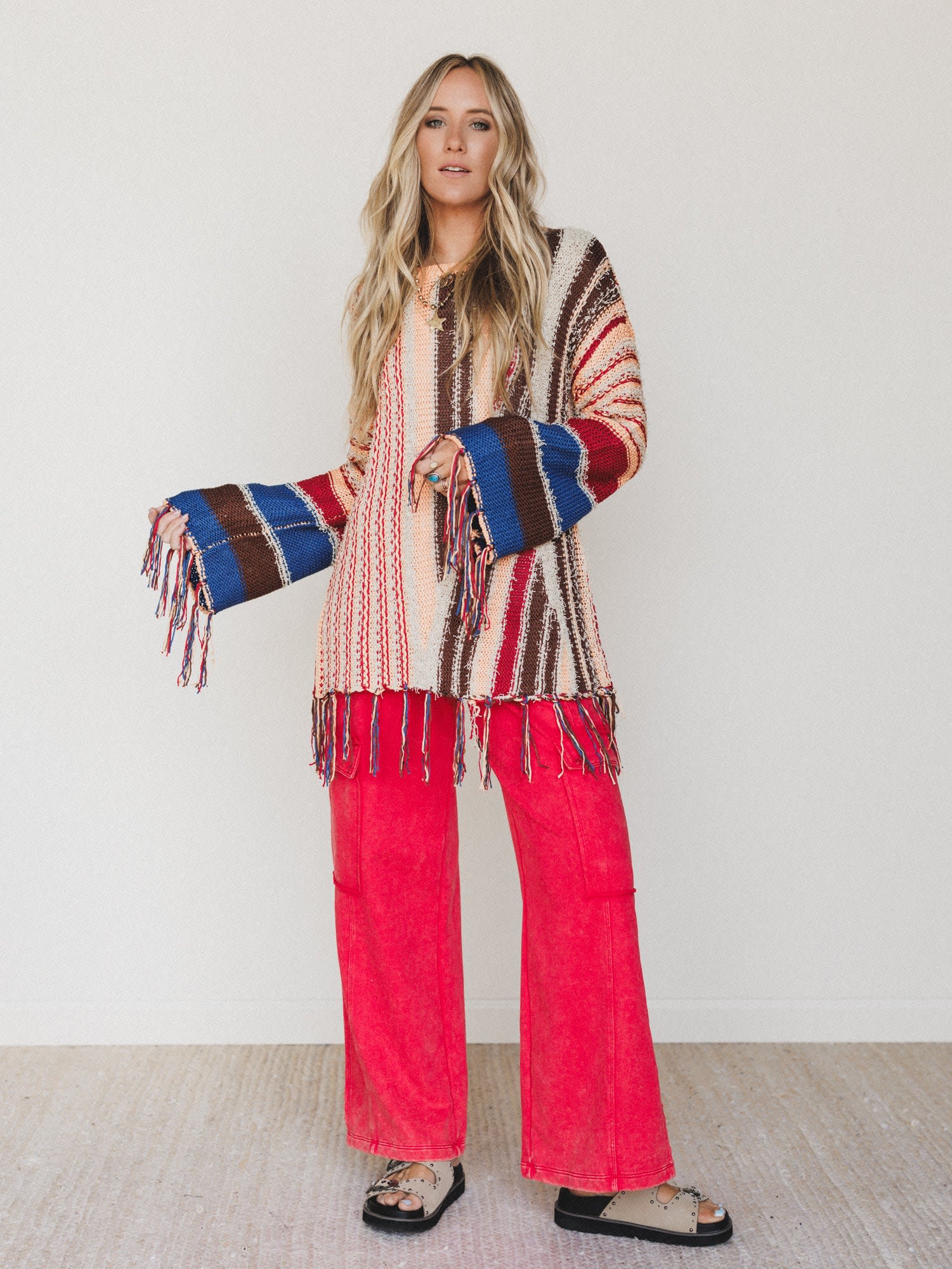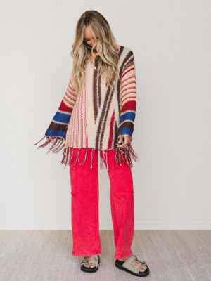 - Pastel Melodies Sweater features a relaxed fit with mixed stripe detailing and fringe accents for an artsy, boho layer.
