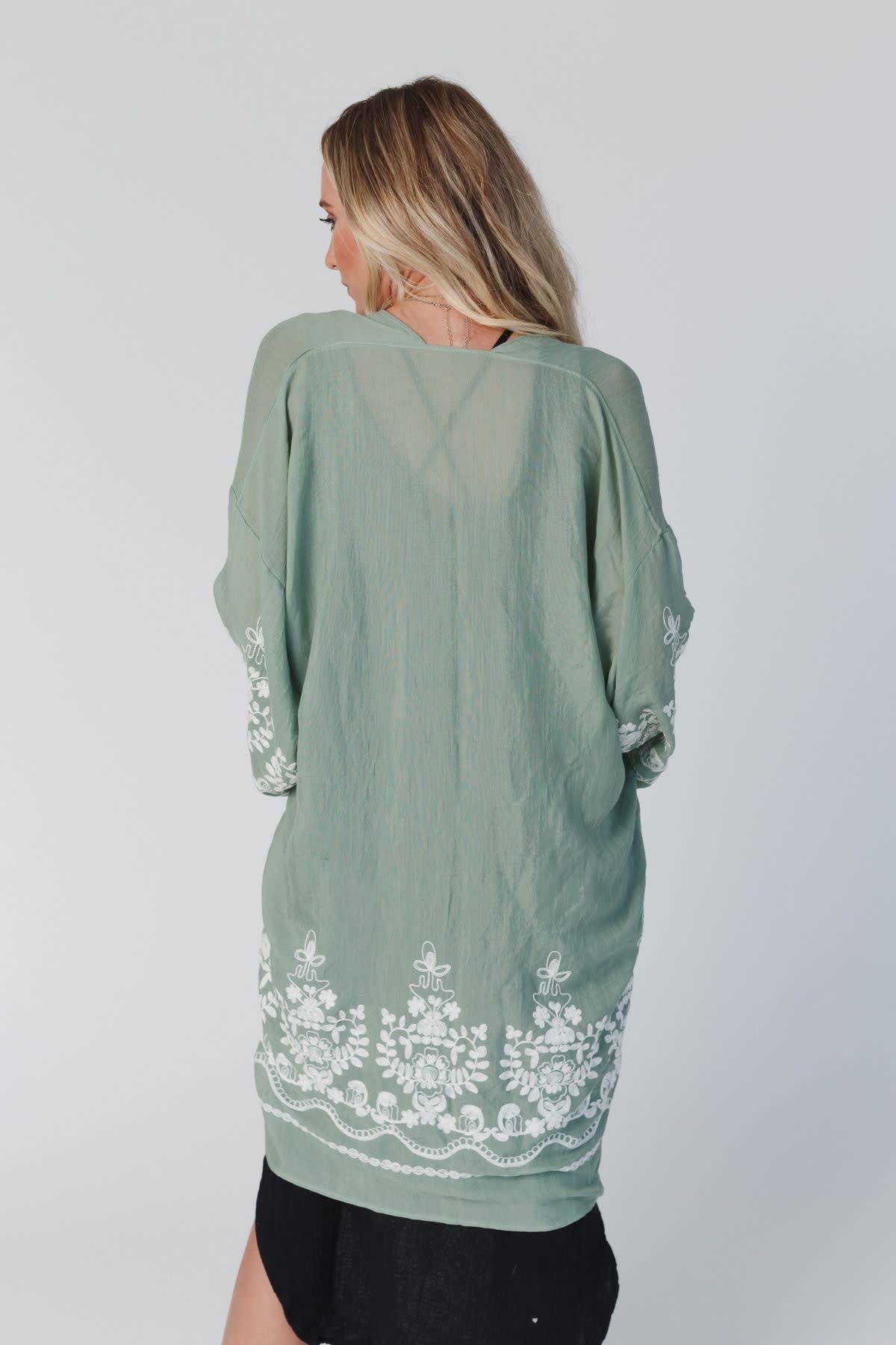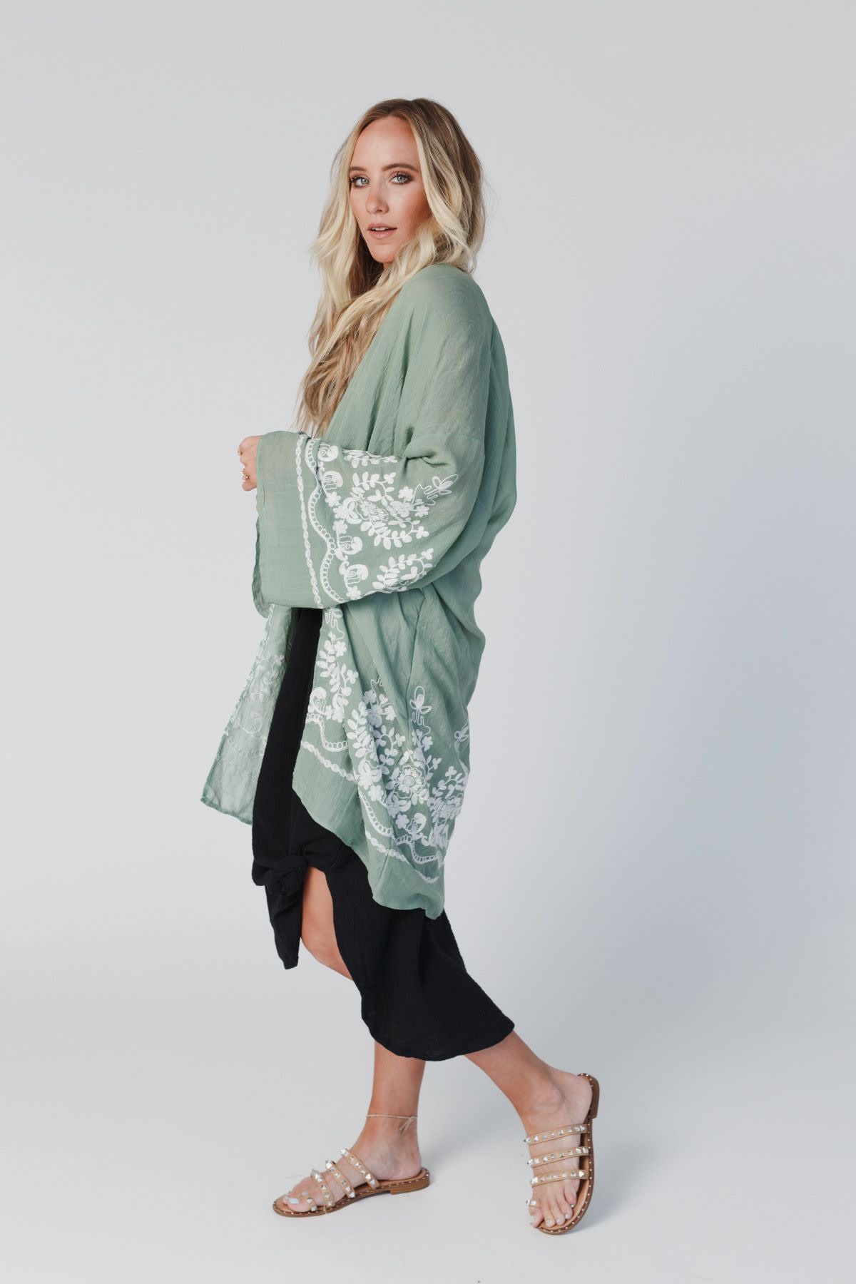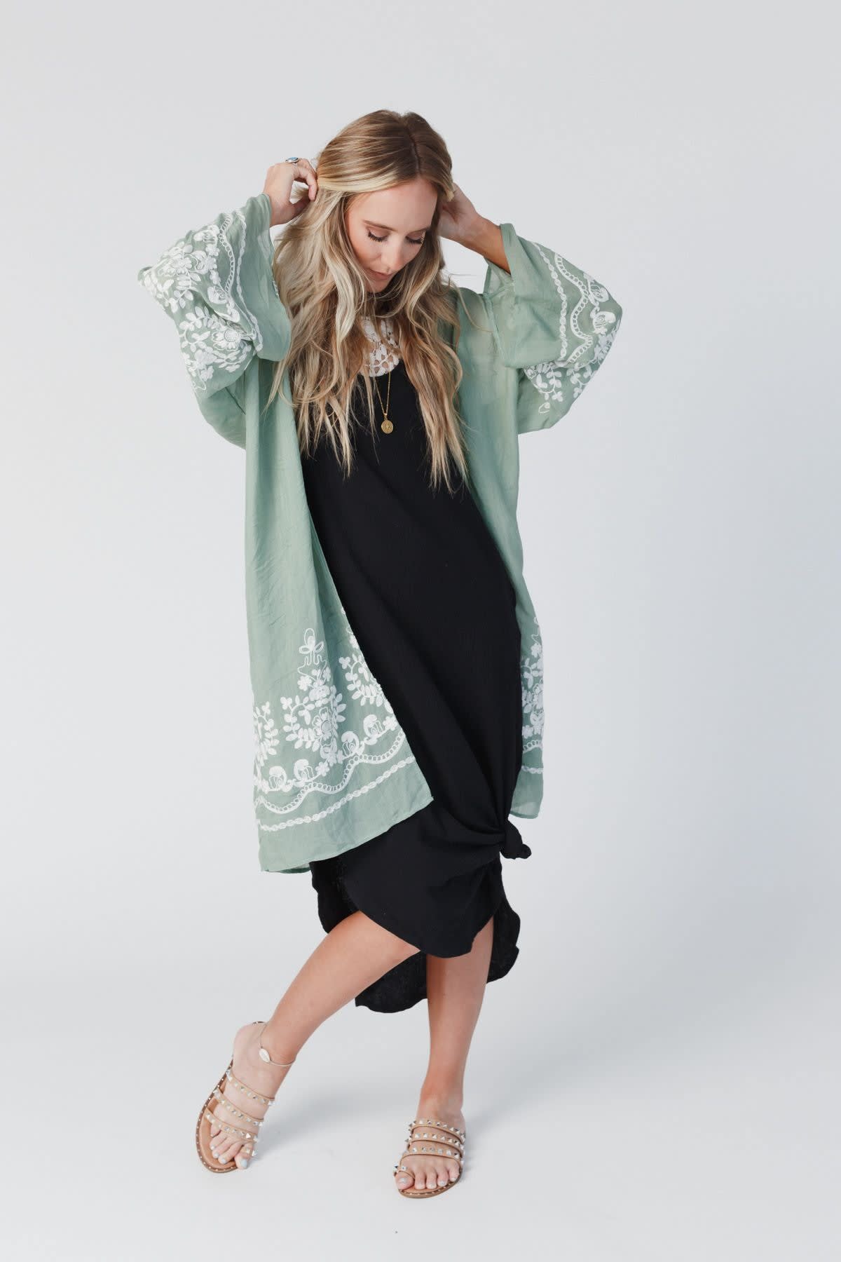 Delicate floral embroidery along the sleeves and hem for a soft, feminine detail