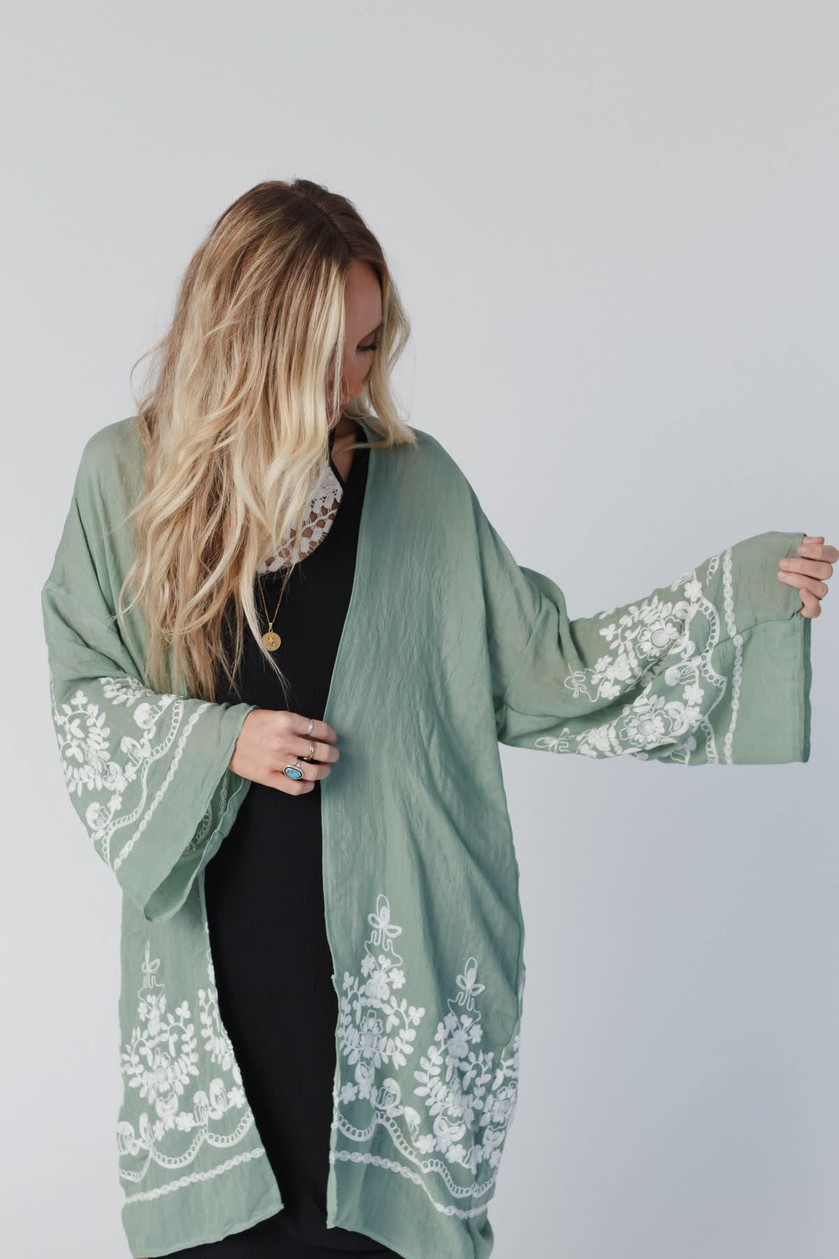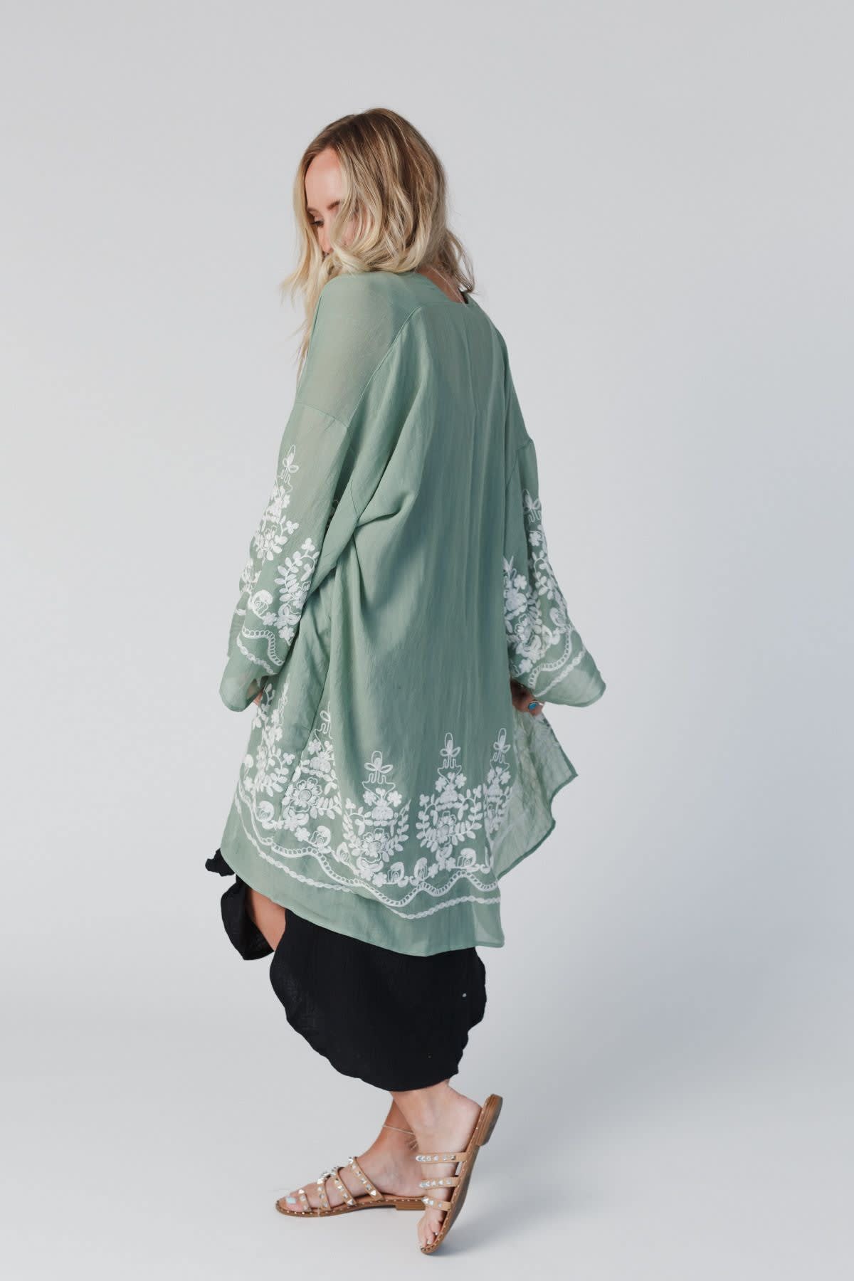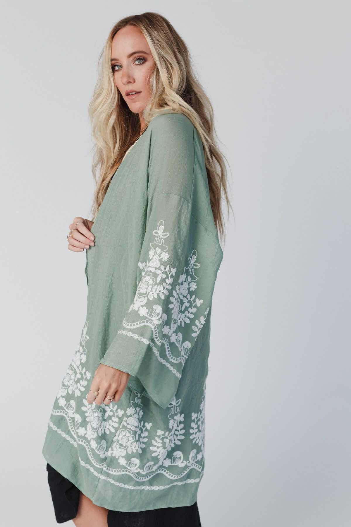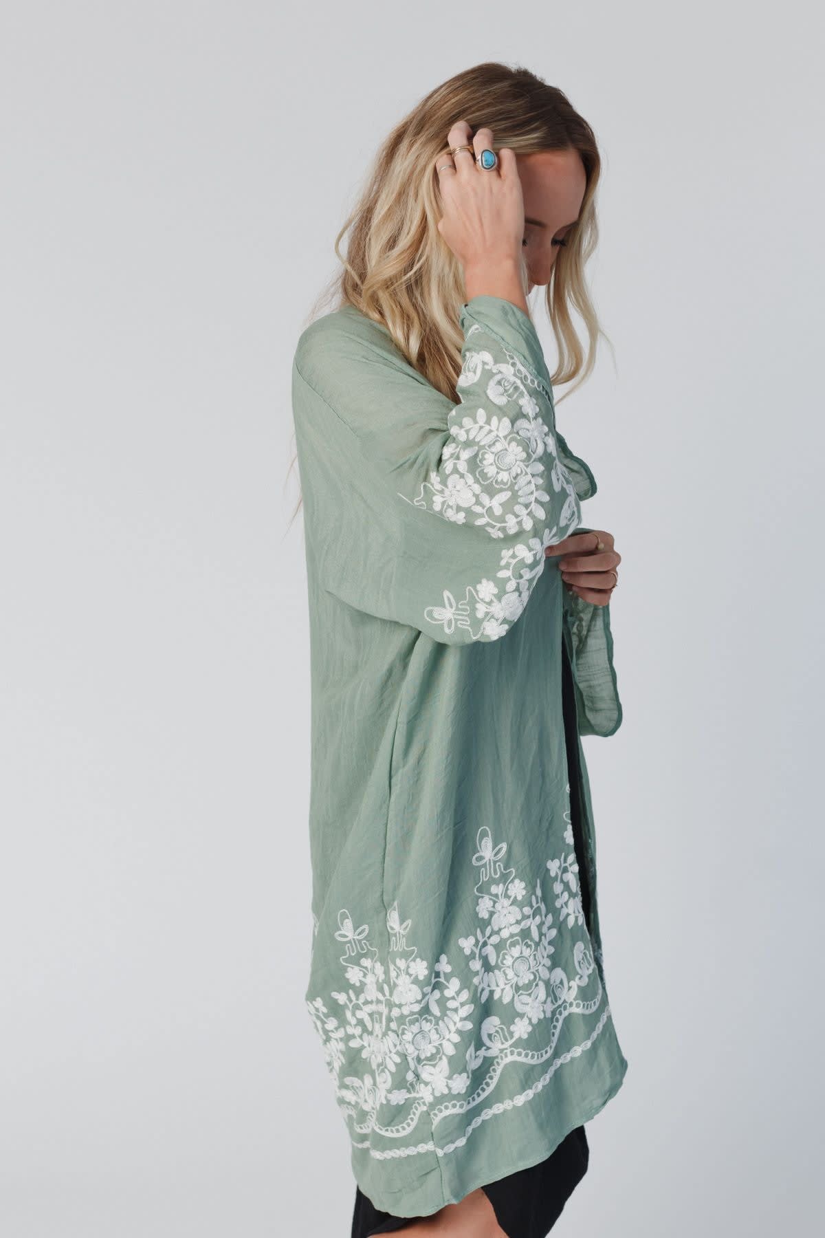 Delicate floral embroidery along the sleeves and hem for a soft, feminine detail